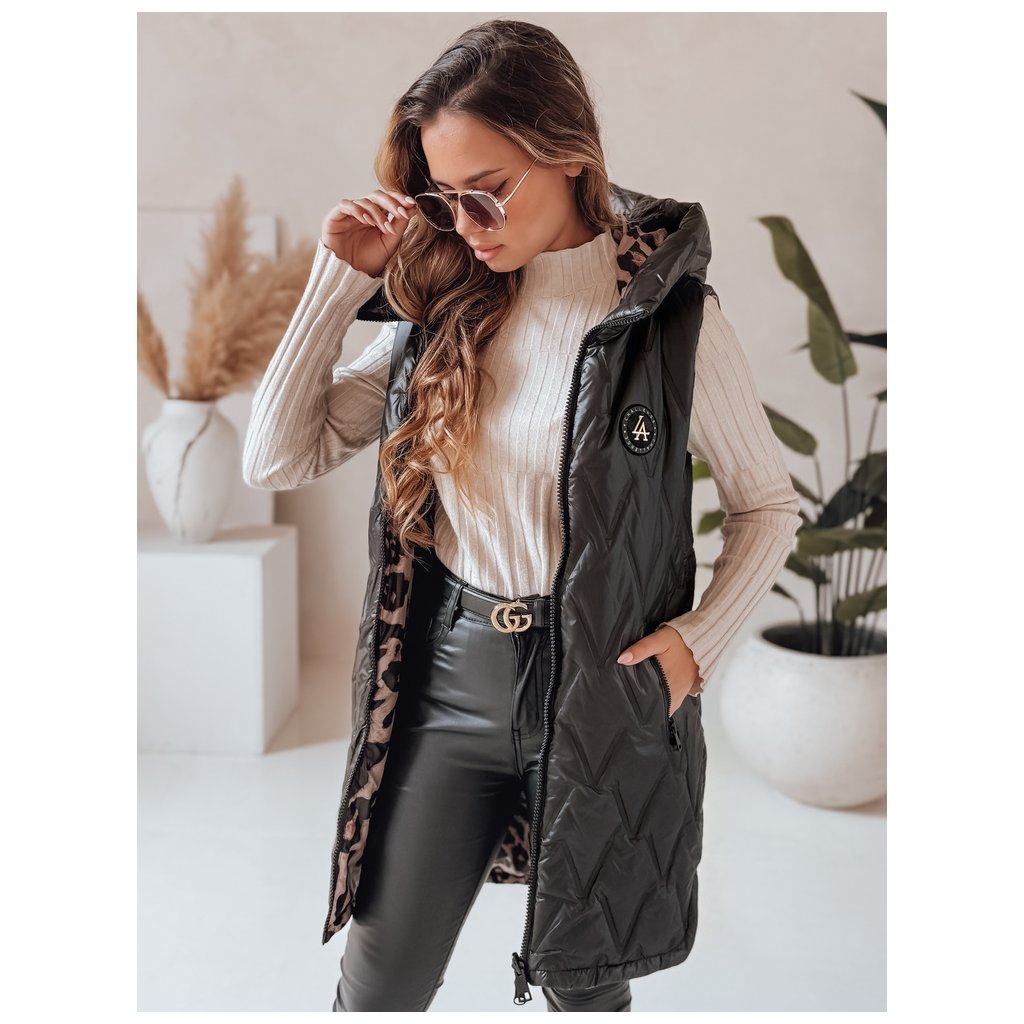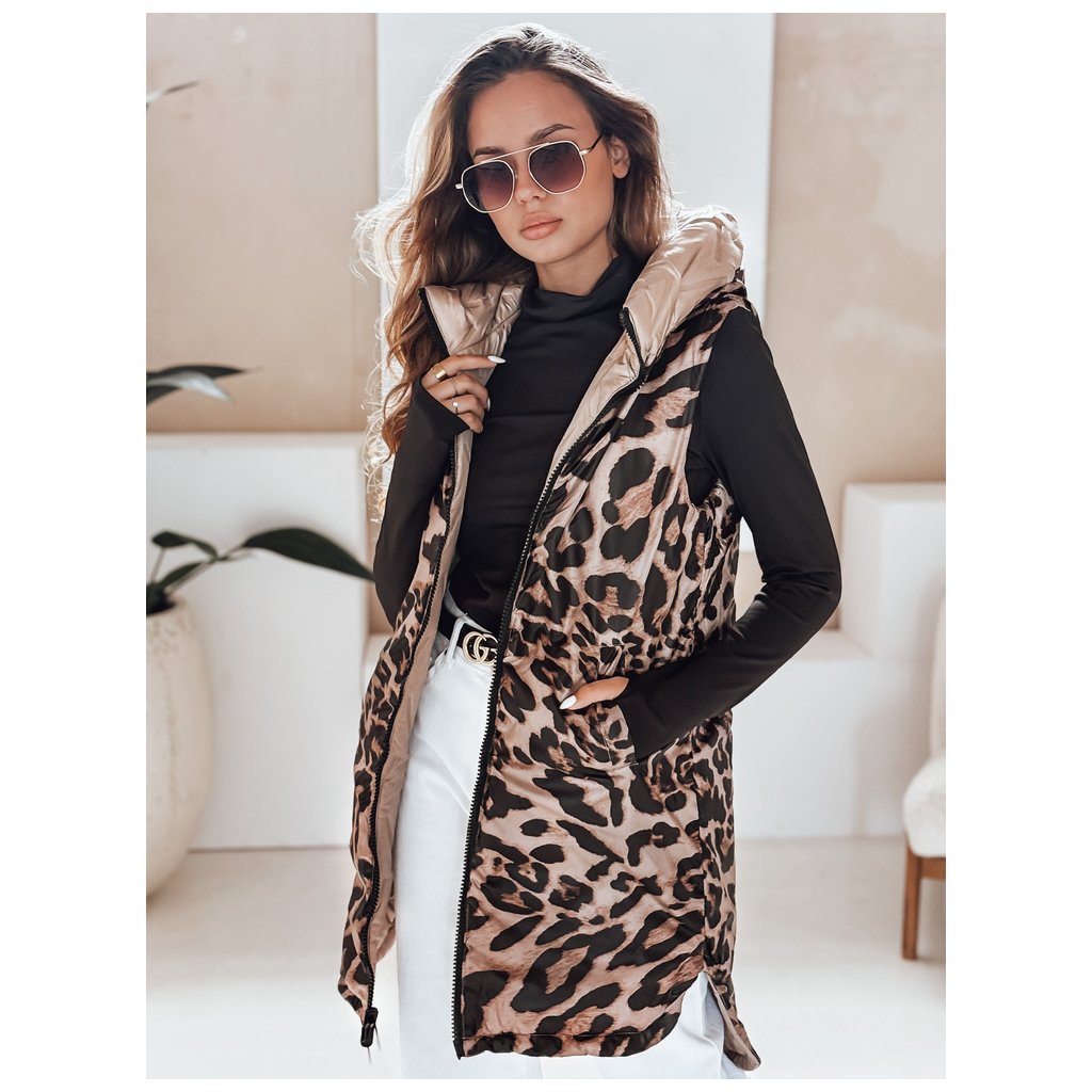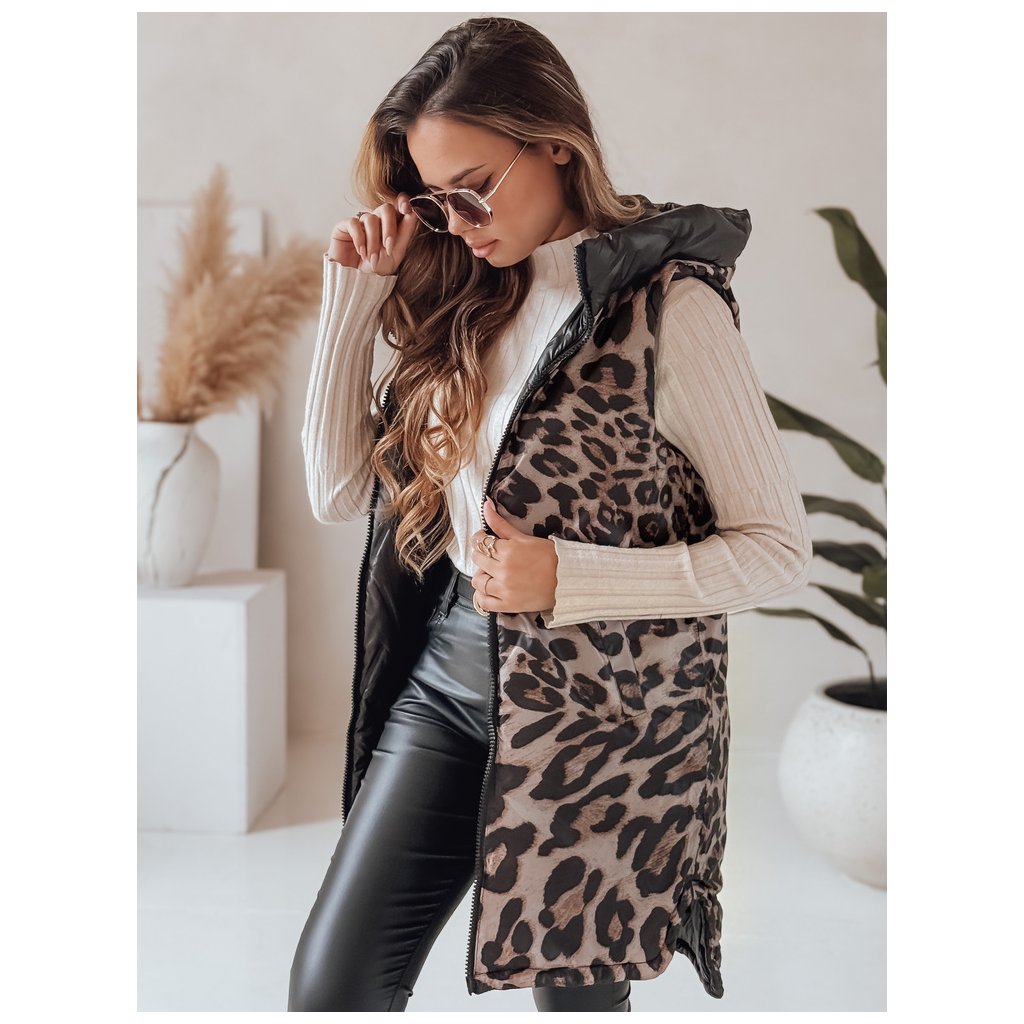 Tato oboustranná dámská vesta kombinuje klasický styl s moderním nádechem. Jedna strana je hladká a elegantní, druhá s výrazným leopardím vzorem. Všestranná délka a propracované detaily ji činí ideální pro chladnější dny a různé outfity.