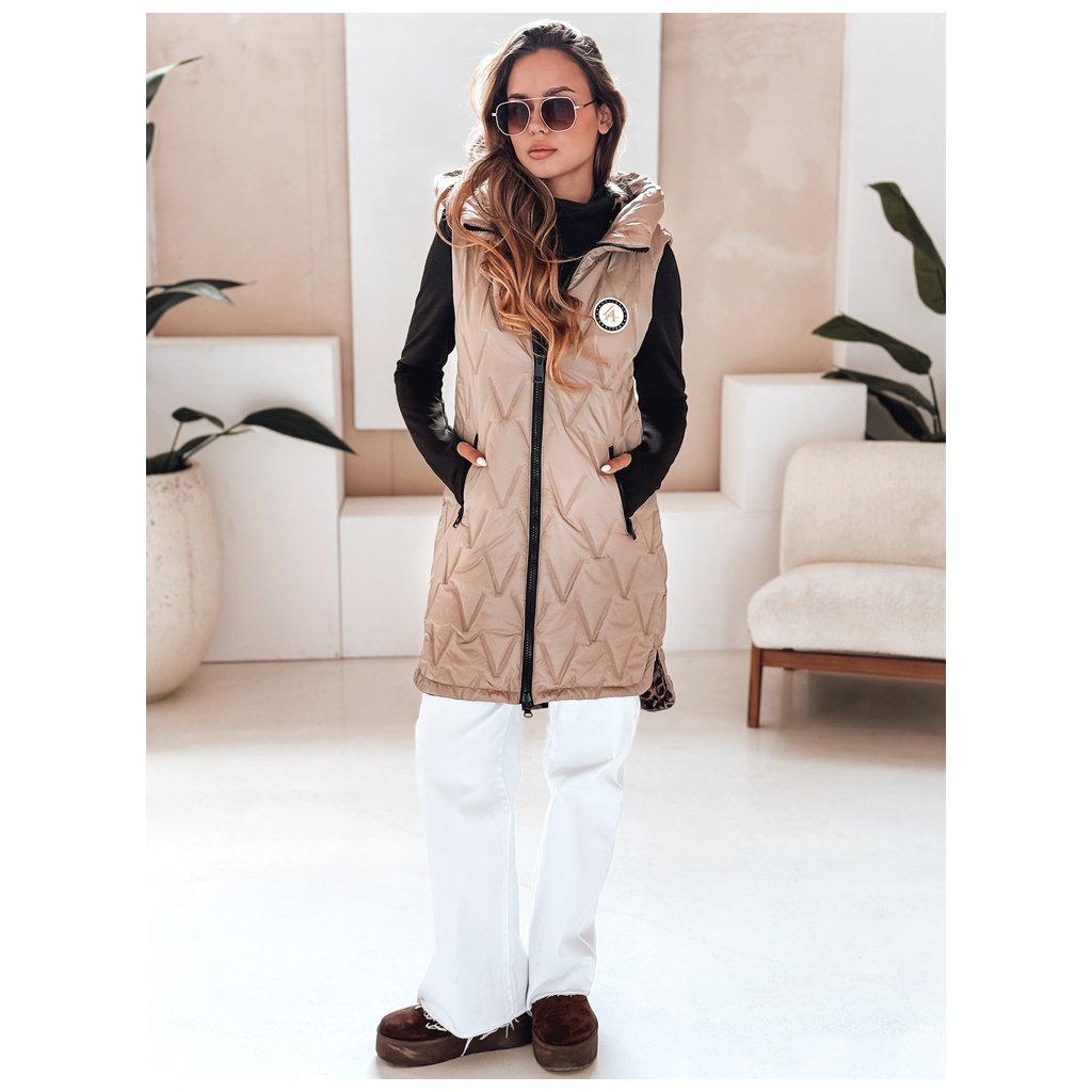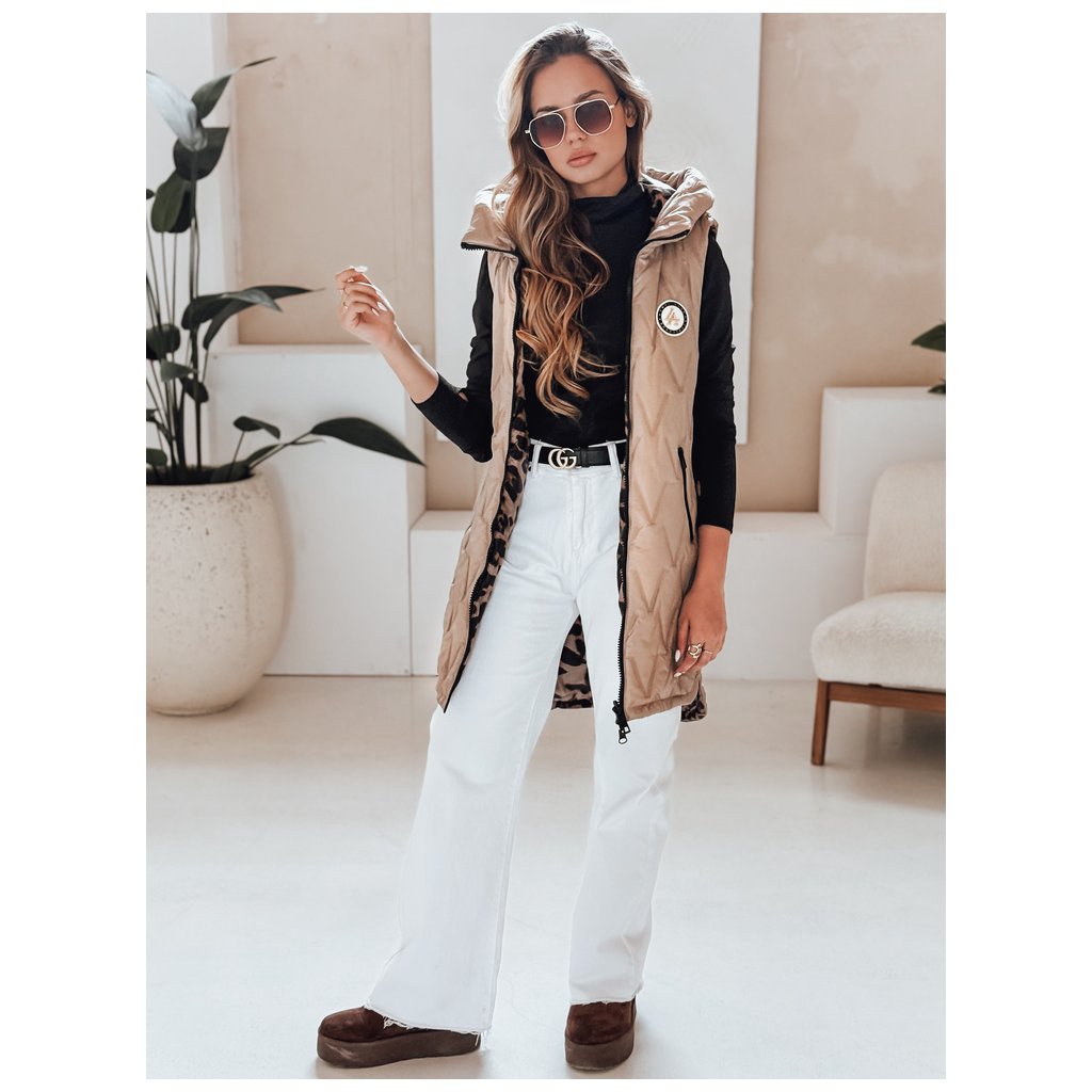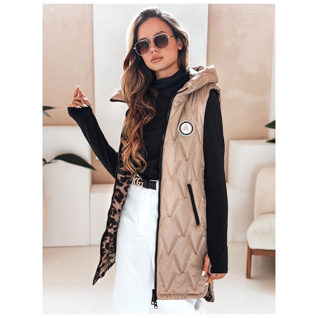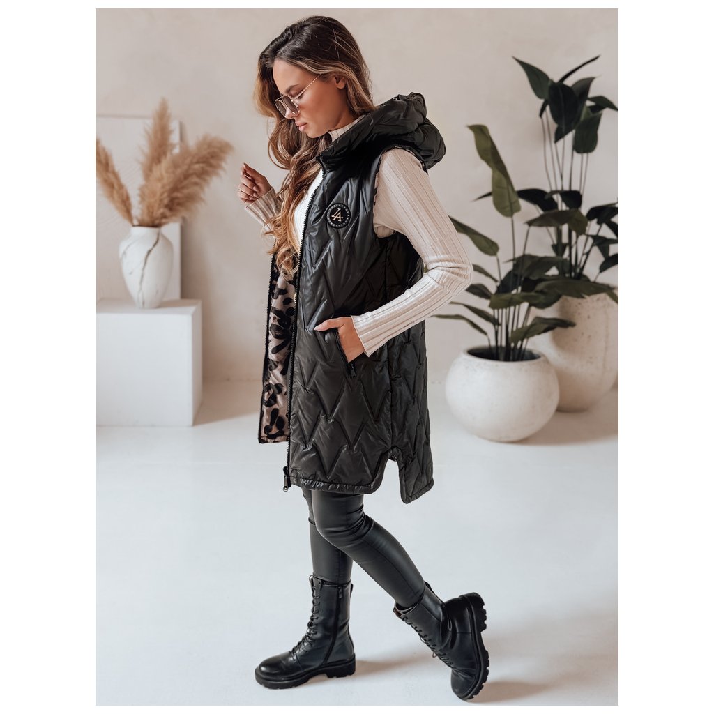 Tato oboustranná dámská vesta kombinuje klasický styl s moderním nádechem. Jedna strana je hladká a elegantní, druhá s výrazným leopardím vzorem. Všestranná délka a propracované detaily ji činí ideální pro chladnější dny a různé outfity.
