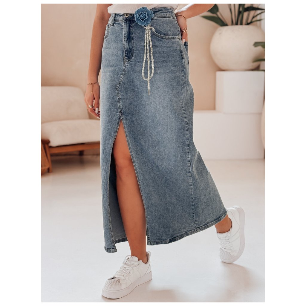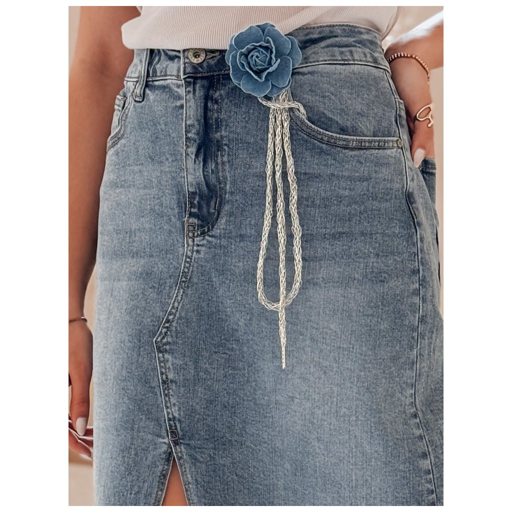 Tato maxi džínová sukně s rozparkem a ozdobnou květinou je perfektní volbou pro ženy, které si cení stylu a pohodlí. Sukně po kotníky v kombinaci s klasickým střihem a ozdobnými kapsami vytváří harmonický a trendy celek. Zapínání na zip zajišťuje přiléhavé nošení a látková květina v pase dodává sukni jedinečný nádech. Ideální pro mnoho příležitostí.