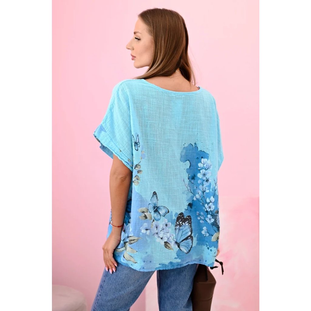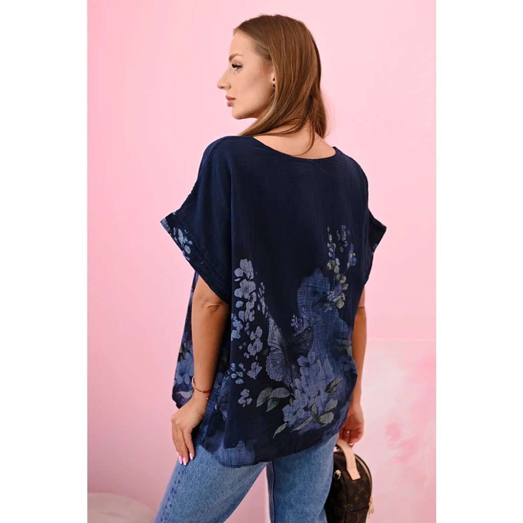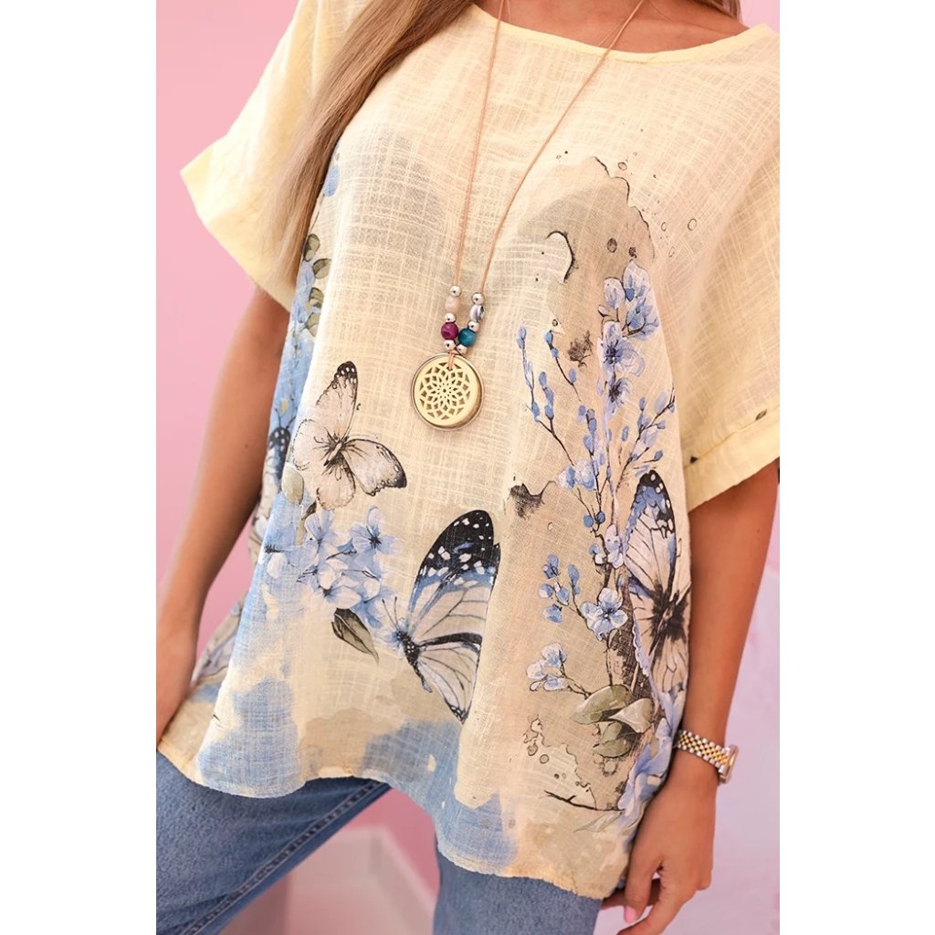 Představujeme lehkou a vzdušnou dámskou halenku s krátkým rukávem, ozdobenou romantickým potiskem motýlů a květin. Vyrobena ze 100% vysoce kvalitní bavlny, poskytuje pohodlí i v horkých dnech. Volný střih skvěle zakrývá nedokonalosti postavy a přírodní materiál umožňuje pokožce dýchat. Ideální na každodenní nošení, letní procházky nebo setkání s přáteli. Jemné barvy a subtilní vzor dodávají celku půvab a svěžest.
