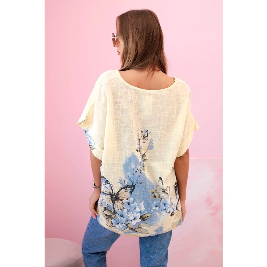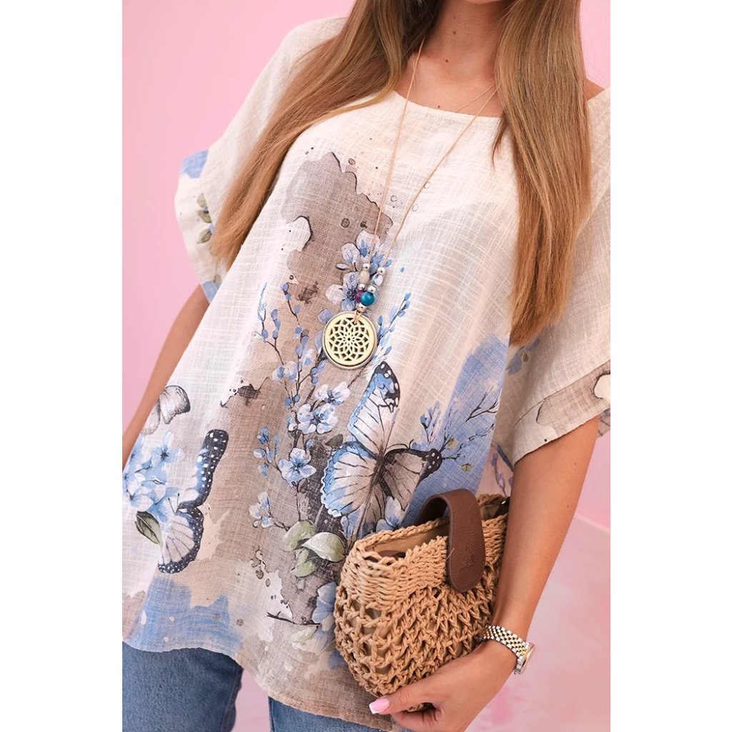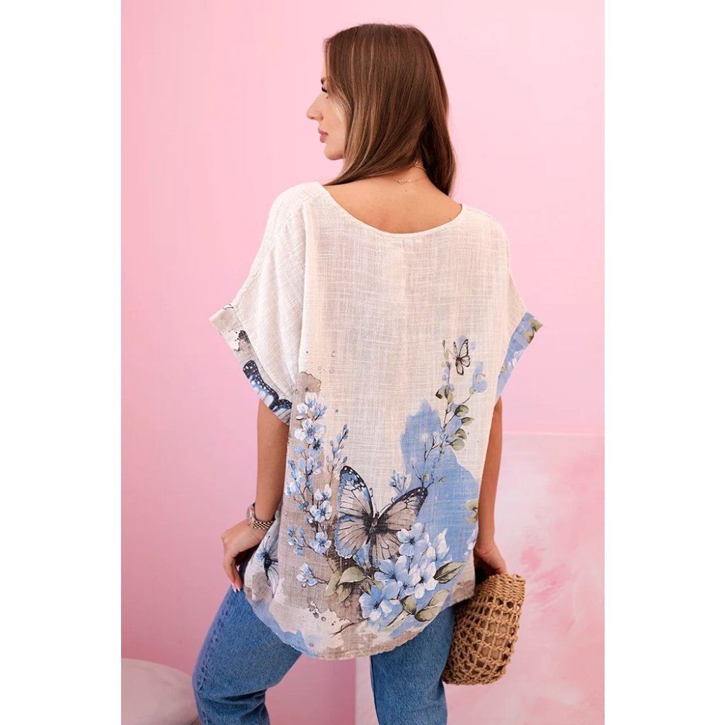 Představujeme lehkou a vzdušnou dámskou halenku s krátkým rukávem, ozdobenou romantickým potiskem motýlů a květin. Vyrobena ze 100% vysoce kvalitní bavlny, poskytuje pohodlí i v horkých dnech. Volný střih skvěle zakrývá nedokonalosti postavy a přírodní materiál umožňuje pokožce dýchat. Ideální na každodenní nošení, letní procházky nebo setkání s přáteli. Jemné barvy a subtilní vzor dodávají celku půvab a svěžest.