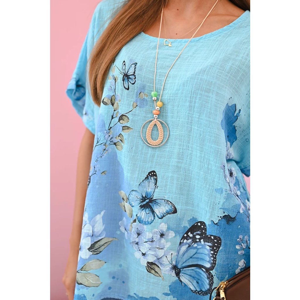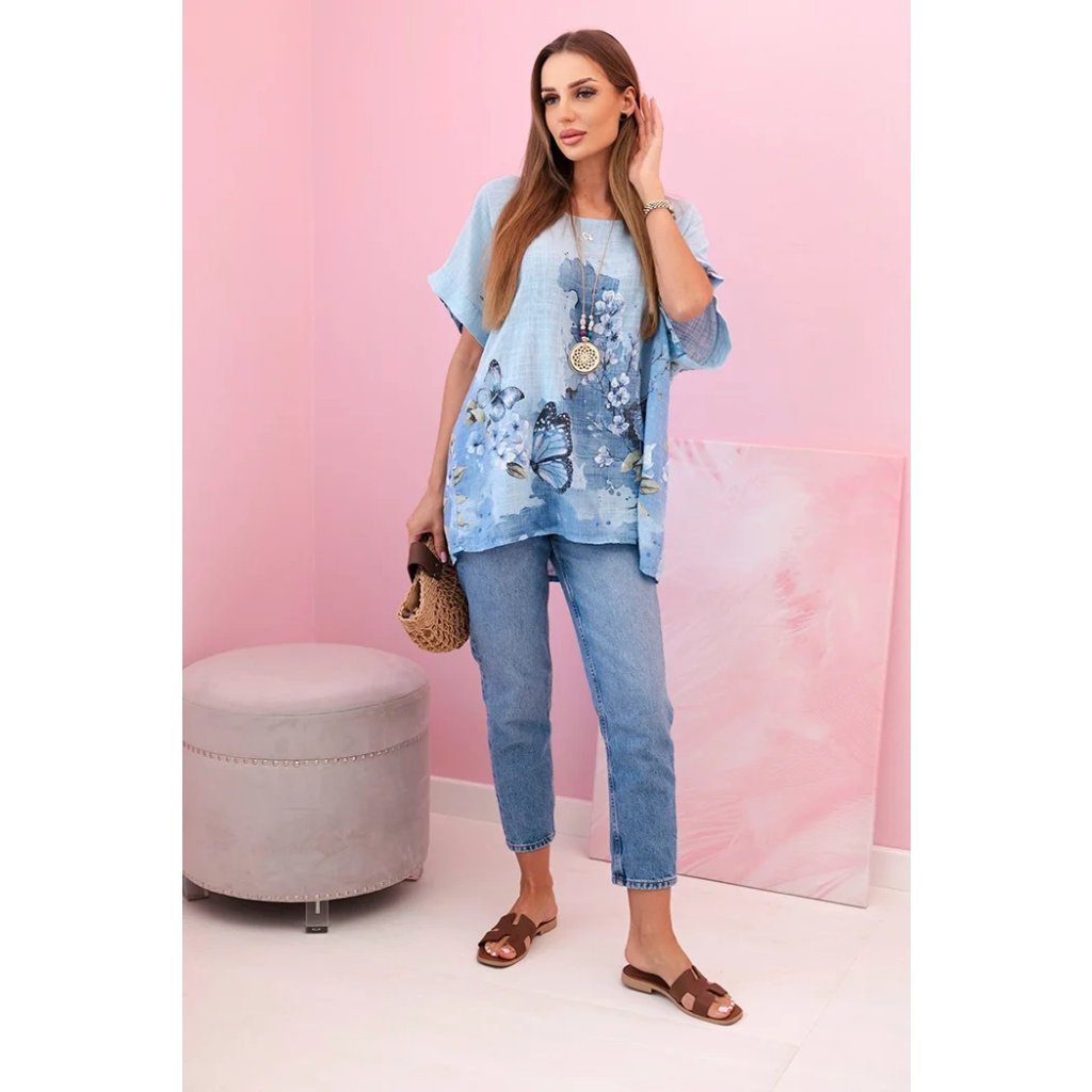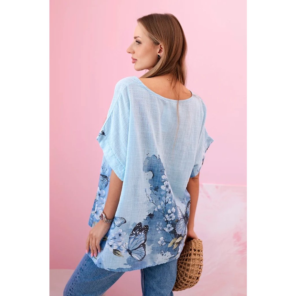 Představujeme lehkou a vzdušnou dámskou halenku s krátkým rukávem, ozdobenou romantickým potiskem motýlů a květin. Vyrobena ze 100% vysoce kvalitní bavlny, poskytuje pohodlí i v horkých dnech. Volný střih skvěle zakrývá nedokonalosti postavy a přírodní materiál umožňuje pokožce dýchat. Ideální na každodenní nošení, letní procházky nebo setkání s přáteli. Jemné barvy a subtilní vzor dodávají celku půvab a svěžest.
