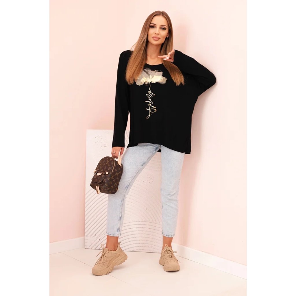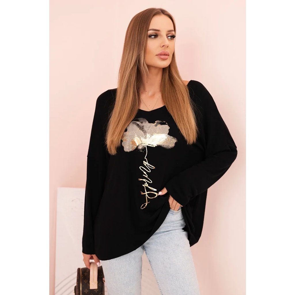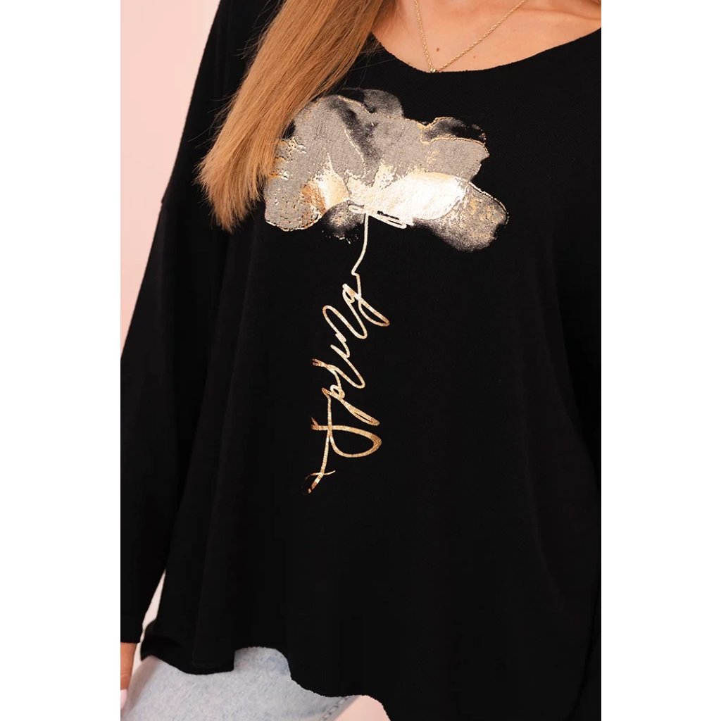 Model s volnějším střihem a jemně spadlým rukávem zajišťuje komfort a svobodu pohybu, zatímco lodičkový výstřih dodává celku ženský charakter. Dekorativní potisk se zlatým leskem přitahuje pozornost a dodává stylizaci výjimečné kouzlo.