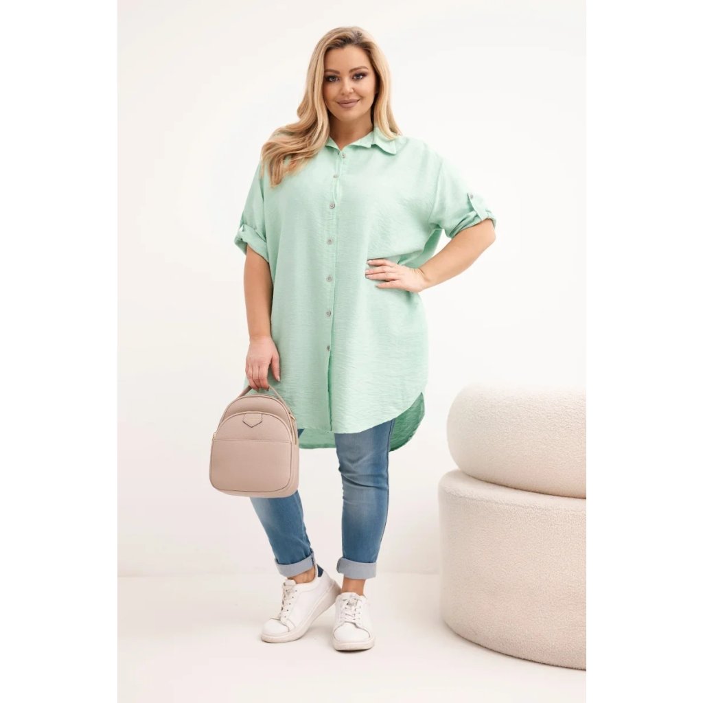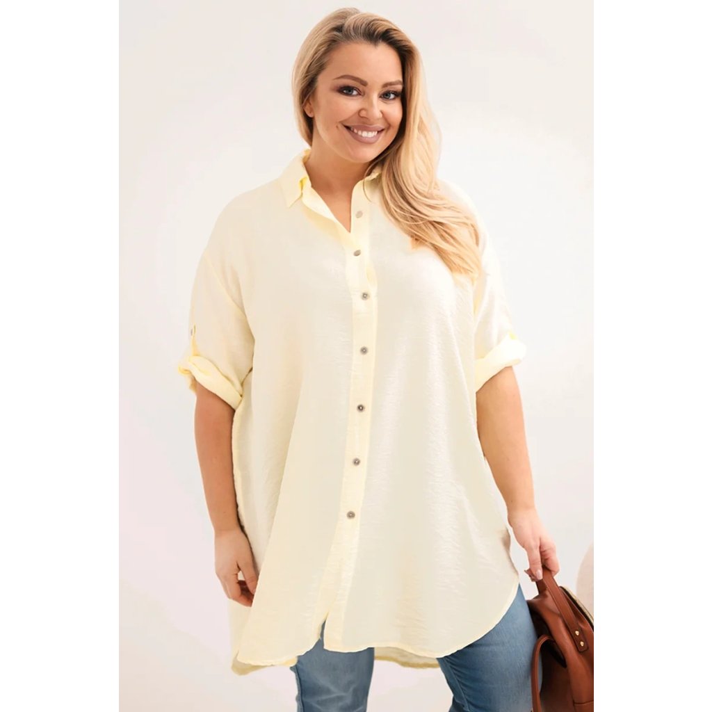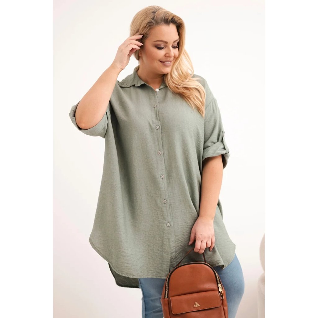 Tato jedinečná dámská oversized košile je kombinací volného stylu a elegance. Vyrobena z lehké, prodyšné viskózy, skvěle se hodí na teplejší dny, poskytující maximální komfort nošení. Volný střih typu plus size zaručuje pohodlí a prodloužená zadní část spolu s 3/4 rukávy s možností podhrnutí dodávají moderní charakter.