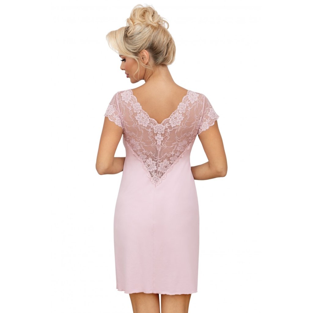 Elegantní dámská noční košile s krátkým rukávem, která je vyrobená z viskózy. Noční košile zdůrazňuje harmonii ženské postavy a zajišťuje maximální pohodlí. Klasický střih, jemně objímající tělo. Noční košile má výstřih ve tvaru V, ukončený ozdobnou krajkou s nepravidelným okrajem. Rukávy krátké délky, na konci zakončené prolamovanou krajkou. Jemná gumička pod poprsím, která pěkně odhaluje křivky. Noční košile s délkou nad kolena. Pokud má být noční spodní prádlo perfektní, tak bude tato volba ideální v každém případě. Baleno v krabičce.
