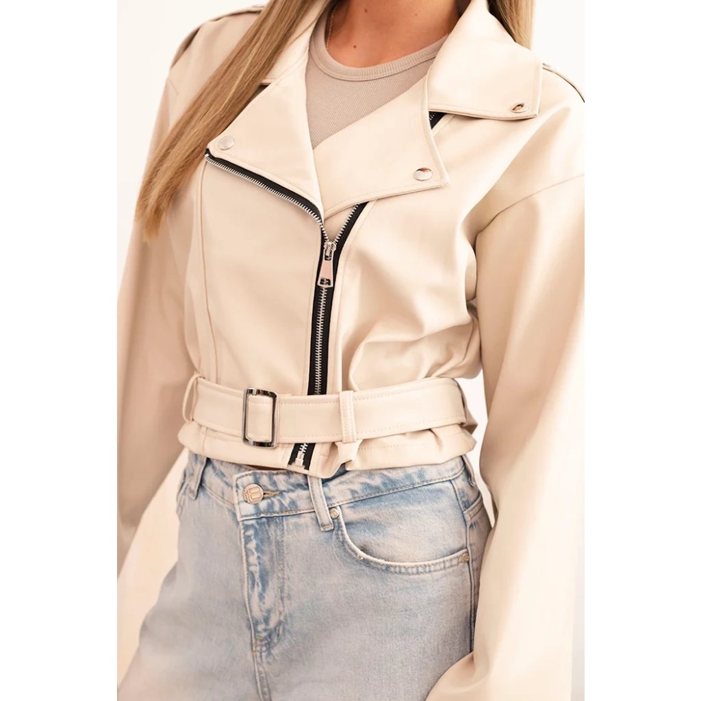 Moderní dámská bunda s krátkým střihem je návrhem pro ženy, které ocení městský styl a pohodlí. Model je vyroben z hladkého, lehce tužšího materiálu, skvěle se přizpůsobuje a přitahuje pozornost minimalistickým designem. Bunda má efektní límec, ozdobné knoflíky, zapínání na zip a pásek v pase, který umožňuje mírné přizpůsobení postavě.