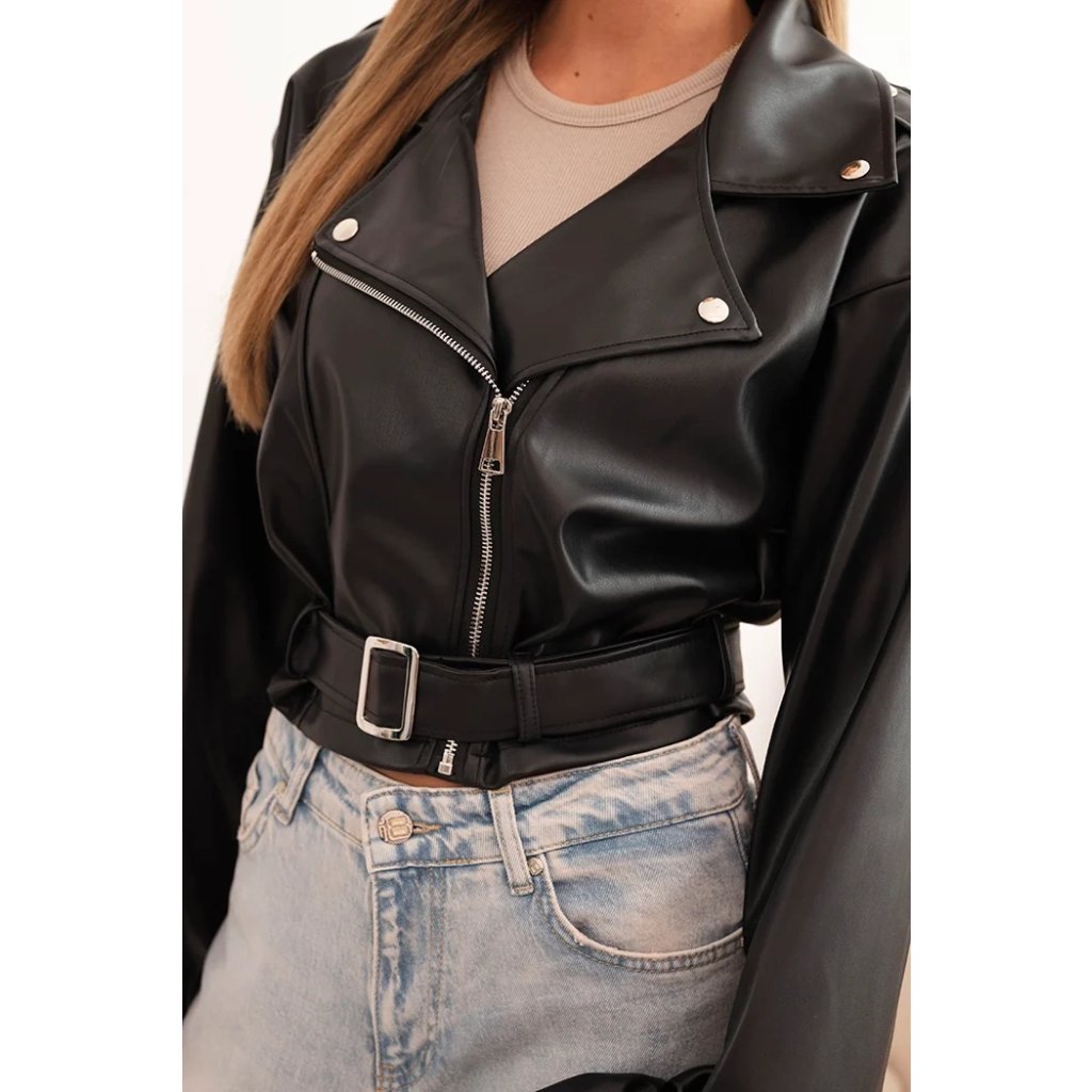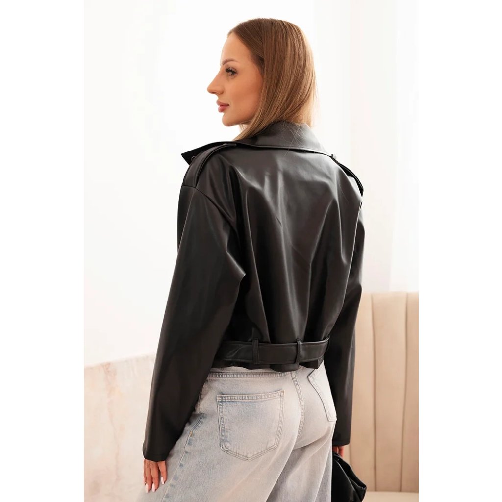 Dámská krátká bunda z eko kůže s páskem a límcem