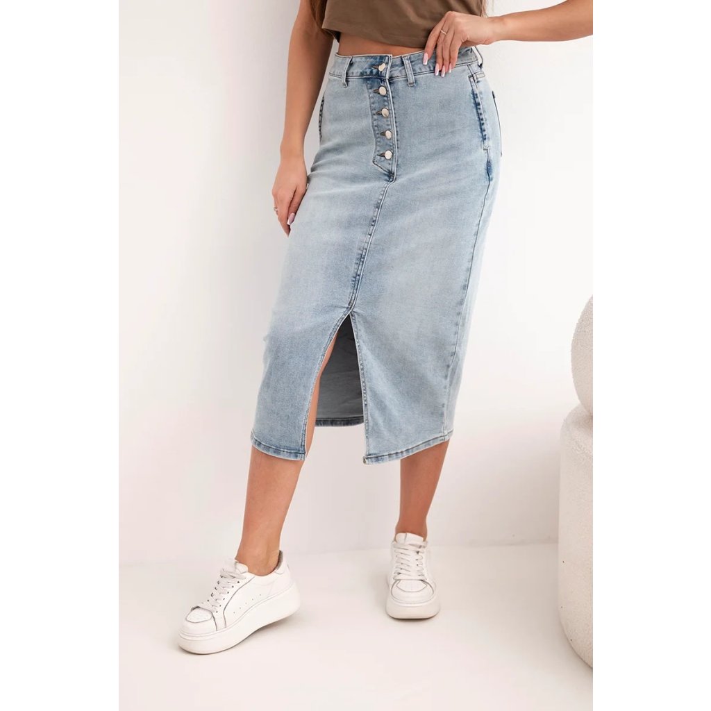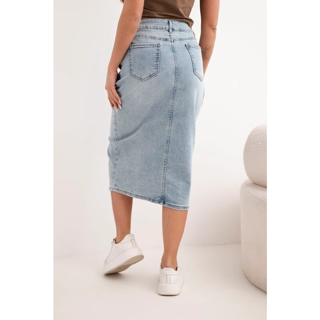 Džínová midi sukně je nadčasový model, který se hodí jak na každodenní nošení, tak do elegantnějších stylizací. Vyrobená z elastického denimu, skvěle se přizpůsobuje postavě a zdůrazňuje ženské tvary. Charakteristické rozparek vpředu jí dodává lehkost a volnost pohybu, zatímco jemné oprání látky dodává celku módní, casual vzhled.
