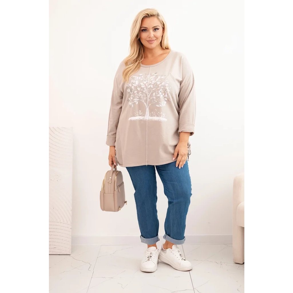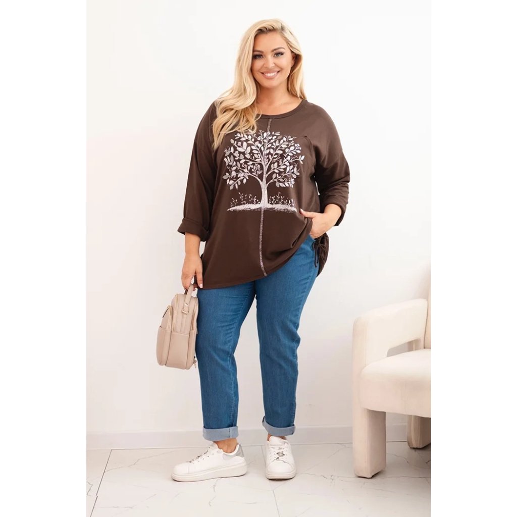 Dámská mikina ve velikosti Plus Size s volným střihem je ideální na každý den pro ženy, které si cení pohodlí a stylu. Model je vyroben z vysoce kvalitní bavlny s přídavkem elastanu, což zaručuje komfort nošení a jemné přizpůsobení postavě. Přední stranu zdobí efektní potisk stromu, který dodává celku módní charakter.