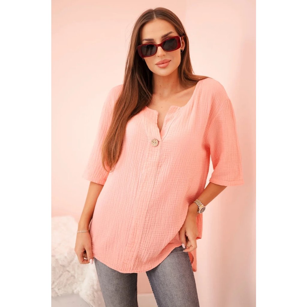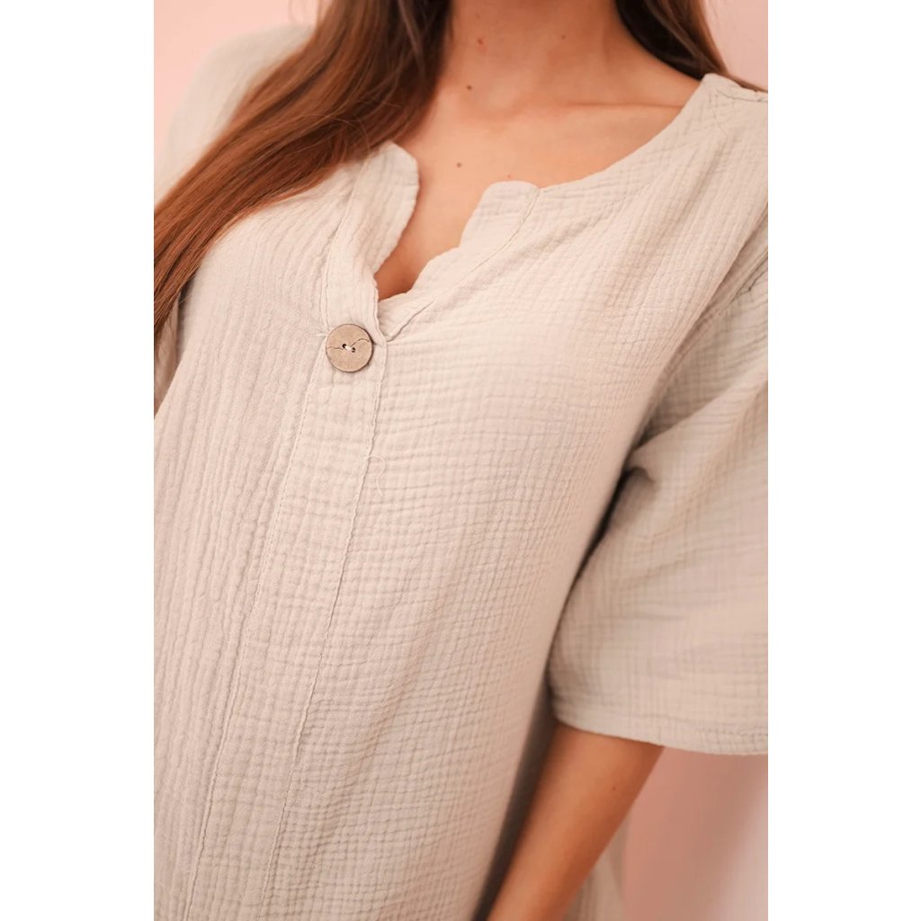Lehká, prodyšná a neuvěřitelně pohodlná – tato dámská košile z jemného mušelínu je ideální volbou na teplé dny. Volný střih zajišťuje pohodlí při nošení a dekorativní knoflík jí dodává neformální charakter. Můžete ji nosit jak na běžné nošení, tak i jako součást boho stylizací. Díky univerzálnímu střihu se skvěle hodí k džínům, kraťasům nebo letní sukni. Ohrnovací rukávy jí dodávají lehkost a volnost, zatímco přírodní bavlna zaručuje prodyšnost a komfort po celý den.