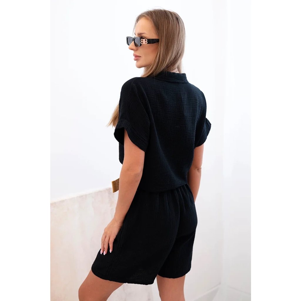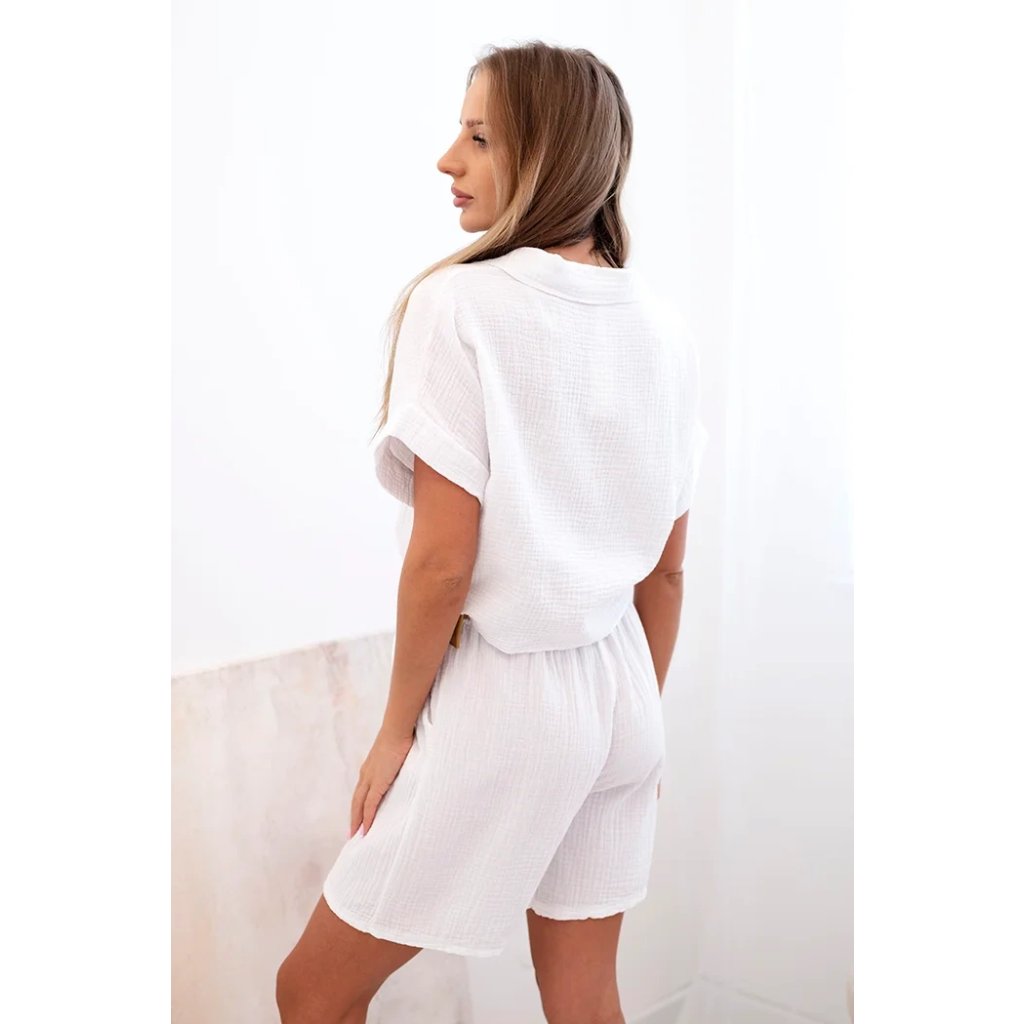 Stylová dámská mušelínová souprava je ideální volbou na teplé dny! Souprava obsahuje krátkou košili s uzlem dole a volné šortky s elastickým pasem a ozdobným páskem, které zajišťují pohodlí a stylový vzhled. Přírodní, prodyšná bavlna dělá tento komplet ideálním na dovolenou, procházky nebo každodenní odpočinek. Volný střih košile a široké nohavice šortek zajišťují volnost pohybu a pohodlí po celý den. Soupravu lze nosit společně nebo jednotlivě, což z ní činí velmi univerzální kousek letního šatníku. Italská výroba – kvalita, které můžete věřit. Velikost je univerzální a bude vyhovovat ženám velikostí S, M nebo L.