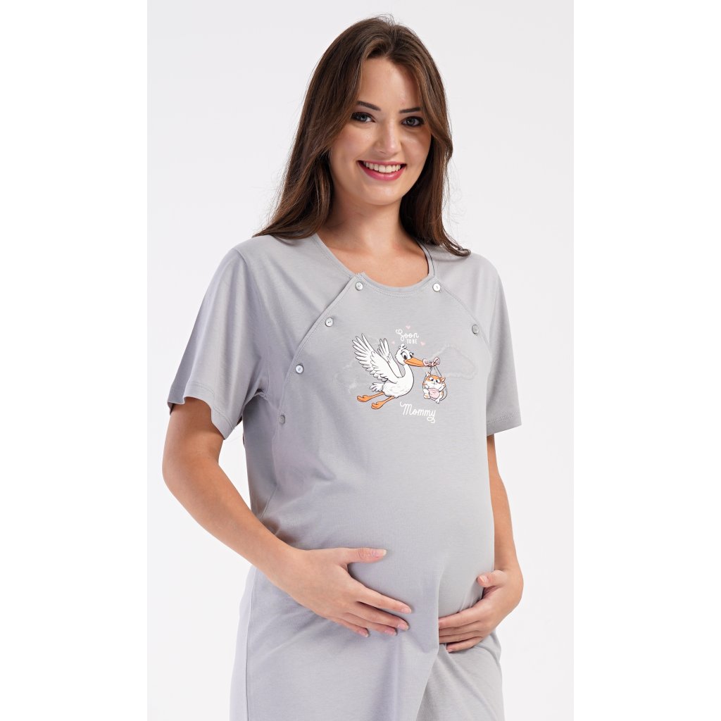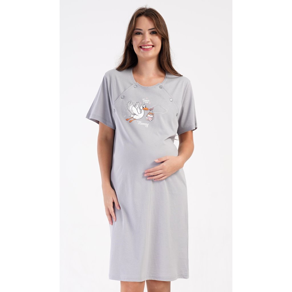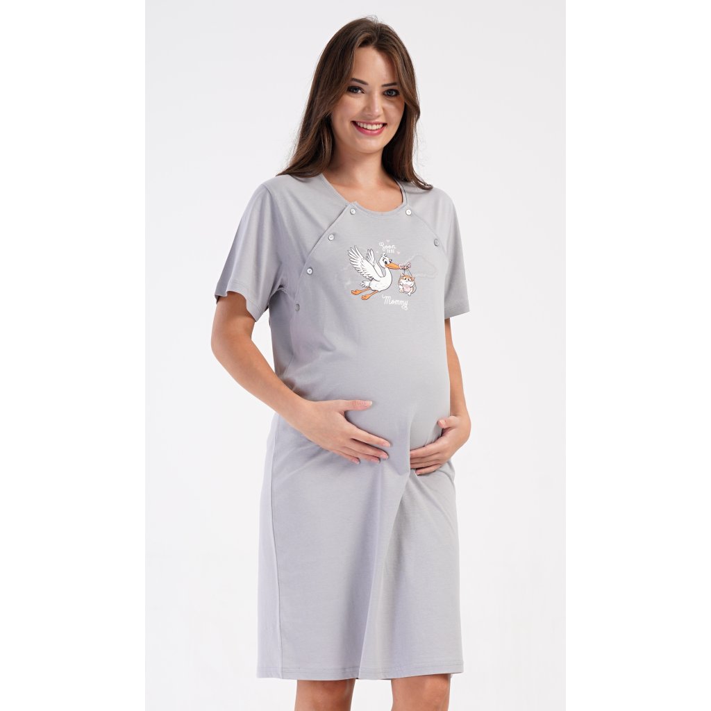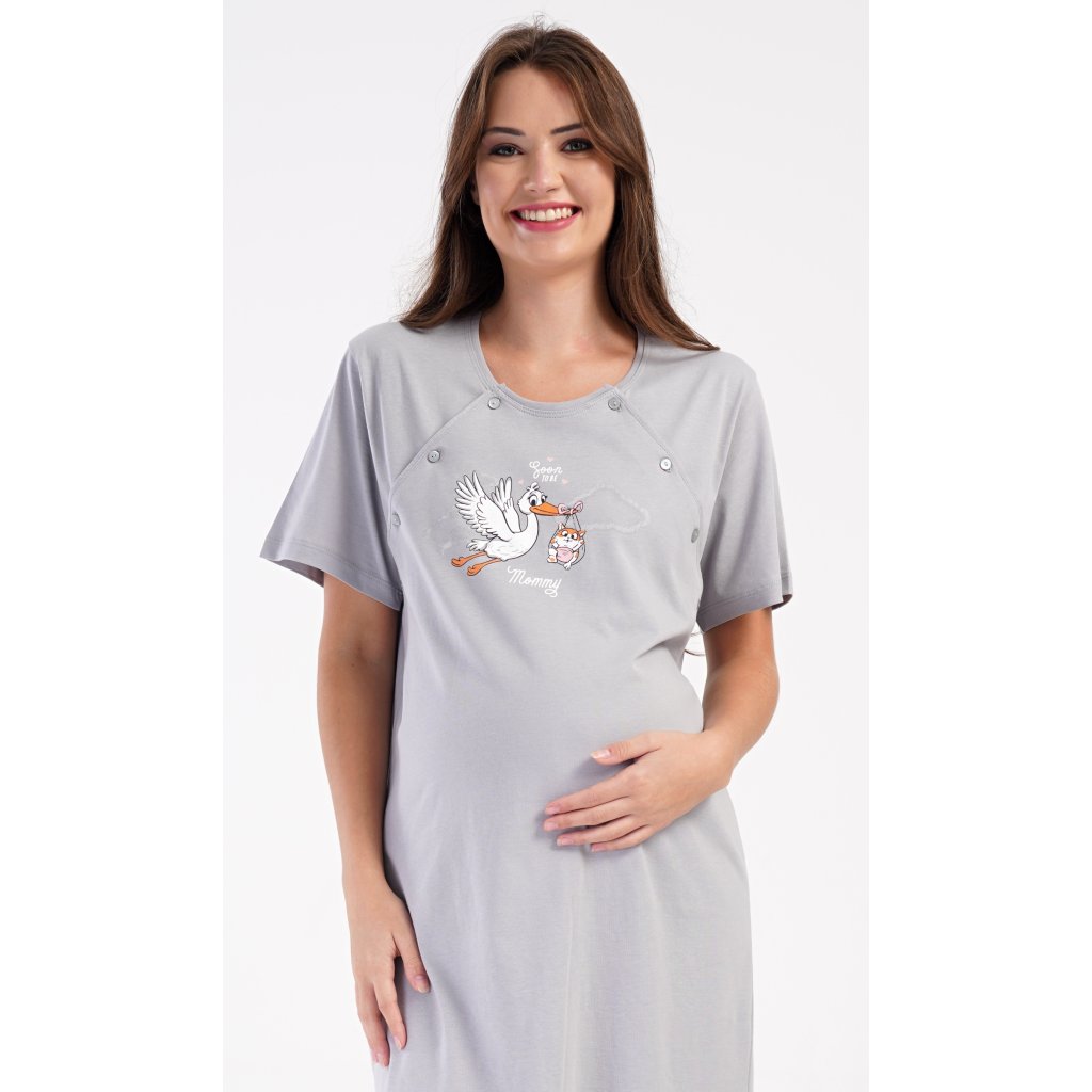 Dámská bavlněná mateřská noční košile Čáp s miminkem. Noční košile je svým střihem určená na dobu těhotenství, do porodnice i ke kojení. Ke kojení slouží průstřihy po stranách košile, které jsou uzavíratelné na knoflíky. Jednobarevná košile je na hrudi ozdobena obrázkem čápa, který nese v zobáku kotě. Použitý materiál s podílem bavlny 100% je příjemný a poddajný na dotek.