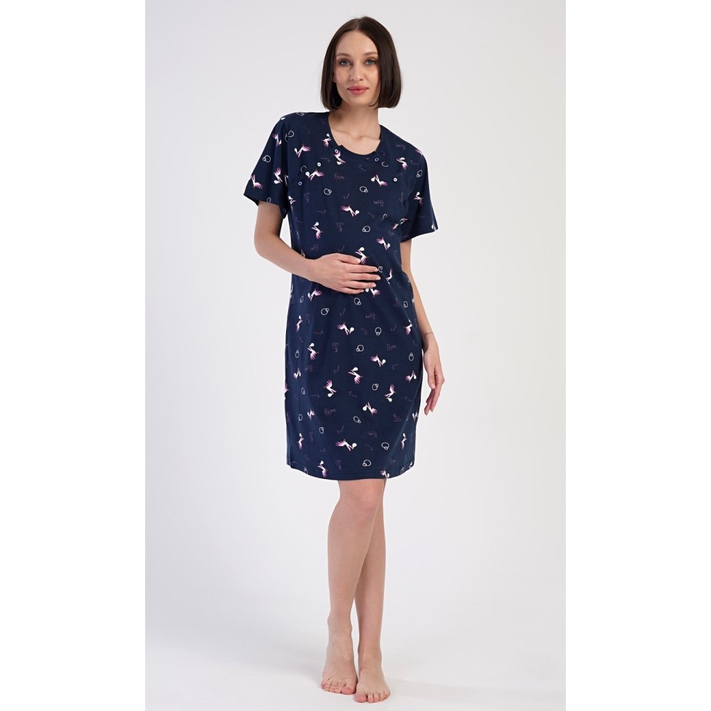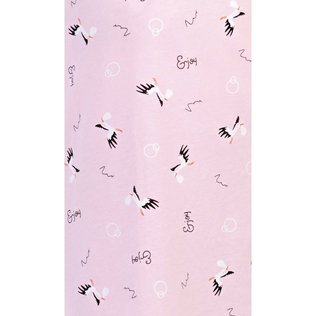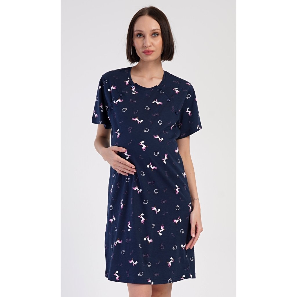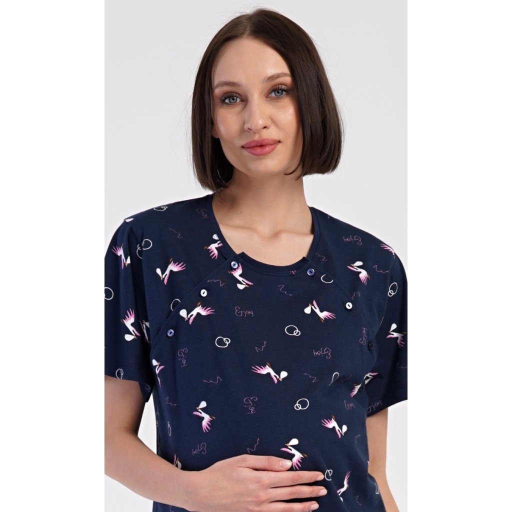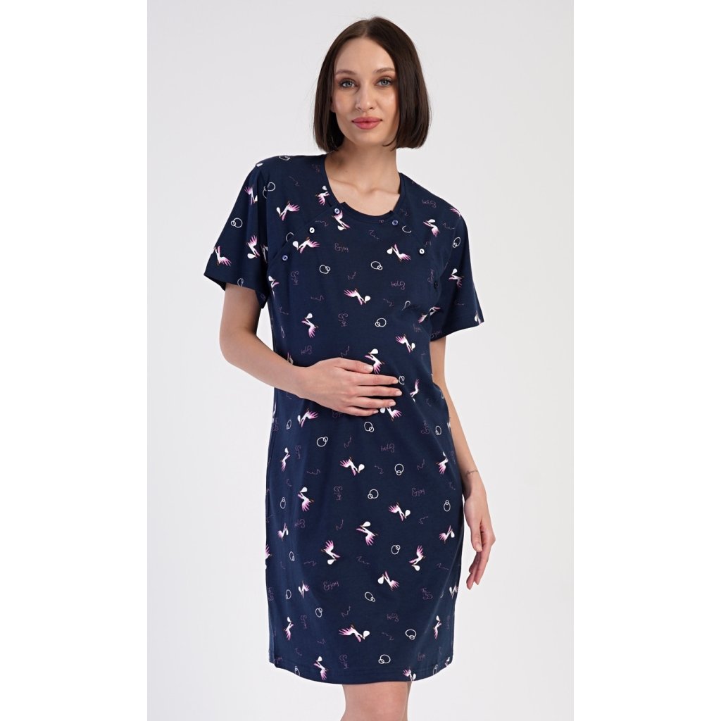 Dámská bavlněná mateřská noční košile Čáp. Noční košile je svým střihem určená na dobu těhotenství, do porodnice i ke kojení. Ke kojení slouží průstřihy po stranách košile, které jsou uzavíratelné na knoflíky. Košili zdobí potisk letících čápů, kteří nesou maminkám v zobácích miminka. Použitý materiál s podílem bavlny 100% je příjemný a poddajný na dotek.