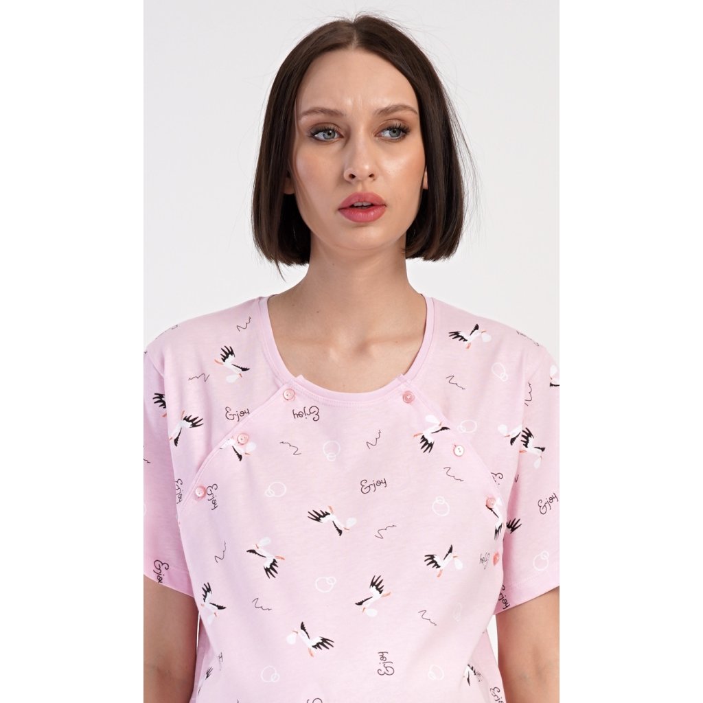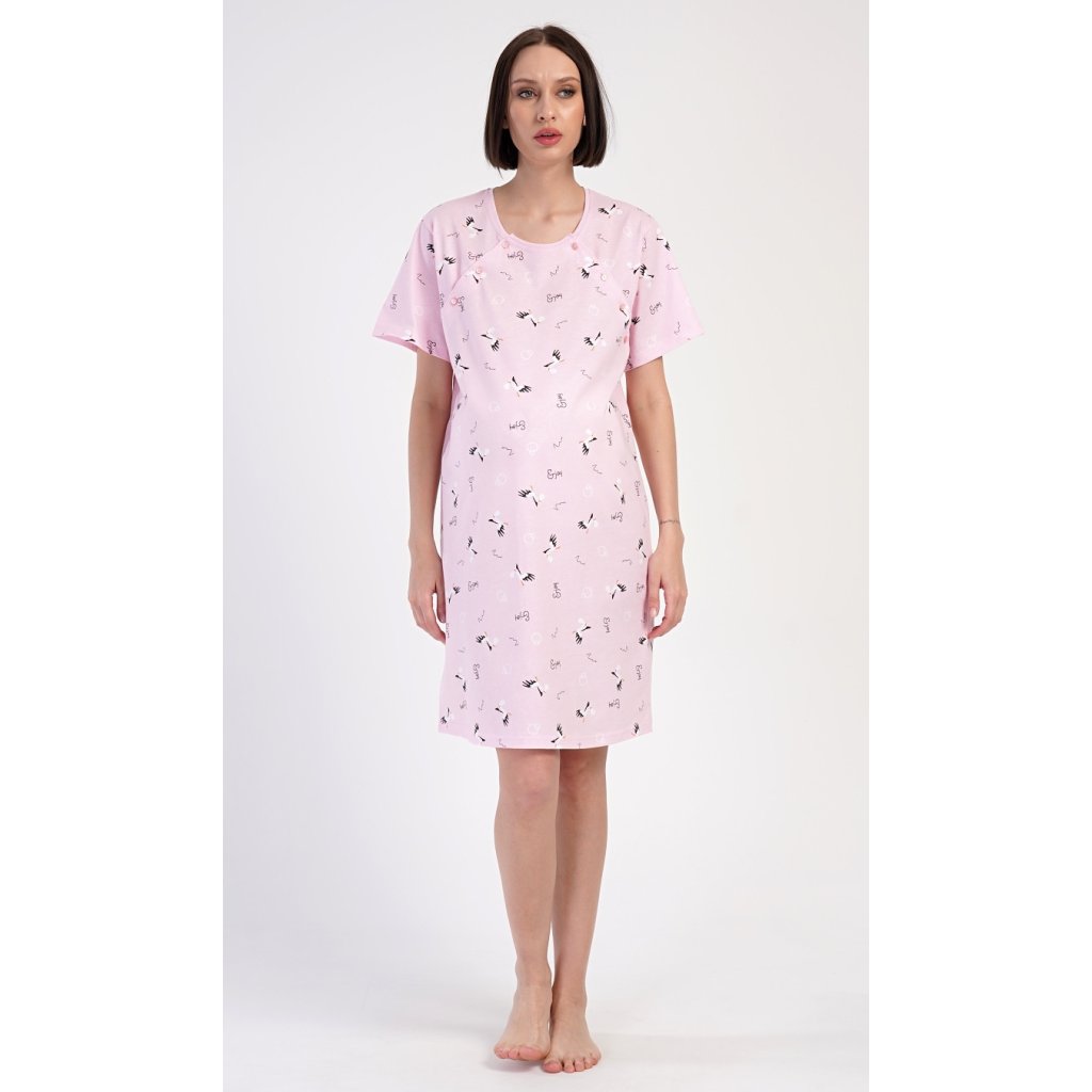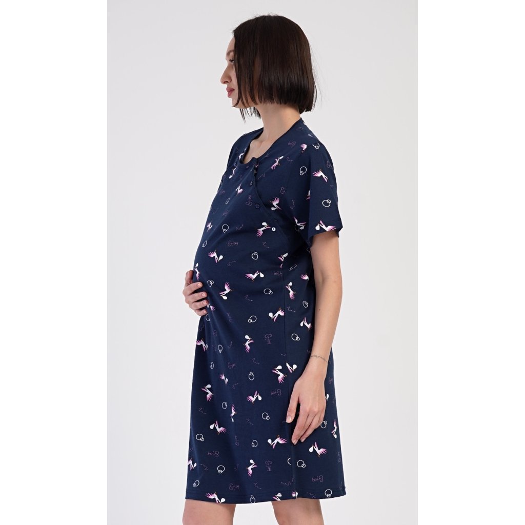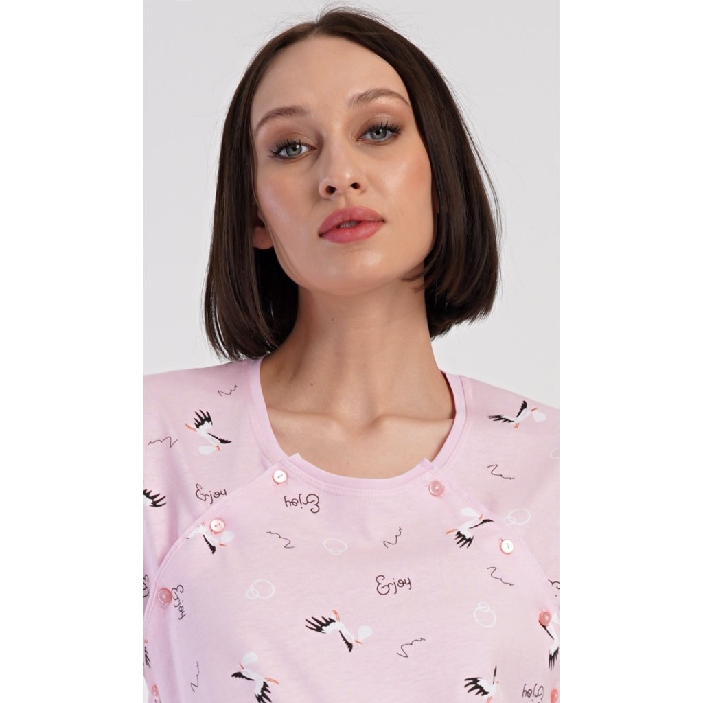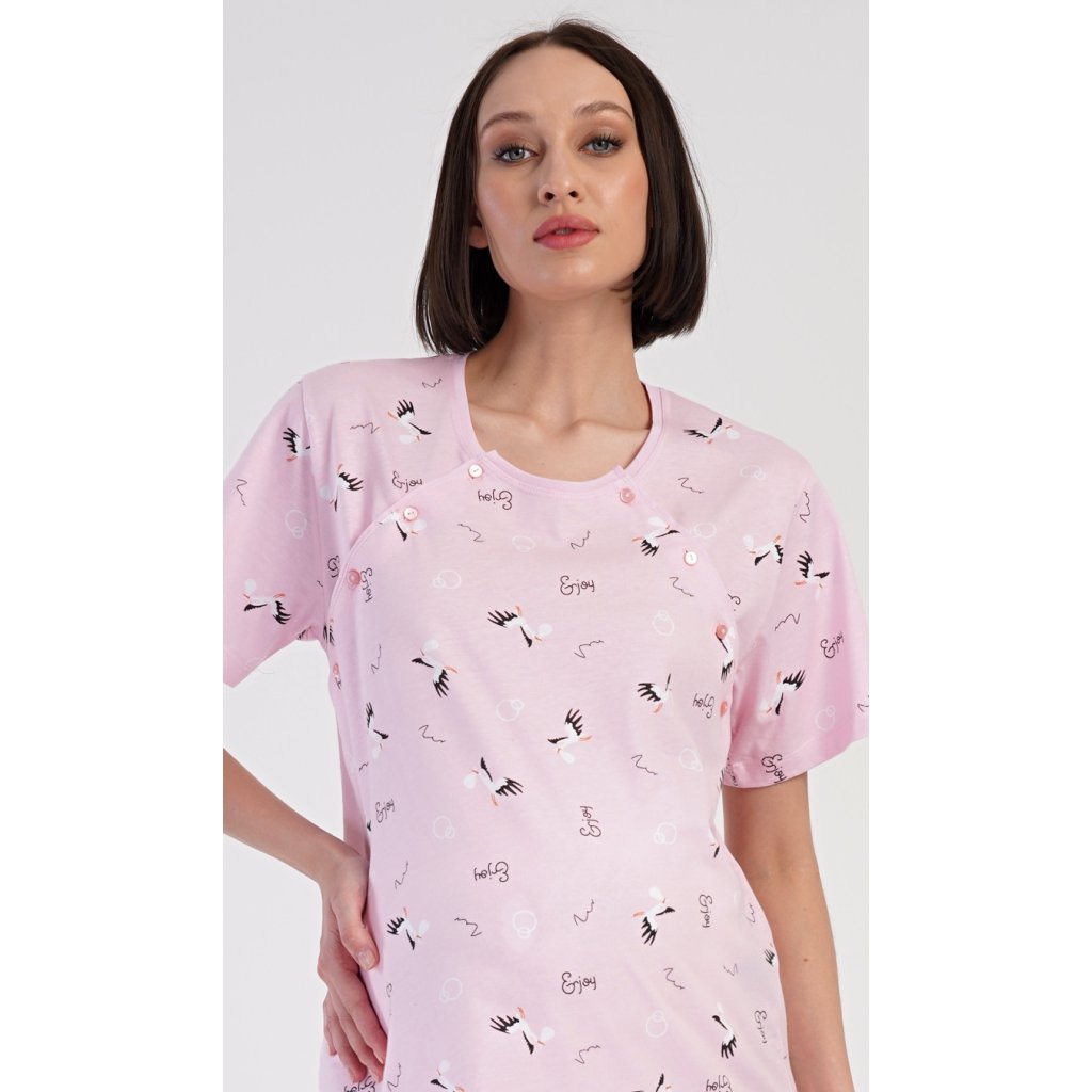 Dámská bavlněná mateřská noční košile Čáp. Noční košile je svým střihem určená na dobu těhotenství, do porodnice i ke kojení. Ke kojení slouží průstřihy po stranách košile, které jsou uzavíratelné na knoflíky. Košili zdobí potisk letících čápů, kteří nesou maminkám v zobácích miminka. Použitý materiál s podílem bavlny 100% je příjemný a poddajný na dotek.