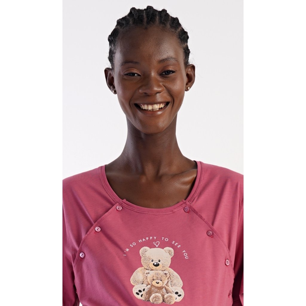 Dámská bavlněná mateřská noční košile Dominika. Noční košile je svým střihem určená na dobu těhotenství, do porodnice i ke kojení. Ke kojení slouží průstřihy po stranách košile, které jsou uzavíratelné na knoflíky. Přední díl košile zdobí obrázek dvou plyšových medvědů. Použitý materiál s podílem bavlny 100% je příjemný a poddajný na dotek.