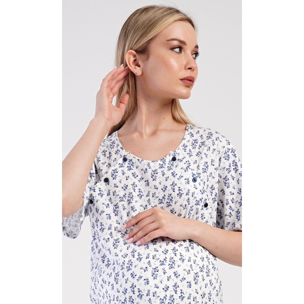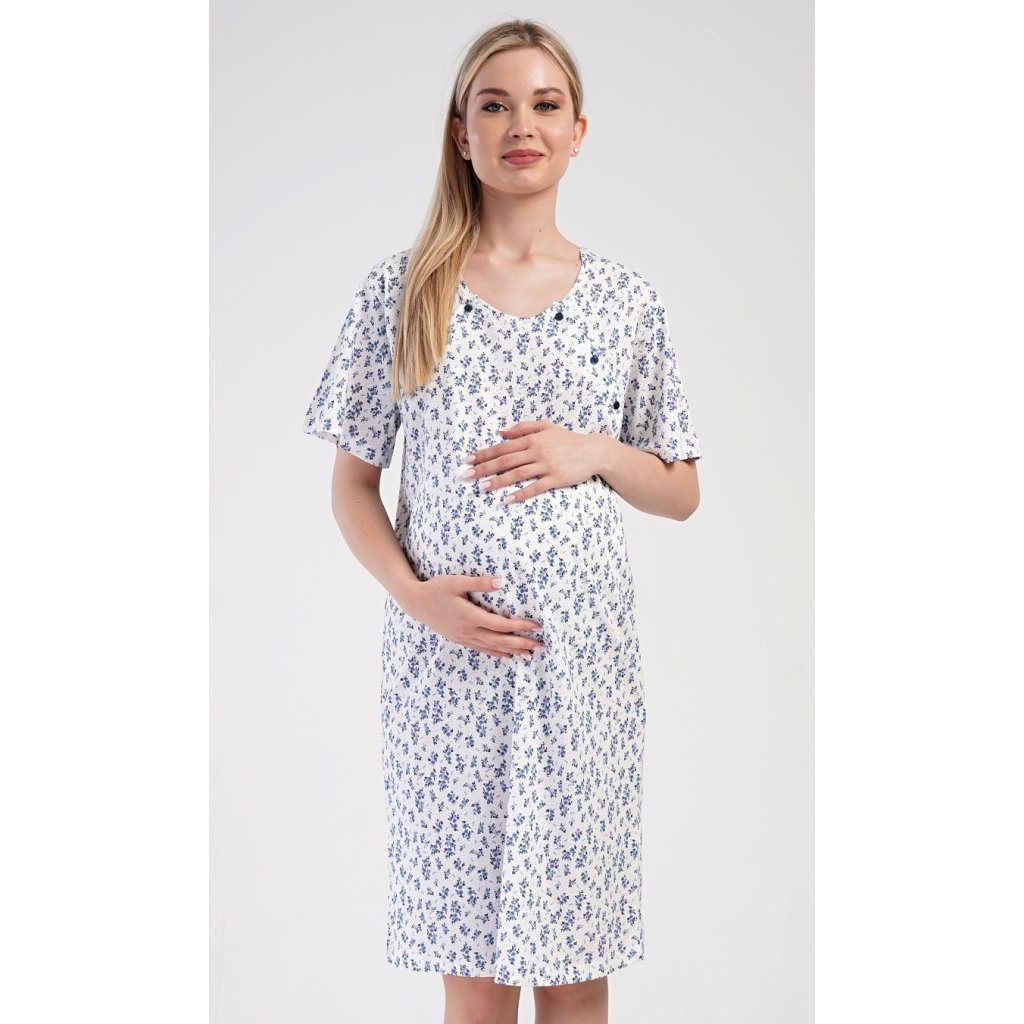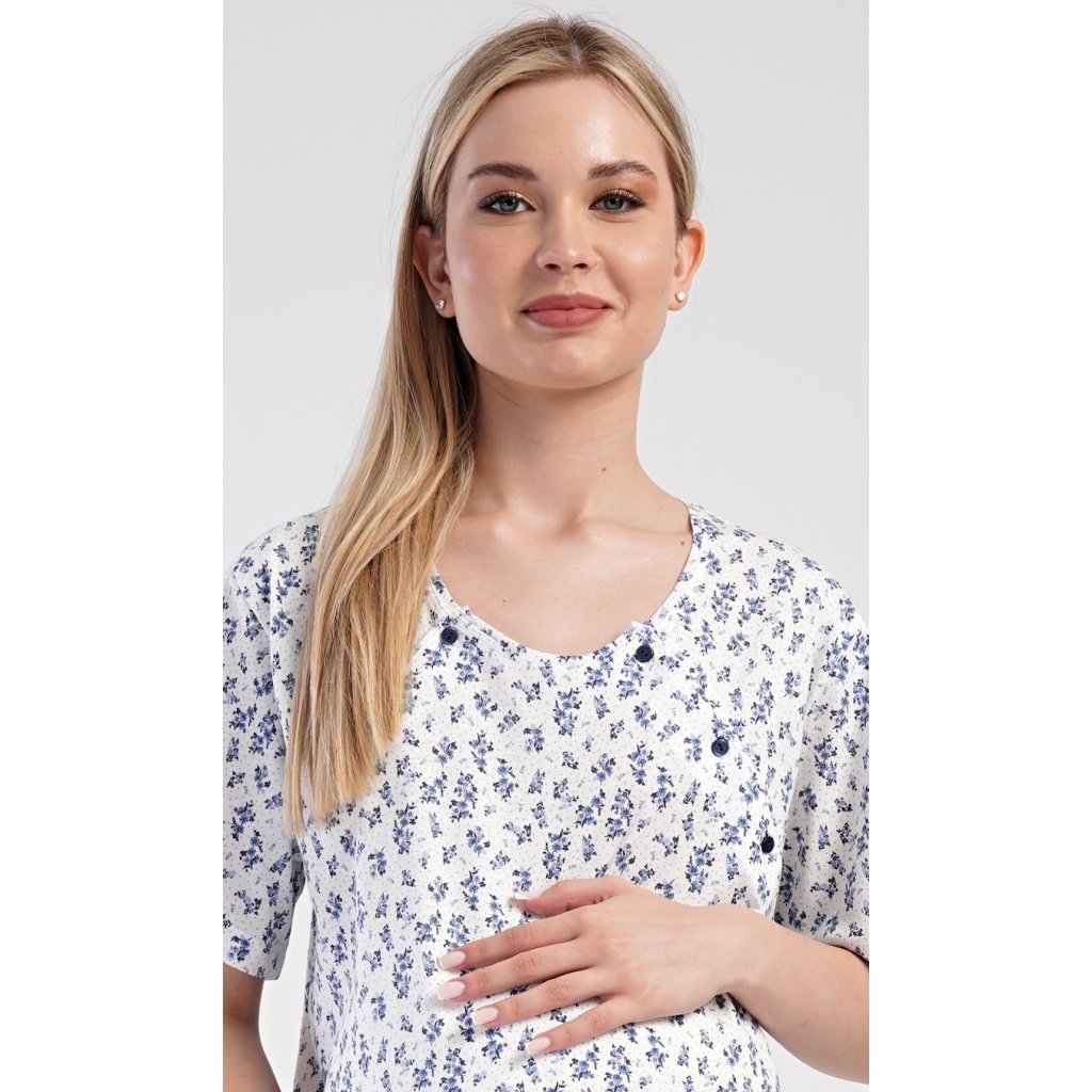 Dámská bavlněná mateřská noční košile Flowers. Noční košile je svým střihem určená na dobu těhotenství, do porodnice i ke kojení. Ke kojení slouží průstřihy po stranách košile, které jsou uzavíratelné na knoflíky. Košile je potištěna drobnými modrými květy. Použitý materiál s podílem bavlny 100% je příjemný a poddajný na dotek.