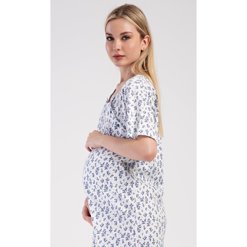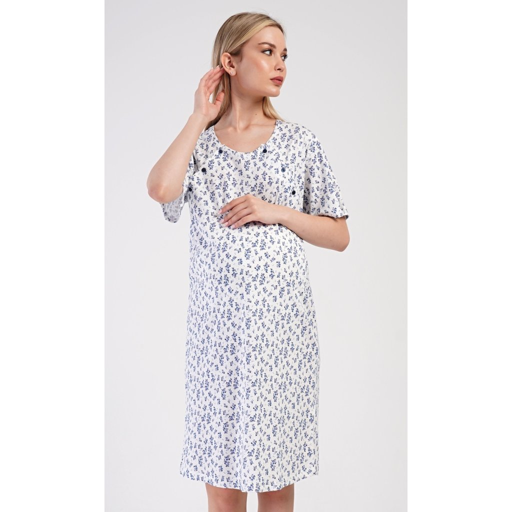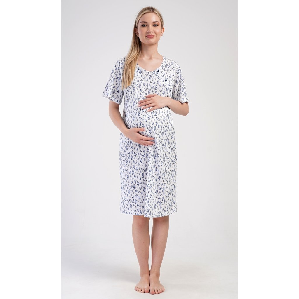 Dámská bavlněná mateřská noční košile Flowers. Noční košile je svým střihem určená na dobu těhotenství, do porodnice i ke kojení. Ke kojení slouží průstřihy po stranách košile, které jsou uzavíratelné na knoflíky. Košile je potištěna drobnými modrými květy. Použitý materiál s podílem bavlny 100% je příjemný a poddajný na dotek.