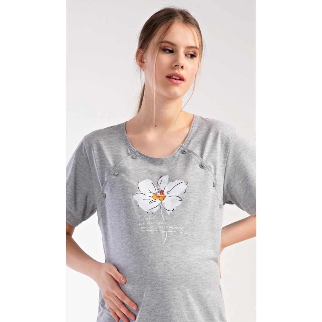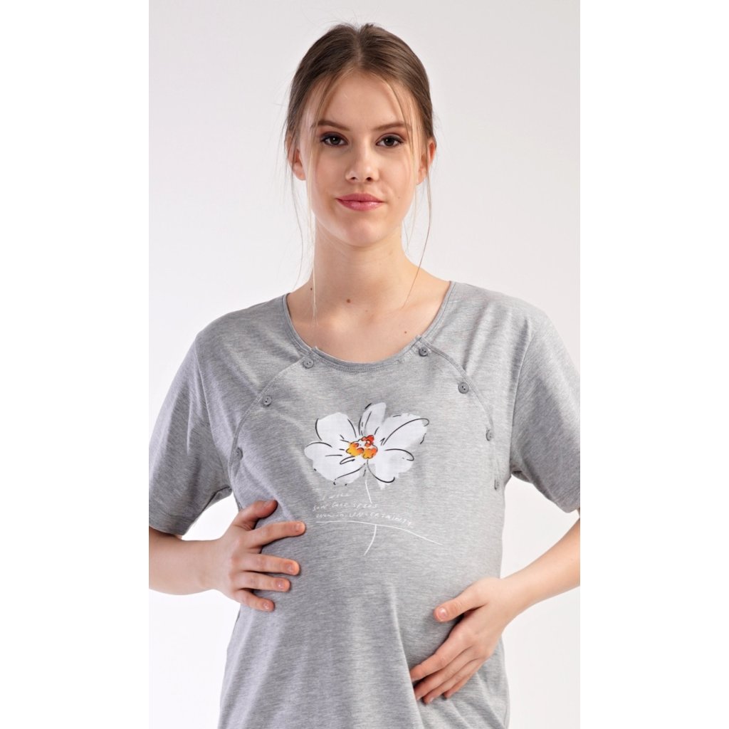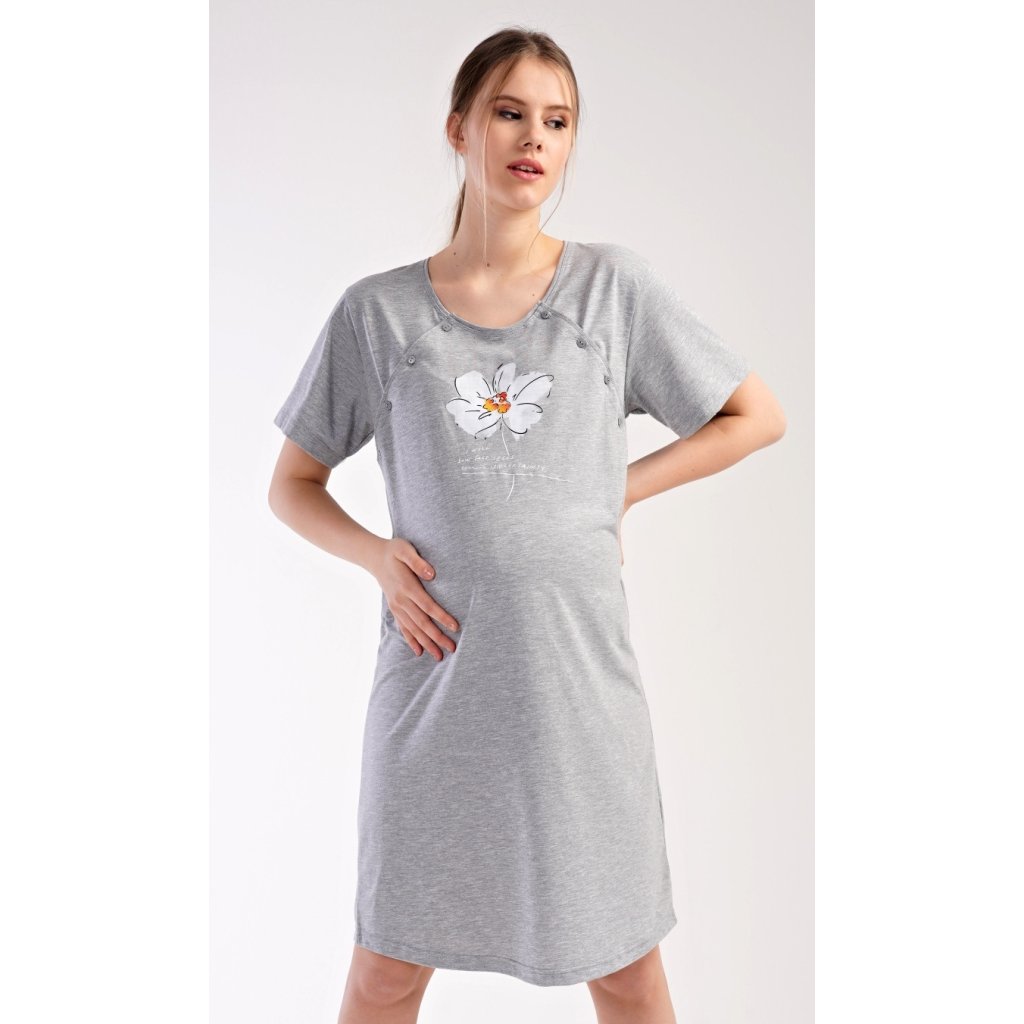 Dámská mateřská noční košile Helena. Noční košile je svým střihem určená na dobu těhotenství, do porodnice i ke kojení. Ke kojení slouží průstřihy po stranách košile, které jsou uzavíratelné na knoflíky. Přední díl košile zdobí květ a drobný nápis. Použitý materiál je příjemný a poddajný na dotek. Obsah bavlny je 70%.