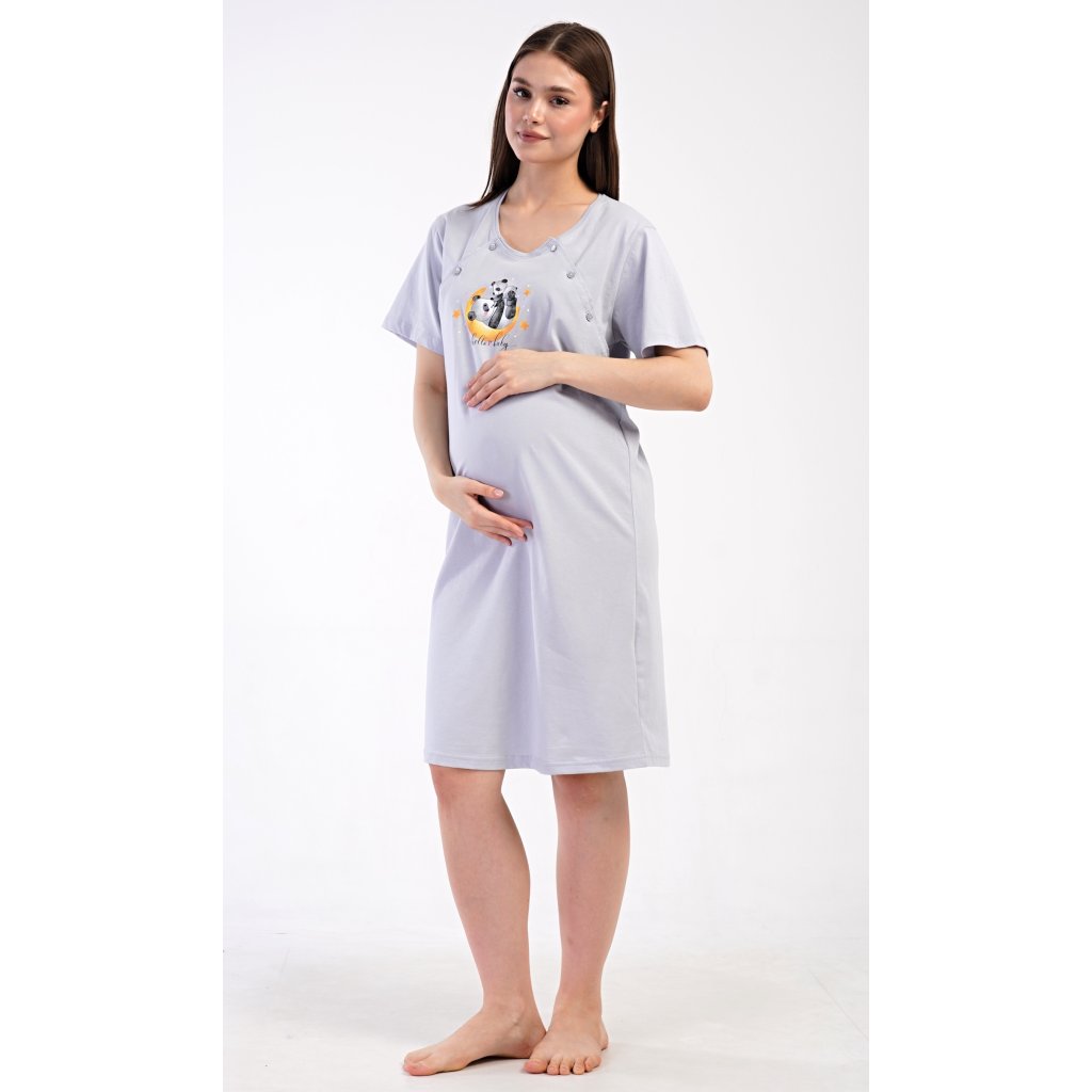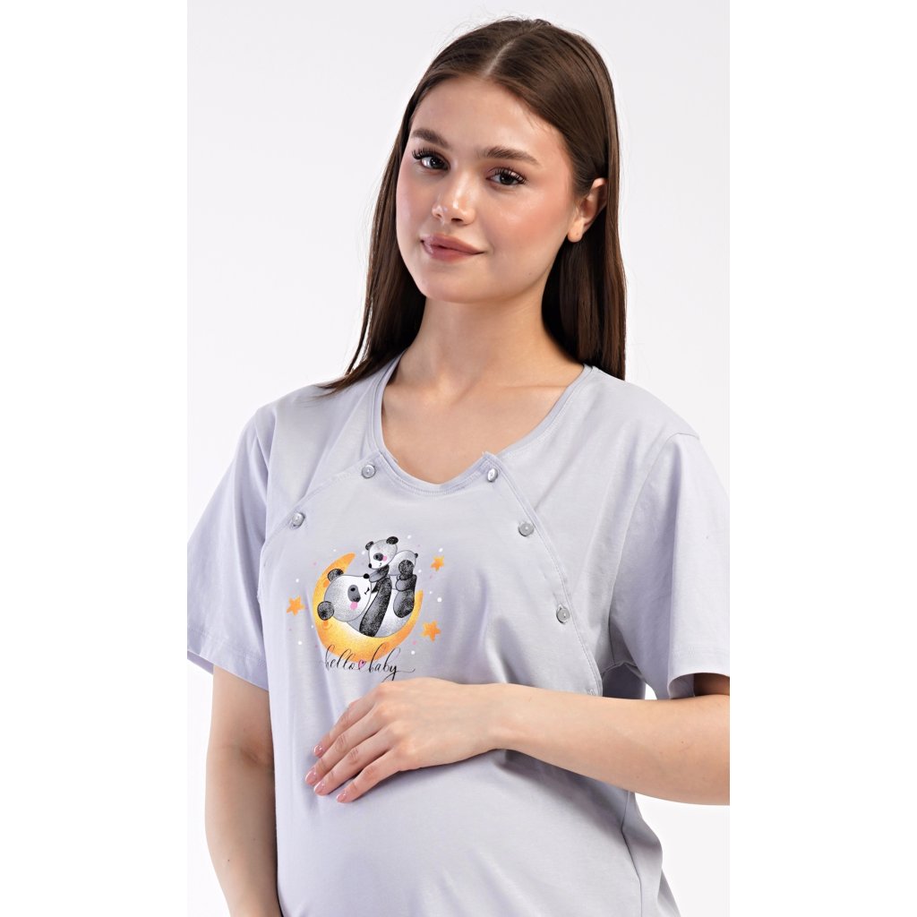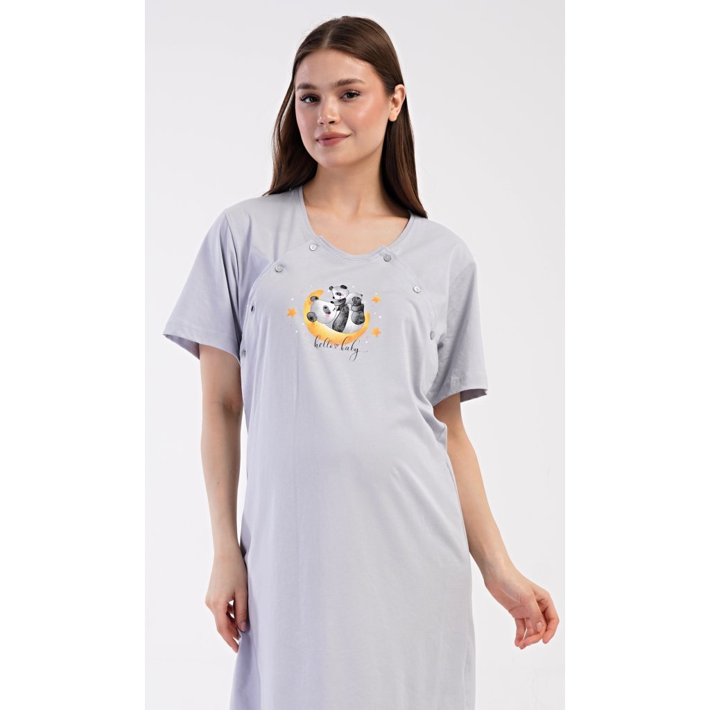 Dámská bavlněná mateřská noční košile Hello baby. Noční košile je svým střihem určená na dobu těhotenství, do porodnice i ke kojení. Ke kojení slouží průstřihy po stranách košile, které jsou uzavíratelné na knoflíky. Jednobarevná košile je ozdobena obrázkem pandy s miminkem. Použitý materiál s podílem bavlny 100% je příjemný a poddajný na dotek.
