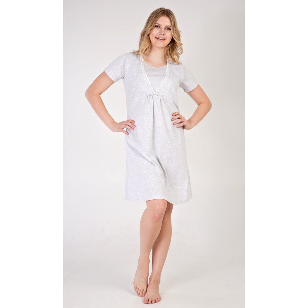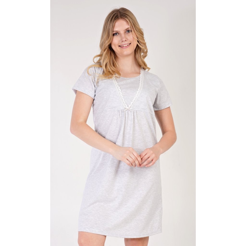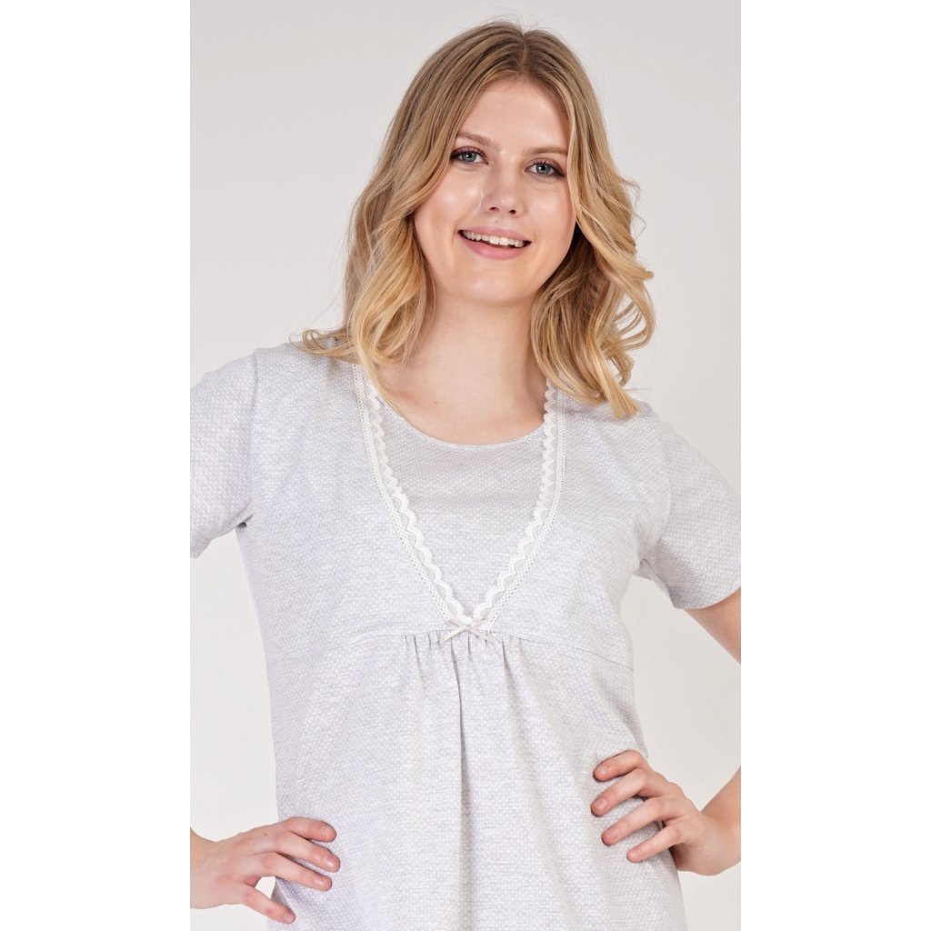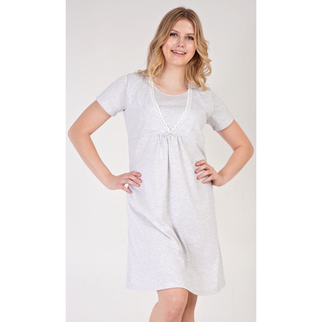 Dámská mateřská noční košile s krátkým rukávem Jana. Noční košile je potištěna drobnými puntíčky. Je přizpůsobená ke kojení, v oblasti prsou má otvory pro pohodlnou a rychlou manipulaci, které jsou ozdobené jemnou krajkou. Mateřská košile je díky volnějšímu střihu vhodná i v těhotenství a do porodnice. Materiál s podílem bavlny 70% je poddajný a příjemný na dotek.