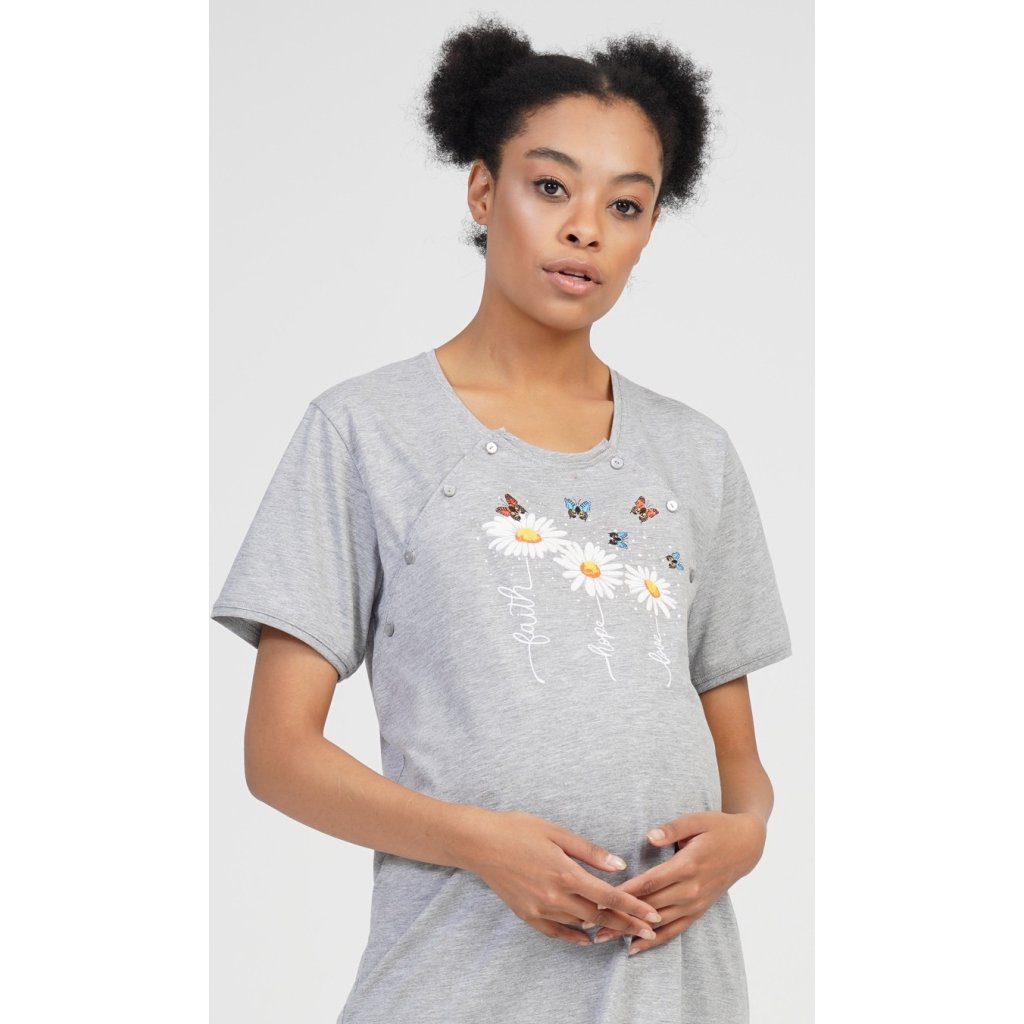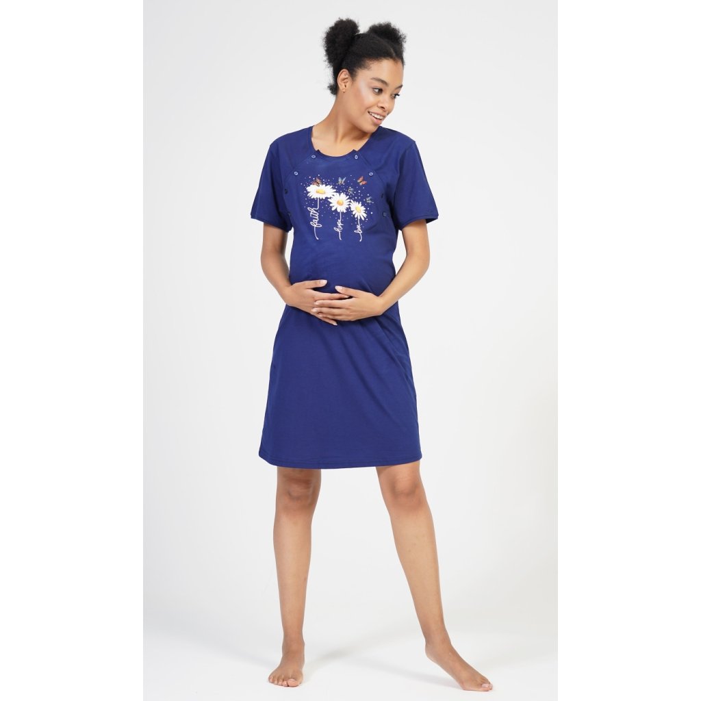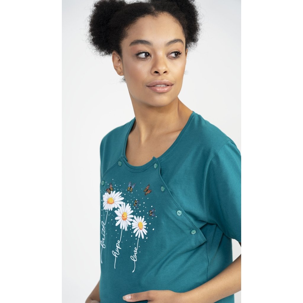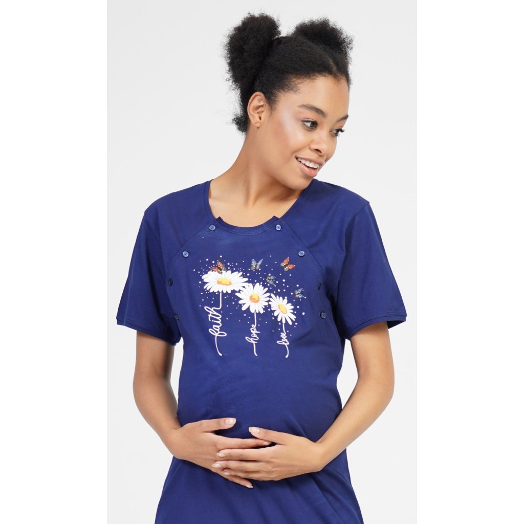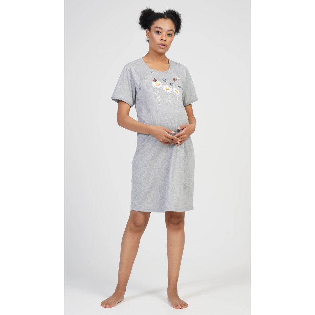 Dámská mateřská noční košile Kopretiny. Noční košile je svým střihem určená na dobu těhotenství, do porodnice i ke kojení. Ke kojení slouží průstřihy po stranách košile, které jsou uzavíratelné na knoflíky. Na hrudníku jsou vyobrazeny tři kopretinky, jejich stonky tvoří nápisy Faith - Hope - Love. Použitý materiál je příjemný a poddajný na dotek. Obsah bavlny u světle šedé barvy je 70%, ostatní barevné kombinace mají 100%.