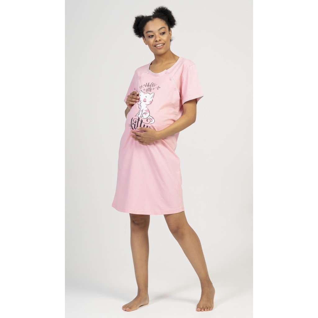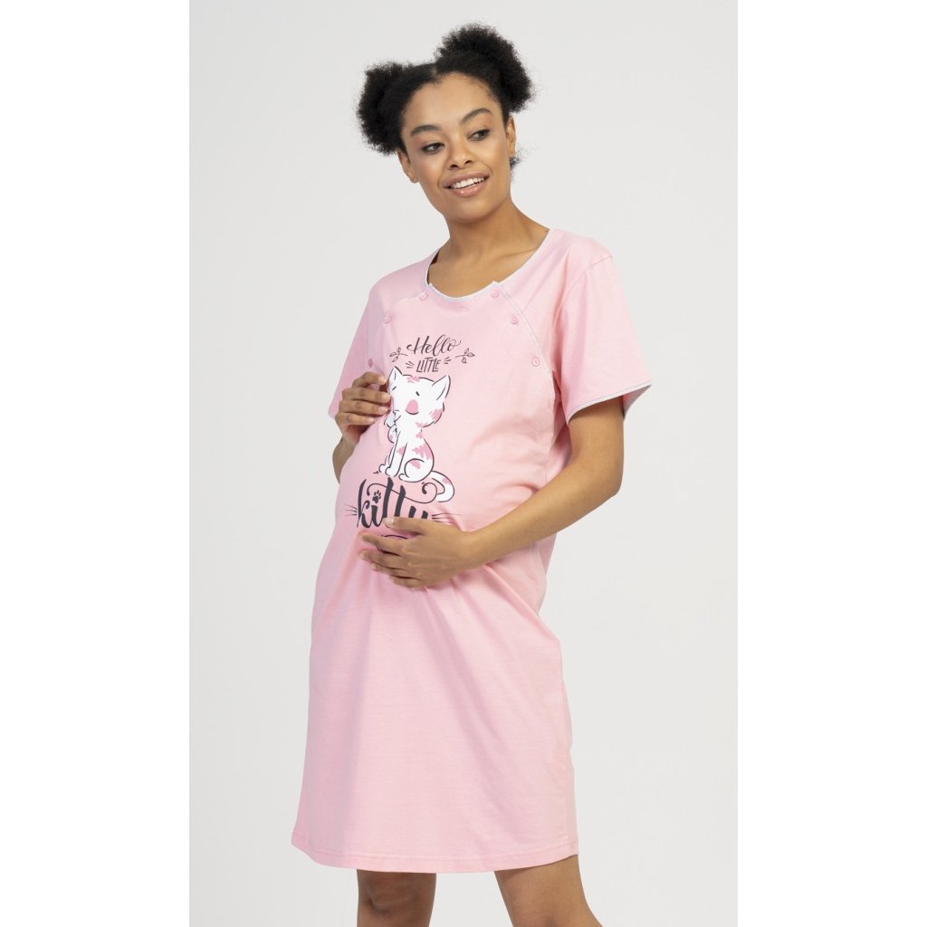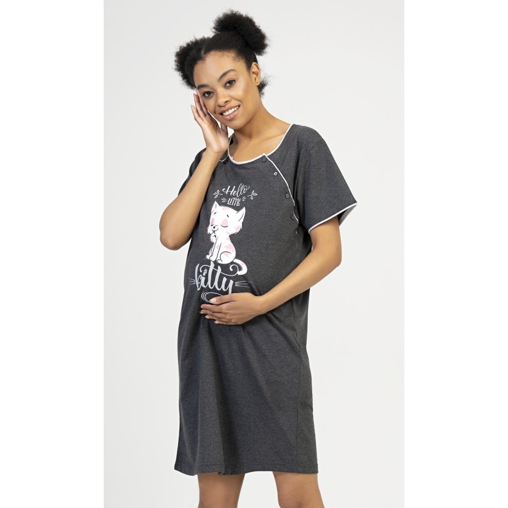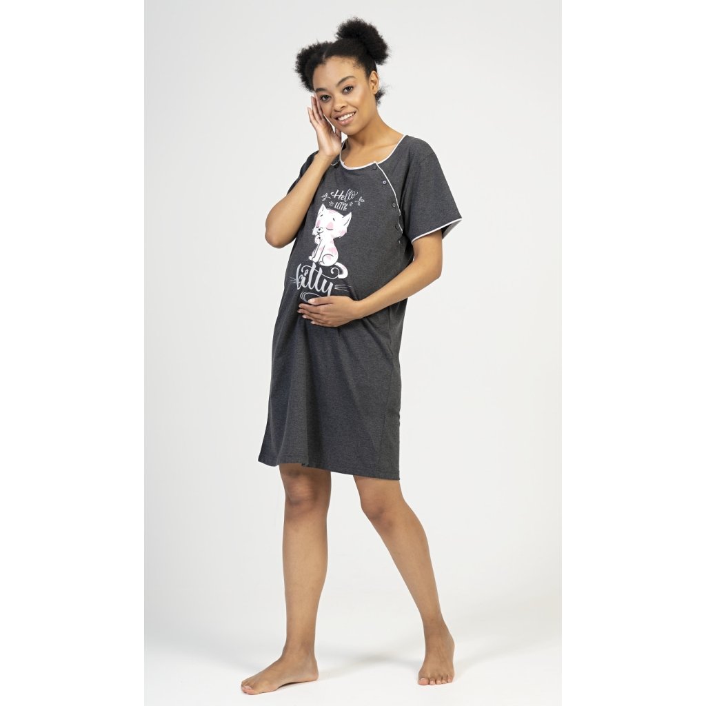 Dámská mateřská noční košile Little cat. Mateřská noční košilka je svým střihem určená na dobu těhotenství, do porodnice i ke kojení. Ke kojení slouží průstřihy po stranách košile, které jsou uzavíratelné na knoflíky. Na hrudi je obrázek roztomilé kočičky s nápisem 'Hello Little kitty'. Použitý materiál s podílem bavlny 100% (70% u tmavě šedé barvy) je příjemný a poddajný na dotek.