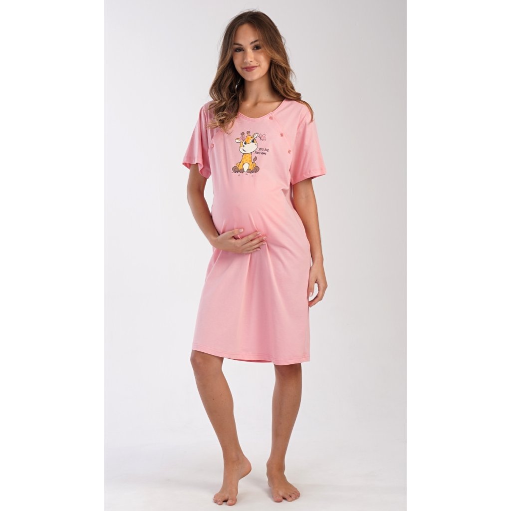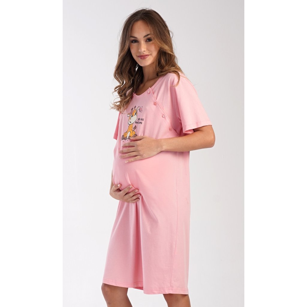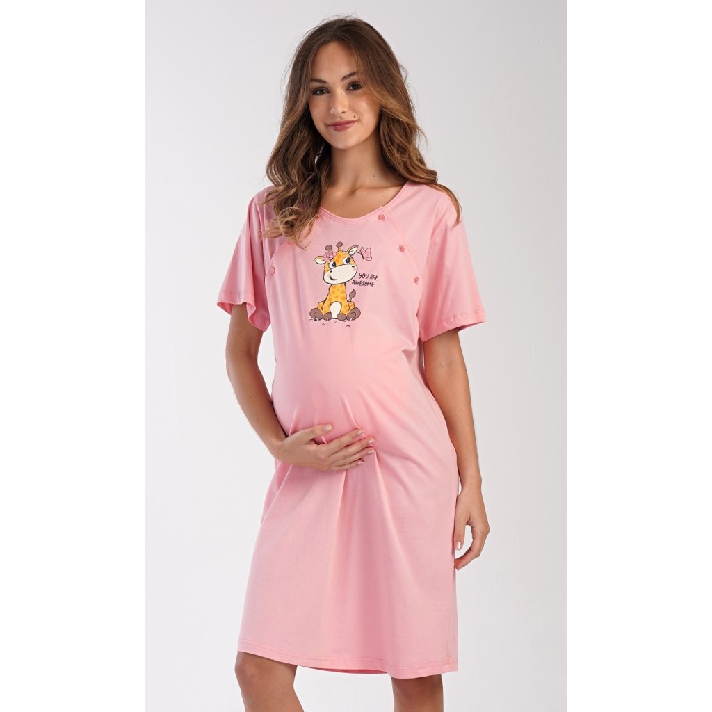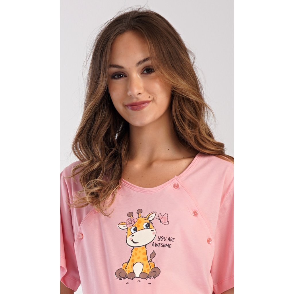 Dámská bavlněná mateřská noční košile Malá žirafa. Noční košile je svým střihem určená na dobu těhotenství, do porodnice i ke kojení. Ke kojení slouží průstřihy po stranách košile, které jsou uzavíratelné na knoflíky. Přední díl košile zdobí obrázek malé žirafy a nápis 'You are awesome'. Použitý materiál s podílem bavlny 100% je příjemný a poddajný na dotek.