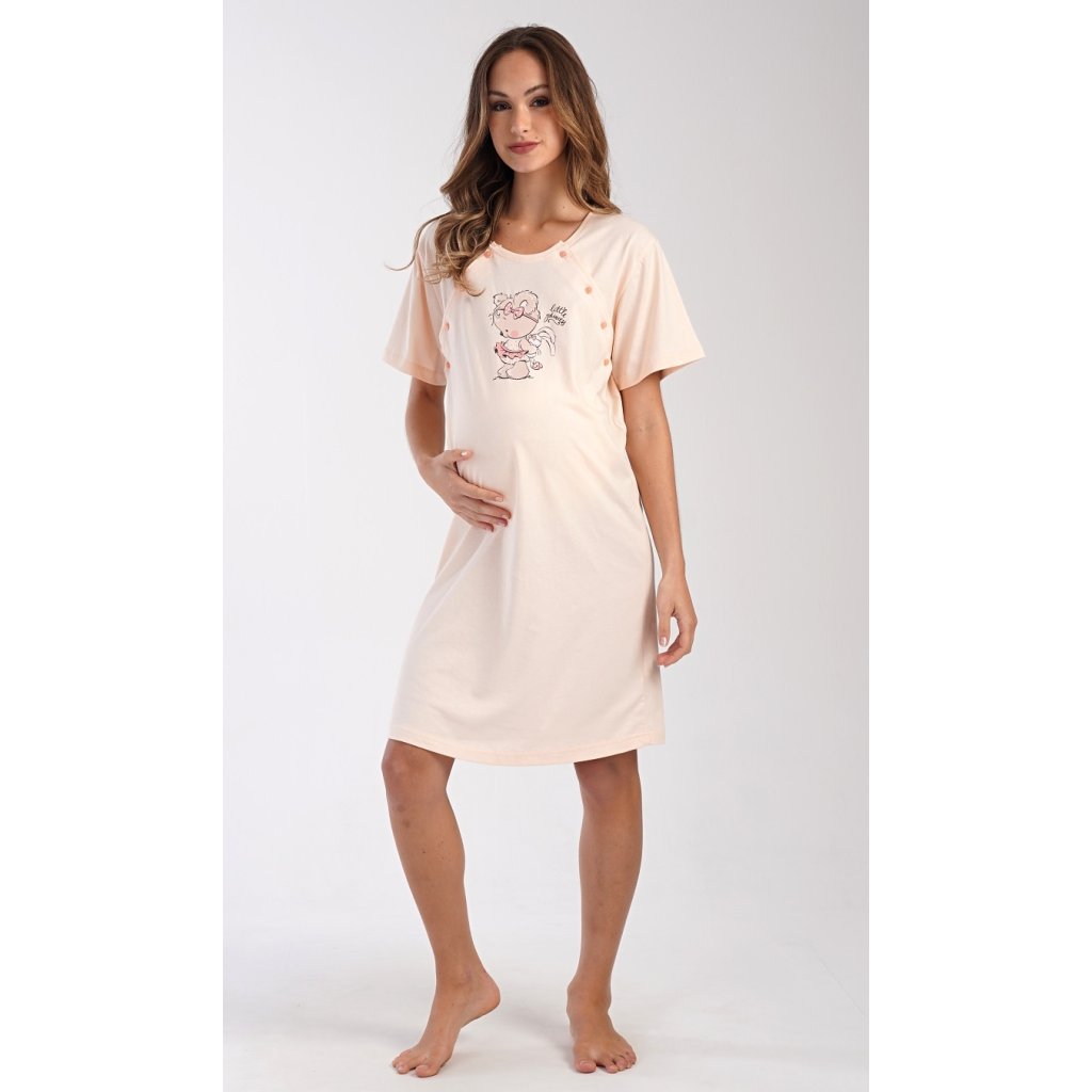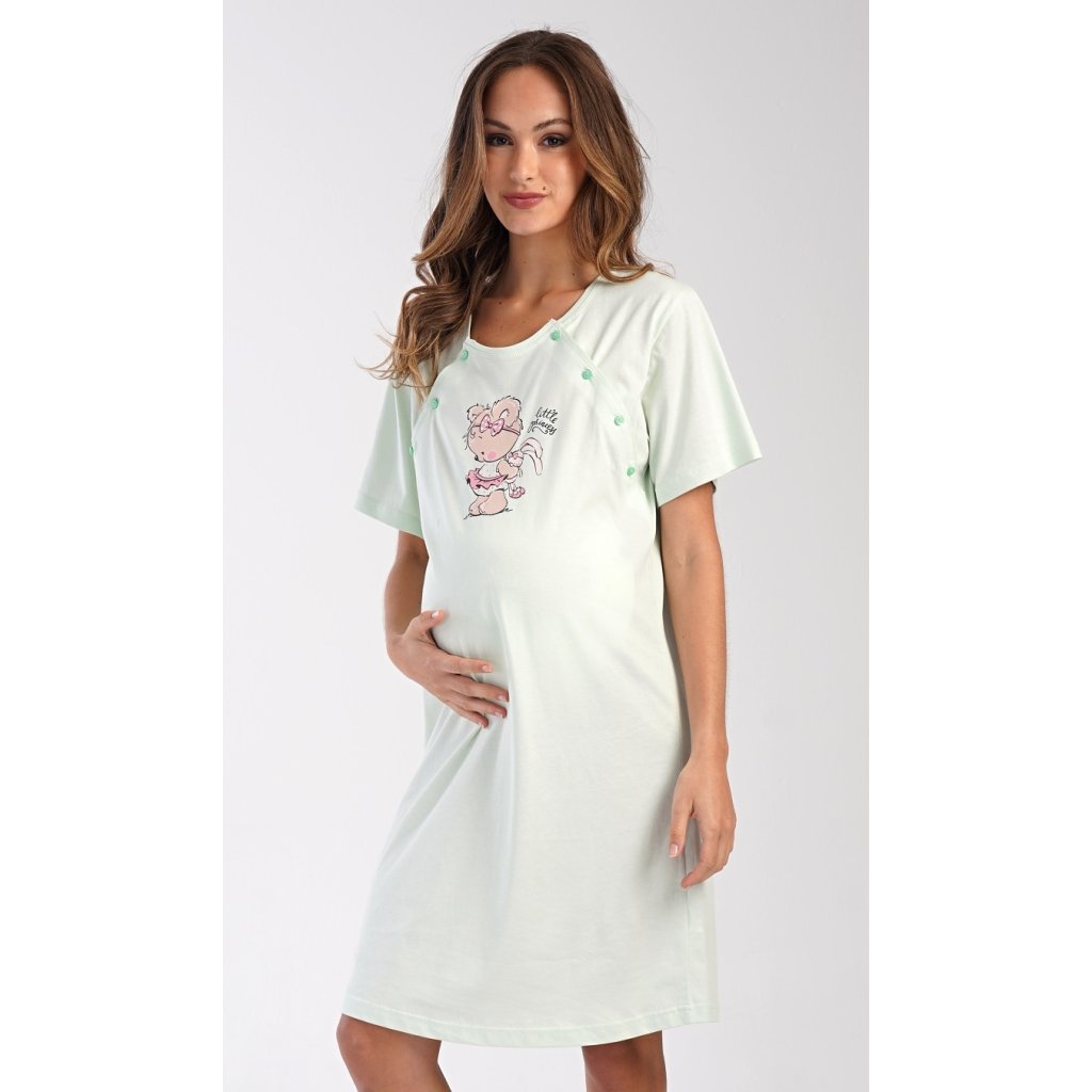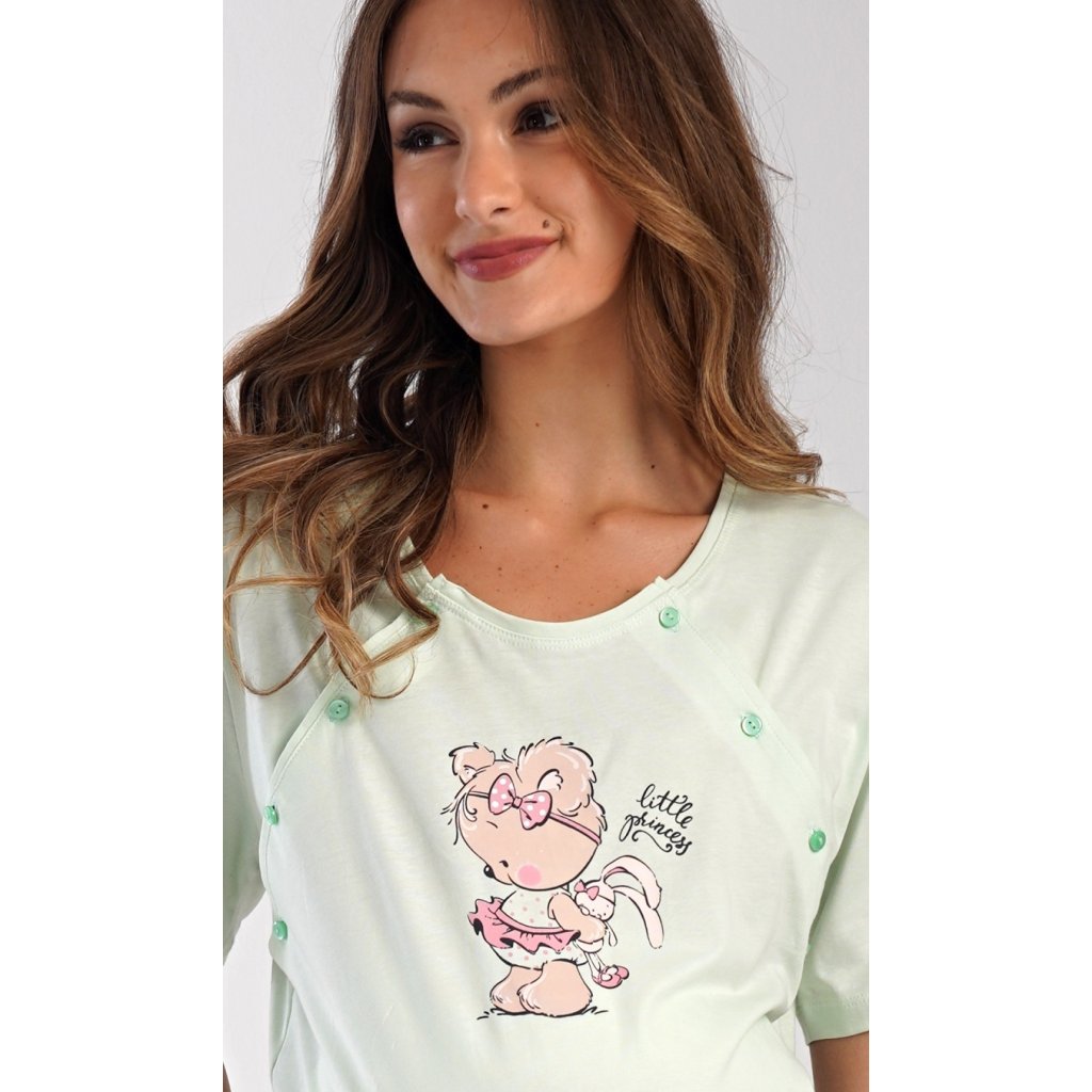 Dámská bavlněná mateřská noční košile Maruška. Noční košile je svým střihem určená na dobu těhotenství, do porodnice i ke kojení. Ke kojení slouží průstřihy po stranách košile, které jsou uzavíratelné na knoflíky. Jednobarevná košile je na hrudi ozdobena obrázkem malého medvídka. Použitý materiál s podílem bavlny 100% je příjemný a poddajný na dotek.
