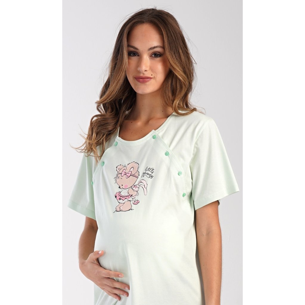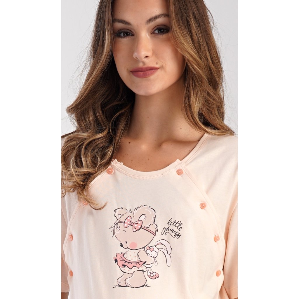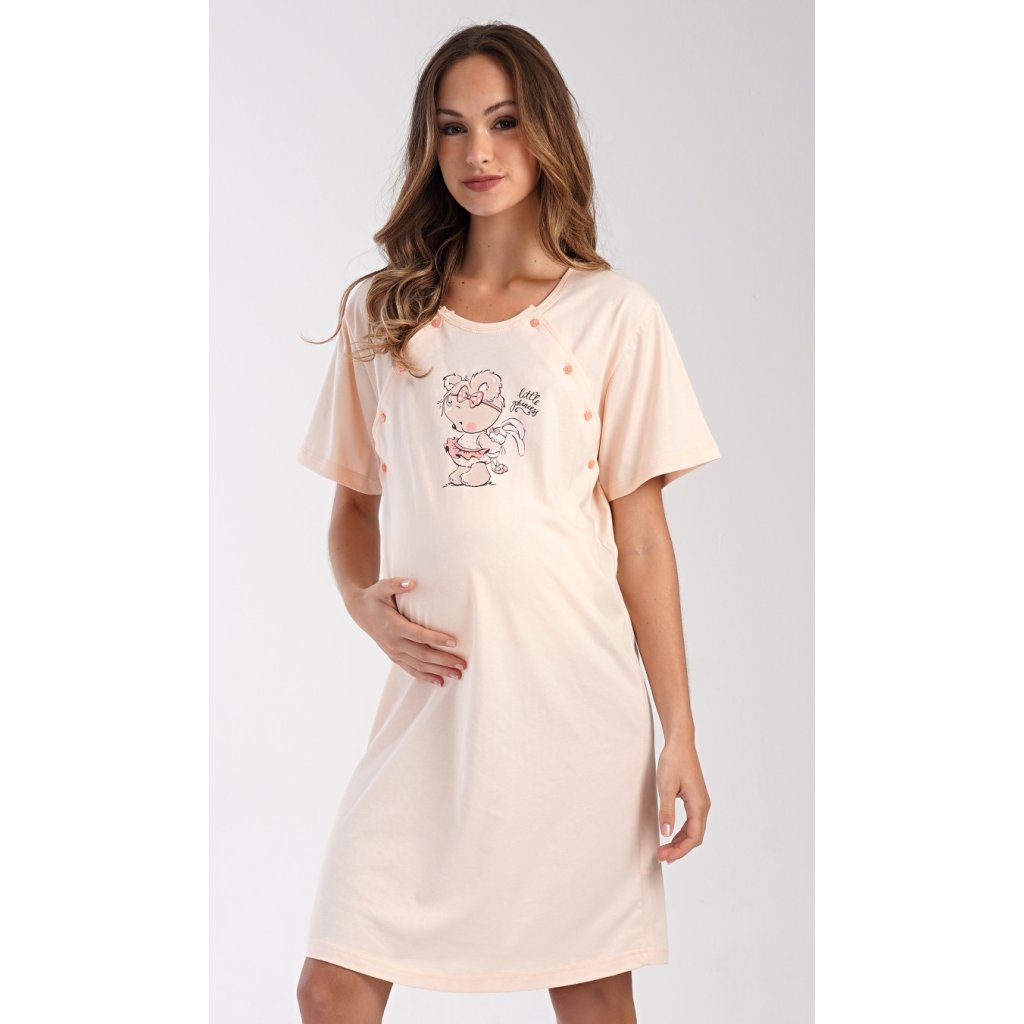Dámská bavlněná mateřská noční košile Maruška. Noční košile je svým střihem určená na dobu těhotenství, do porodnice i ke kojení. Ke kojení slouží průstřihy po stranách košile, které jsou uzavíratelné na knoflíky. Jednobarevná košile je na hrudi ozdobena obrázkem malého medvídka. Použitý materiál s podílem bavlny 100% je příjemný a poddajný na dotek.