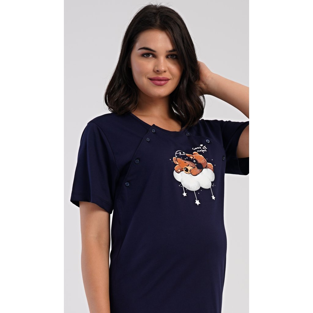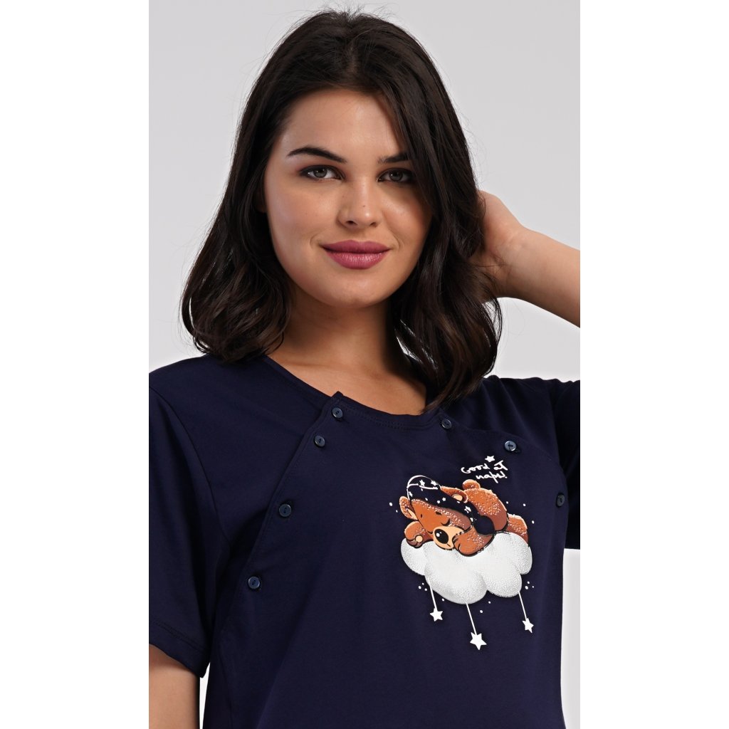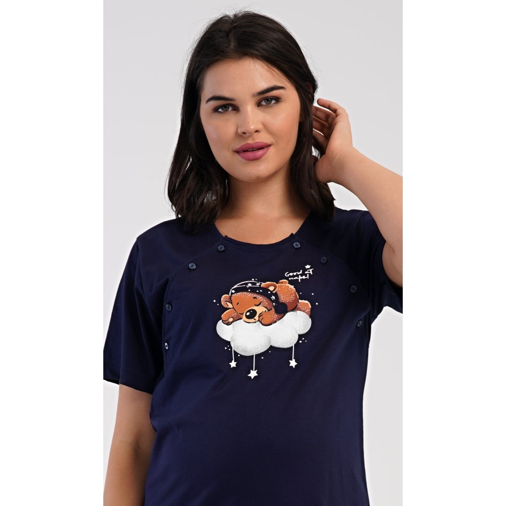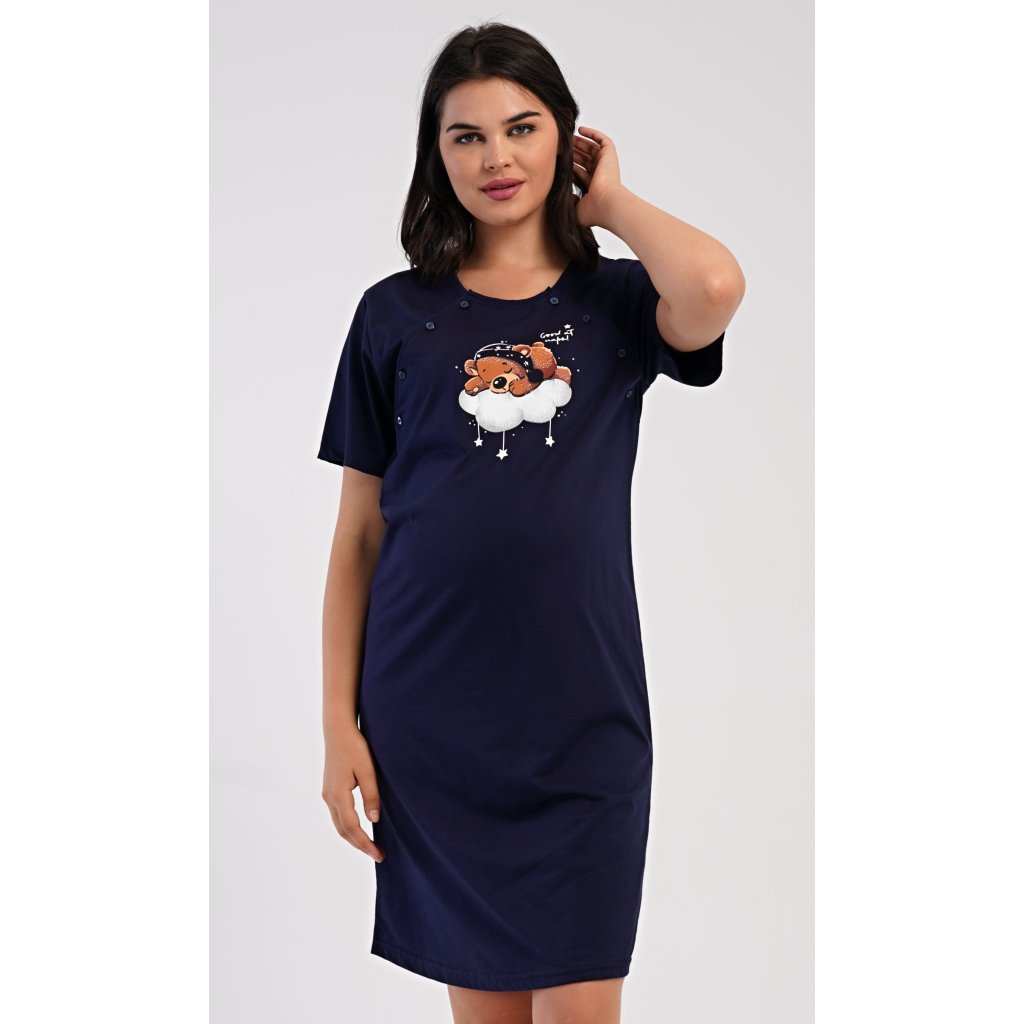 Dámská bavlněná mateřská noční košile s krátkým rukávem Méďa na obláčku. Noční košile je svým střihem určená na dobu těhotenství, do porodnice i ke kojení. Ke kojení slouží průstřihy po stranách košile, které jsou uzavíratelné na knoflíky. Jednobarevná košile je ozdobena obrázkem medvídka, který odpočívá na obláčku. Použitý materiál s podílem bavlny 100% je příjemný a poddajný na dotek.