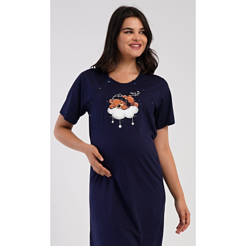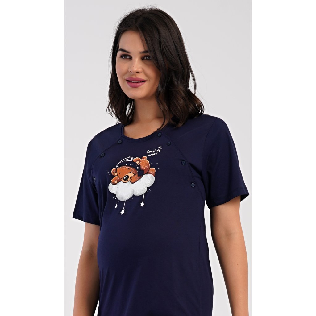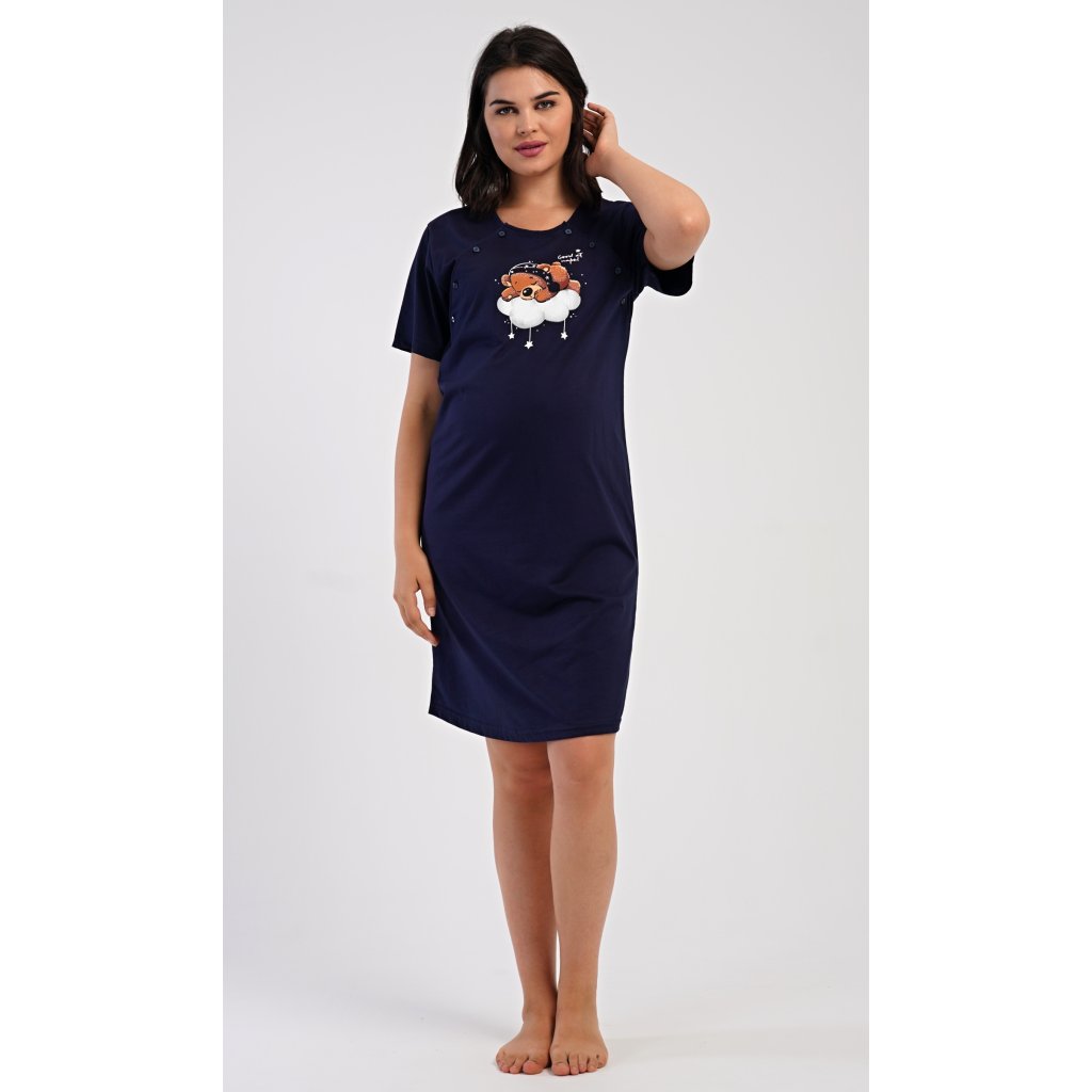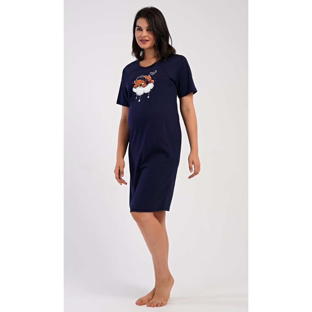 Dámská bavlněná mateřská noční košile s krátkým rukávem Méďa na obláčku. Noční košile je svým střihem určená na dobu těhotenství, do porodnice i ke kojení. Ke kojení slouží průstřihy po stranách košile, které jsou uzavíratelné na knoflíky. Jednobarevná košile je ozdobena obrázkem medvídka, který odpočívá na obláčku. Použitý materiál s podílem bavlny 100% je příjemný a poddajný na dotek.