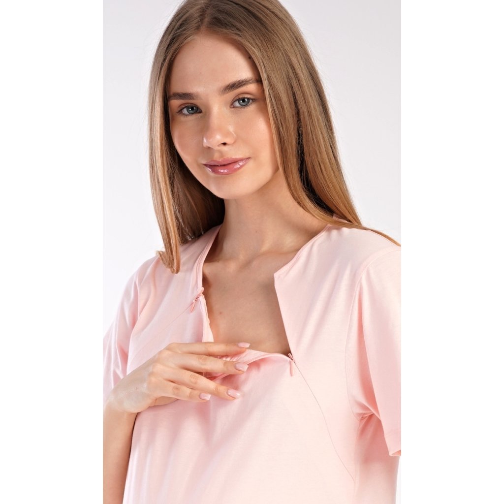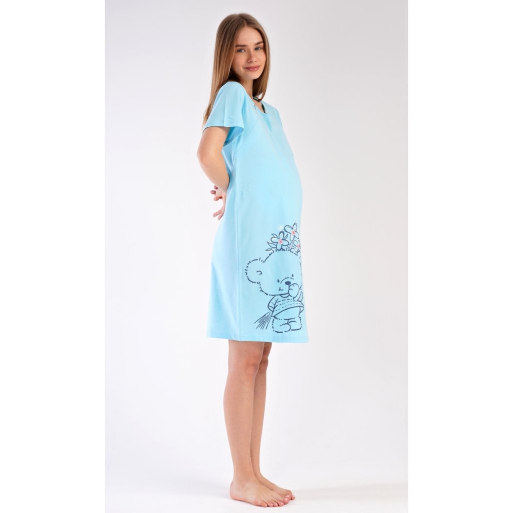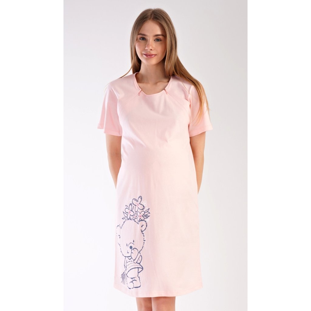 Dámská bavlněná mateřská noční košile Méďa s kytkou. Noční košile je svým střihem určená na dobu těhotenství, do porodnice i ke kojení. Ke kojení slouží průstřihy po stranách košile, které jsou uzavíratelné na zipy. Přední díl košile zdobí obrázek medvěda s kyticí za zády. Použitý materiál s podílem bavlny 100% je příjemný a poddajný na dotek.