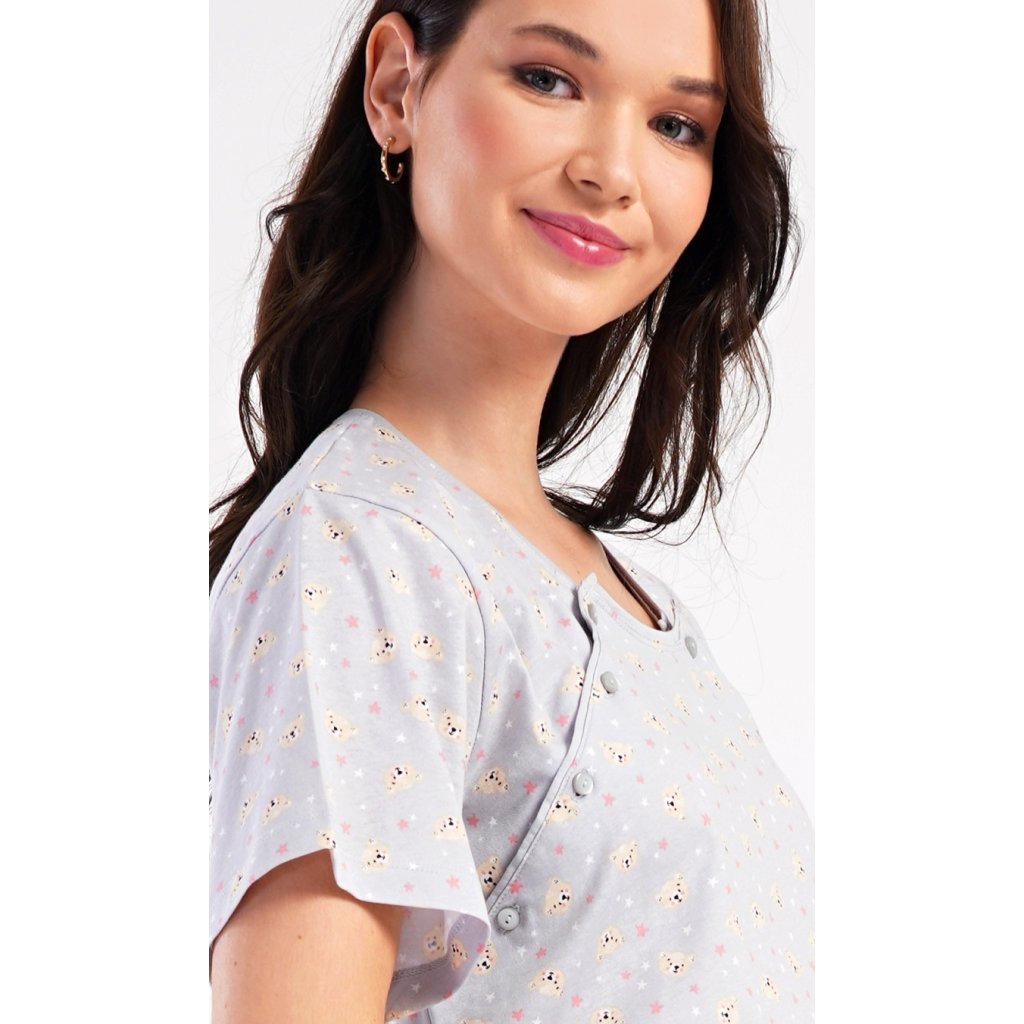 Dámská bavlněná mateřská noční košile Méďové. Noční košile je svým střihem určená na dobu těhotenství, do porodnice i ke kojení. Ke kojení slouží průstřihy po stranách košile, které jsou uzavíratelné na knoflíky. Košile je potištěna malými medvídky. Použitý materiál s podílem bavlny 100% je příjemný a poddajný na dotek.