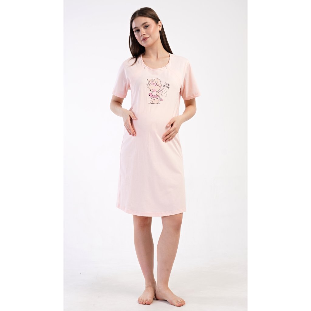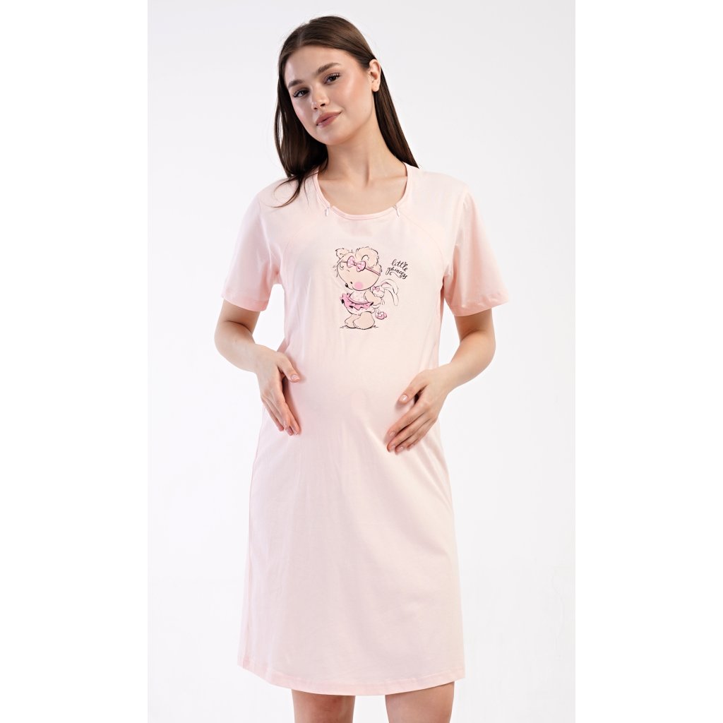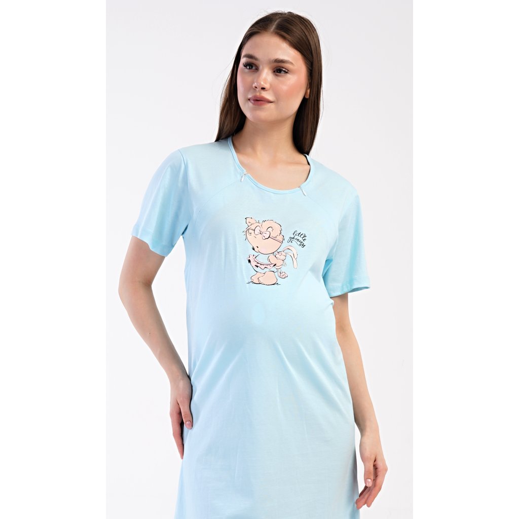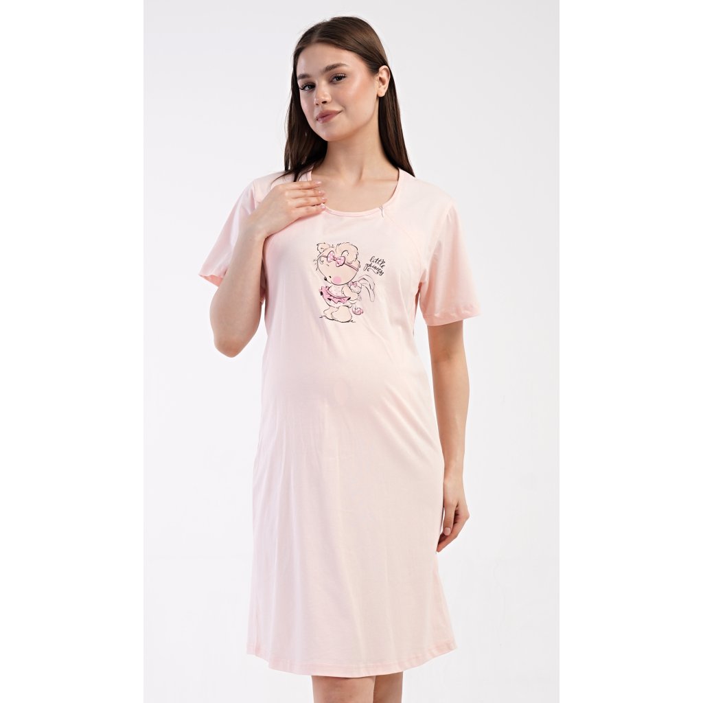 Dámská bavlněná mateřská noční košile Miláček. Noční košile je svým střihem určená na dobu těhotenství, do porodnice i ke kojení. Ke kojení slouží průstřihy po stranách košile, které jsou uzavíratelné na zip. Přední díl košile zdobí obrázek roztomilého medvídka. Použitý materiál s podílem bavlny 100% je příjemný a poddajný na dotek.