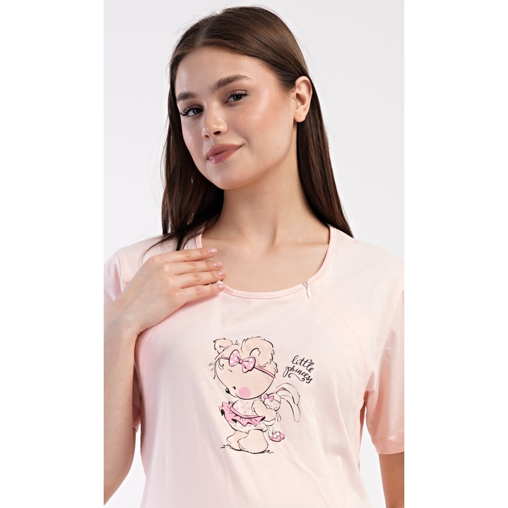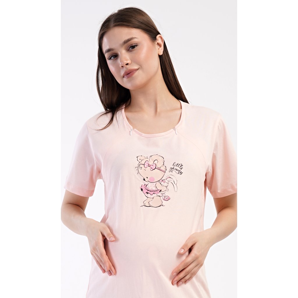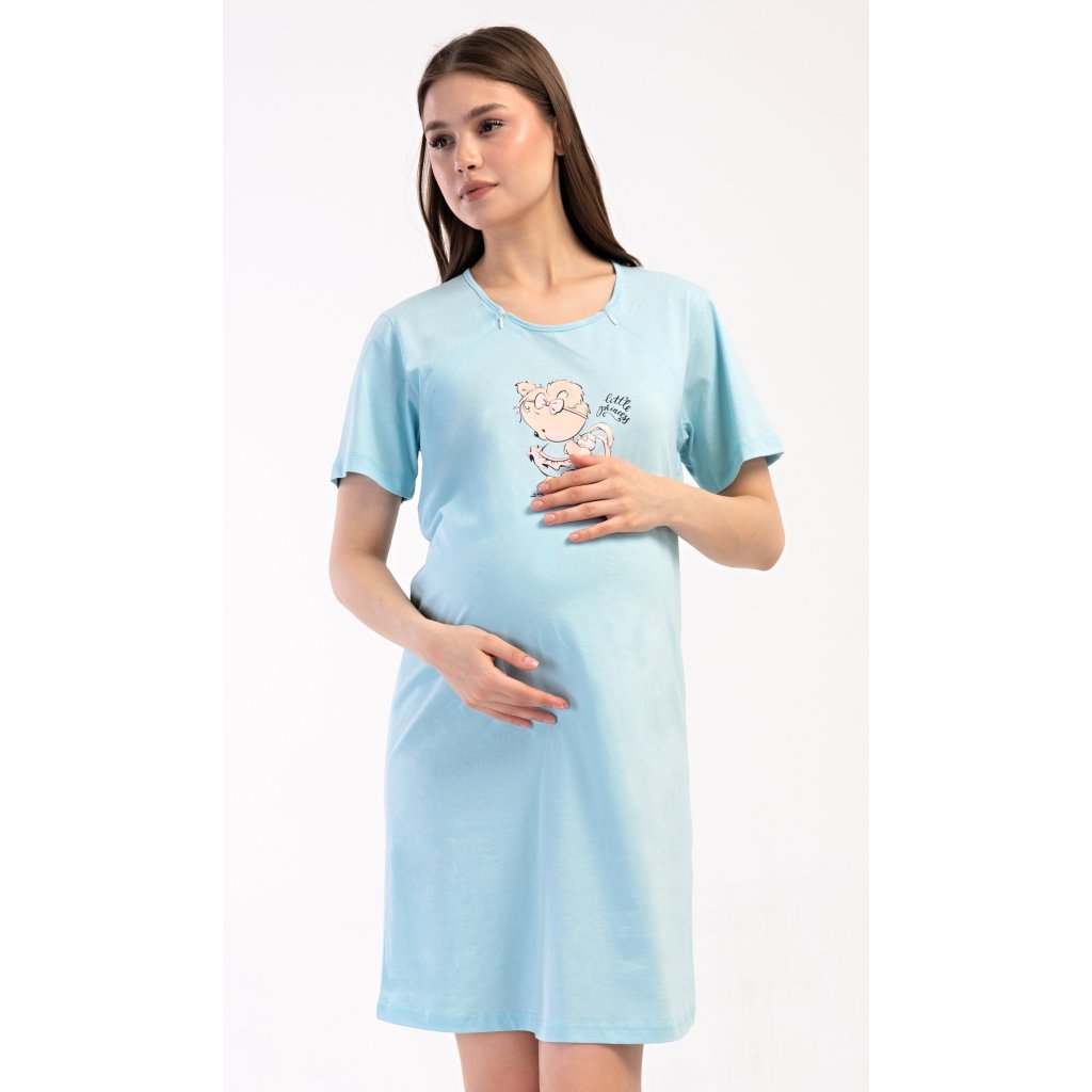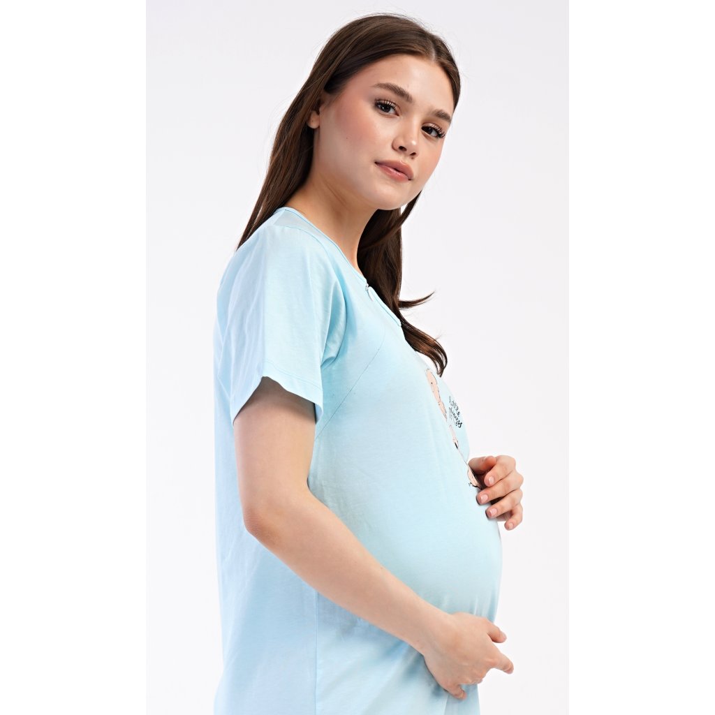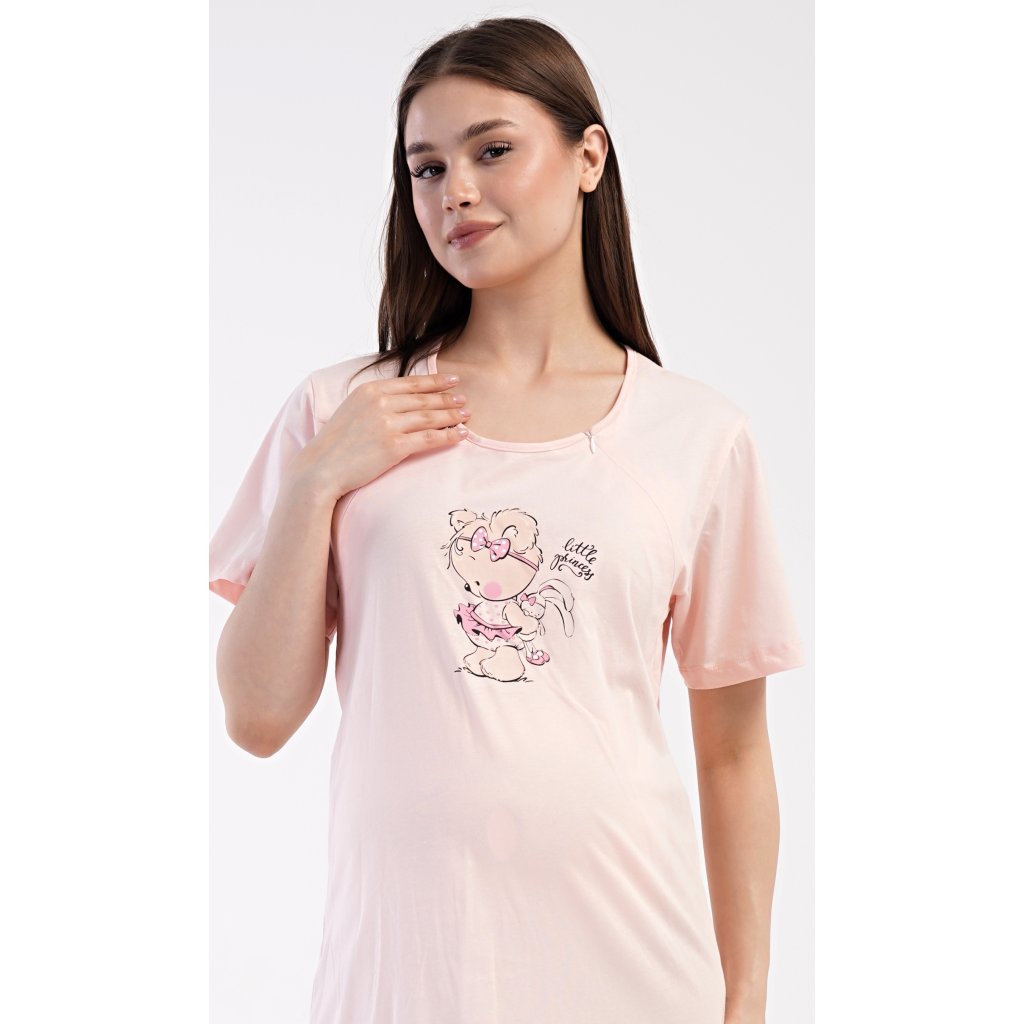 Dámská bavlněná mateřská noční košile Miláček. Noční košile je svým střihem určená na dobu těhotenství, do porodnice i ke kojení. Ke kojení slouží průstřihy po stranách košile, které jsou uzavíratelné na zip. Přední díl košile zdobí obrázek roztomilého medvídka. Použitý materiál s podílem bavlny 100% je příjemný a poddajný na dotek.