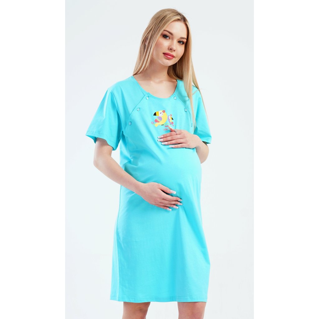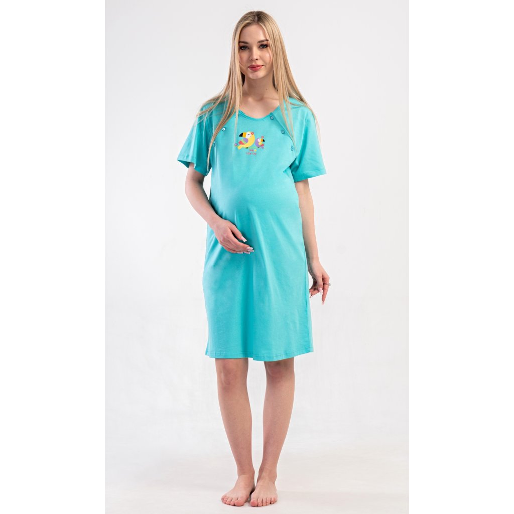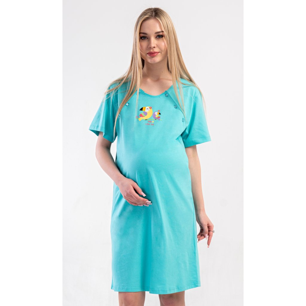 Dámská bavlněná mateřská noční košile Papoušek. Noční košile je svým střihem určená na dobu těhotenství, do porodnice i ke kojení. Ke kojení slouží průstřihy po stranách košile, které jsou uzavíratelné na knoflíky. Jednobarevná košile je na hrudi ozdobena obrázkem papouška. Použitý materiál s podílem bavlny 100% je příjemný a poddajný na dotek.
