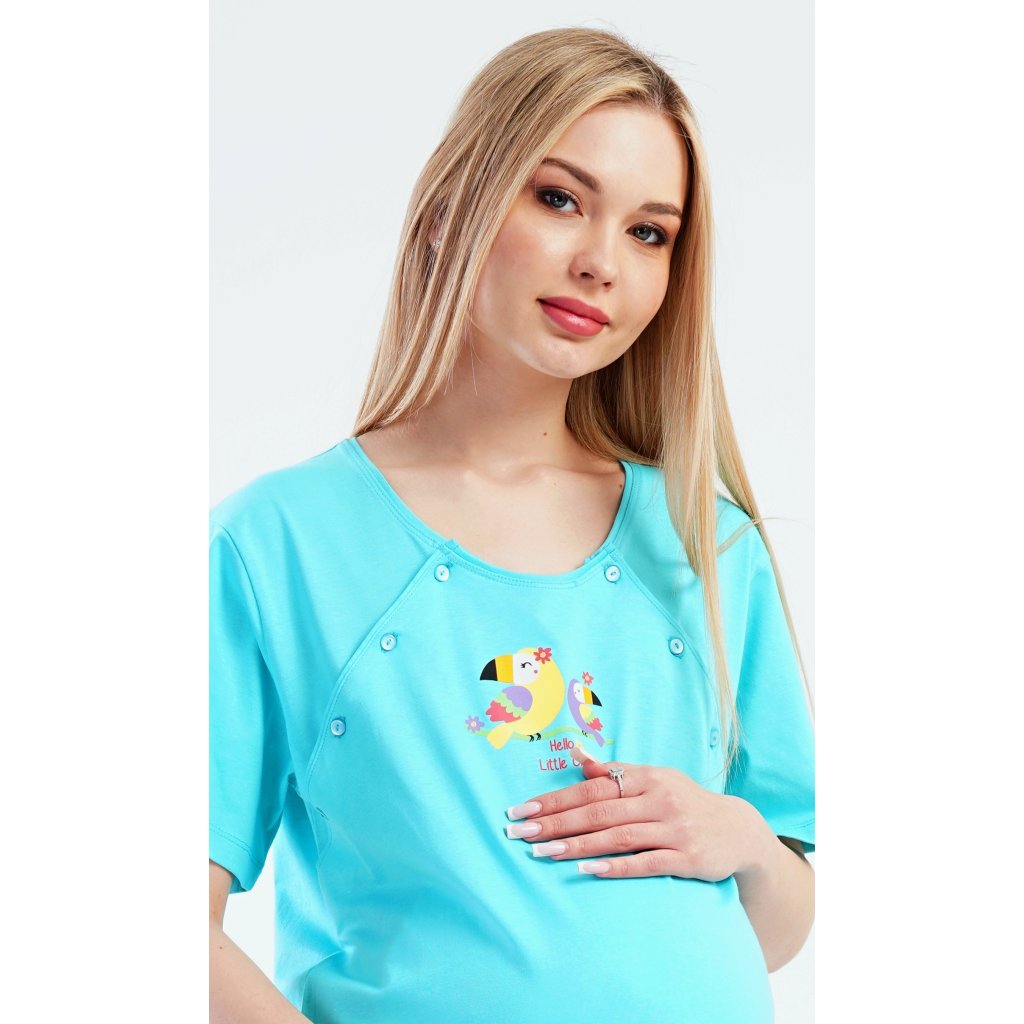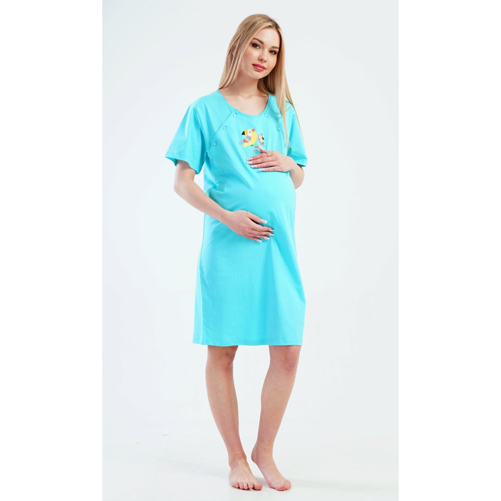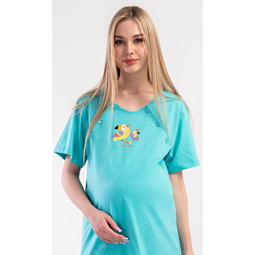 Dámská bavlněná mateřská noční košile Papoušek. Noční košile je svým střihem určená na dobu těhotenství, do porodnice i ke kojení. Ke kojení slouží průstřihy po stranách košile, které jsou uzavíratelné na knoflíky. Jednobarevná košile je na hrudi ozdobena obrázkem papouška. Použitý materiál s podílem bavlny 100% je příjemný a poddajný na dotek.