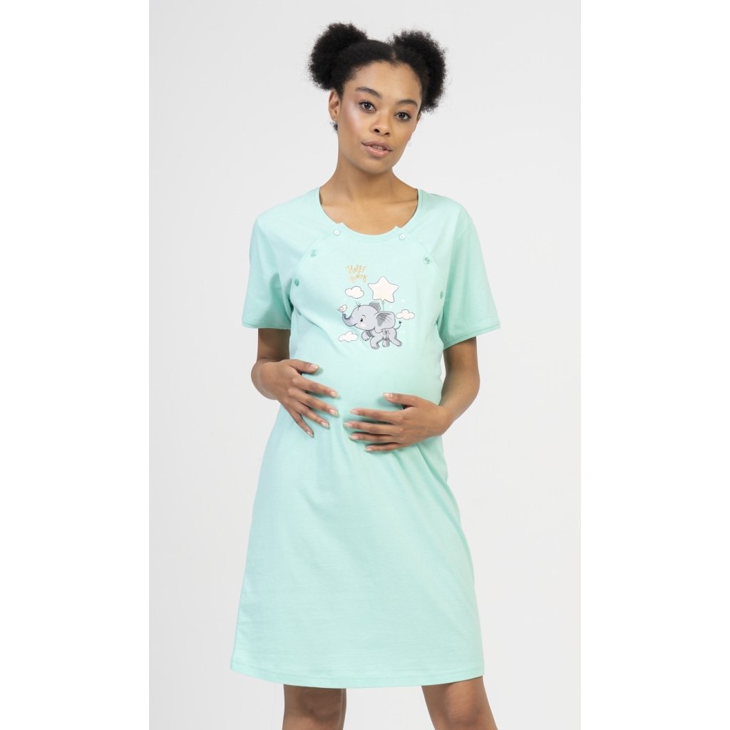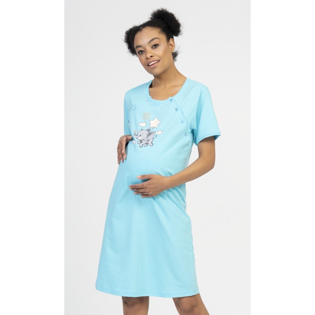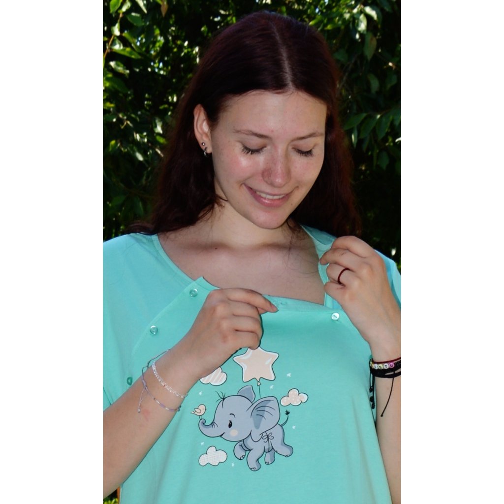 Dámská bavlněná mateřská noční košile Slůně. Noční košile je svým střihem určená na dobu těhotenství, do porodnice i ke kojení. Ke kojení slouží průstřihy po stranách košile, které jsou uzavíratelné na knoflíky. Na hrudi je roztomilý obrázek slůněte, které se vznáší na balónku mezi obláčky a společnost mu dělá malý ptáček. Obrázek doplňuje nápis Hello baby. Použitý materiál s obsahem bavlny 100% je příjemný a poddajný na dotek.