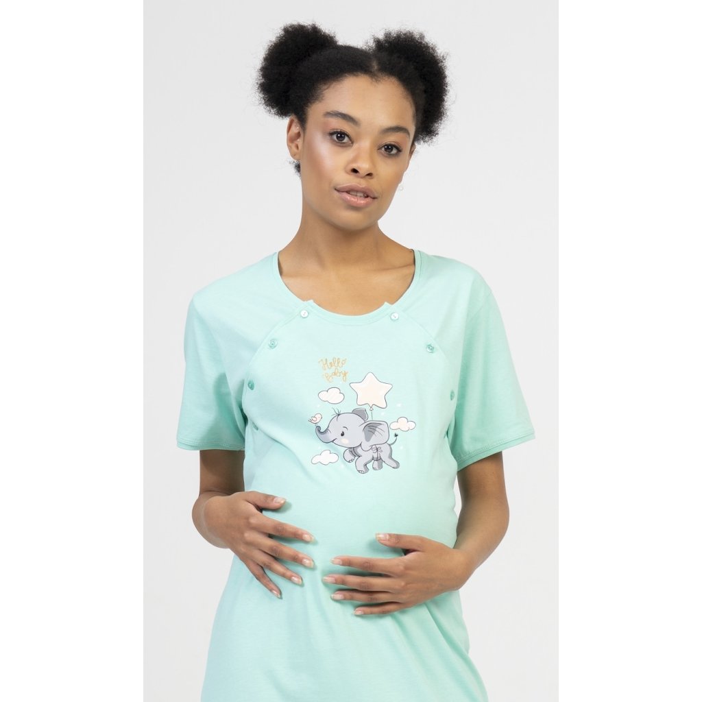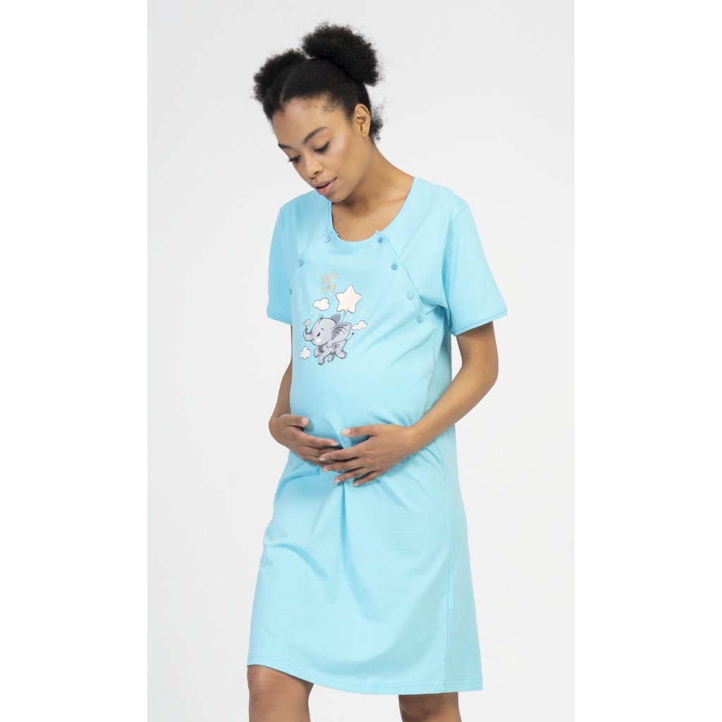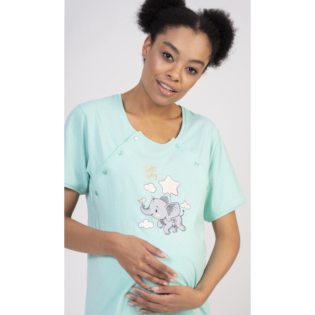Dámská bavlněná mateřská noční košile Slůně. Noční košile je svým střihem určená na dobu těhotenství, do porodnice i ke kojení. Ke kojení slouží průstřihy po stranách košile, které jsou uzavíratelné na knoflíky. Na hrudi je roztomilý obrázek slůněte, které se vznáší na balónku mezi obláčky a společnost mu dělá malý ptáček. Obrázek doplňuje nápis Hello baby. Použitý materiál s obsahem bavlny 100% je příjemný a poddajný na dotek.