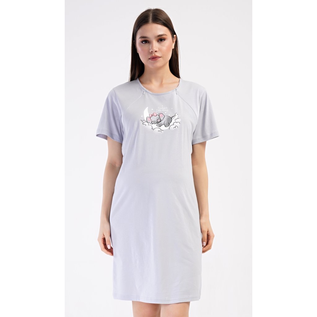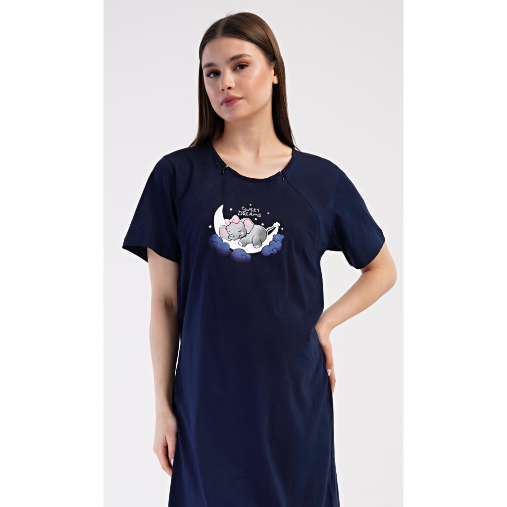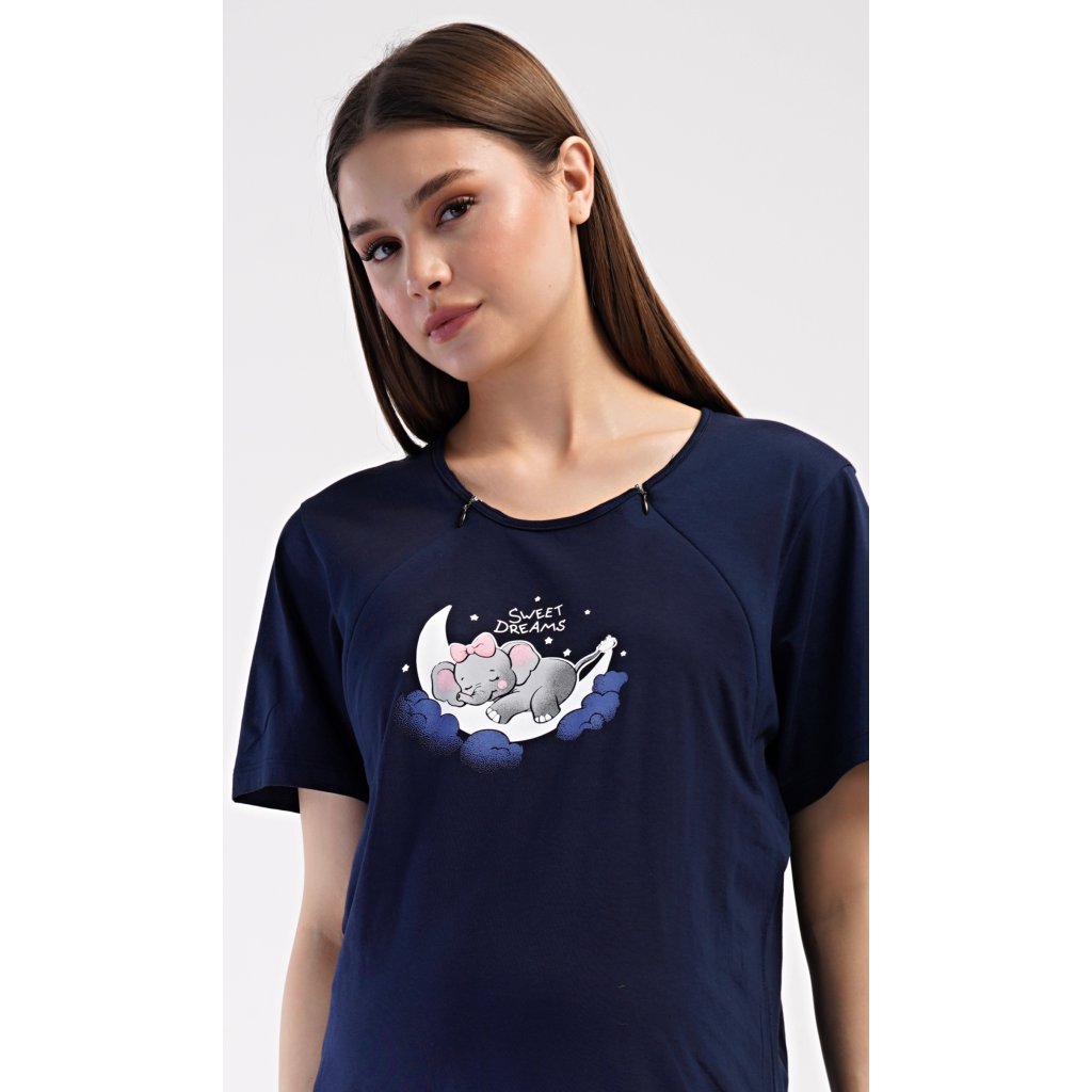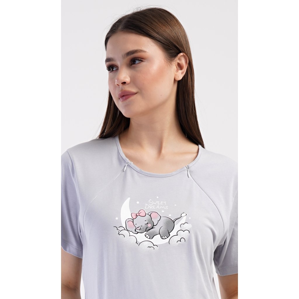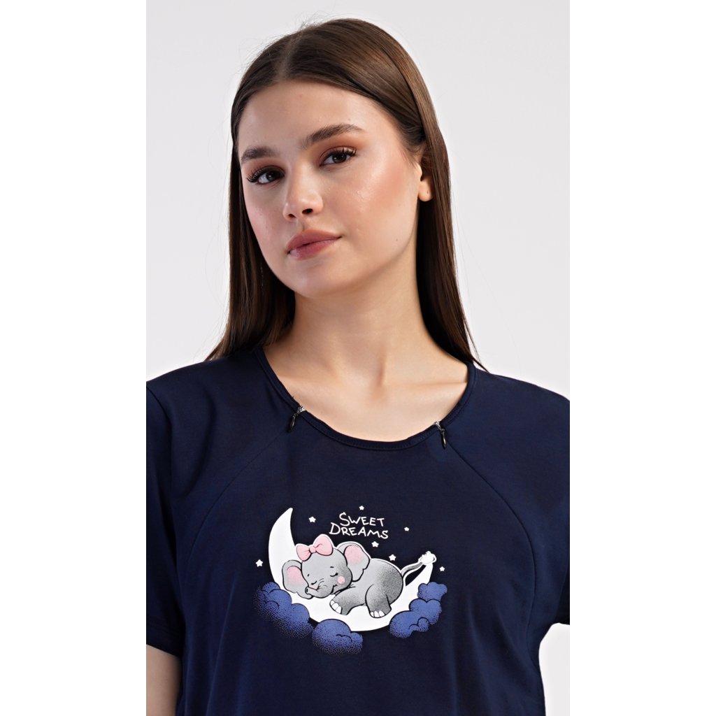 Dámská bavlněná mateřská noční košile Sweet dreams. Noční košile je svým střihem určená na dobu těhotenství, do porodnice i ke kojení. Ke kojení slouží průstřihy po stranách košile, které jsou uzavíratelné na zip. Přední díl košile zdobí obrázek slůněte, které odpočívá na měsíci. Použitý materiál s podílem bavlny 100% je příjemný a poddajný na dotek.