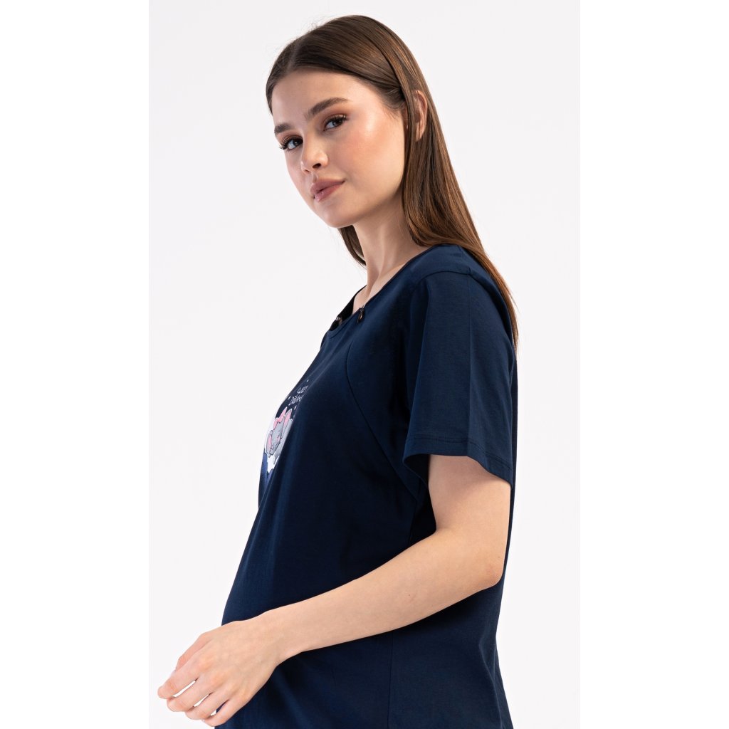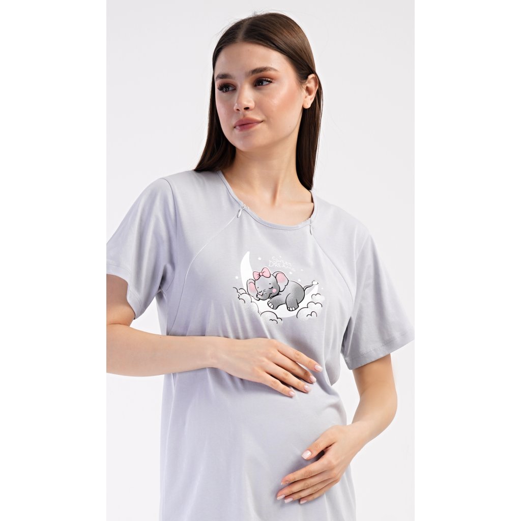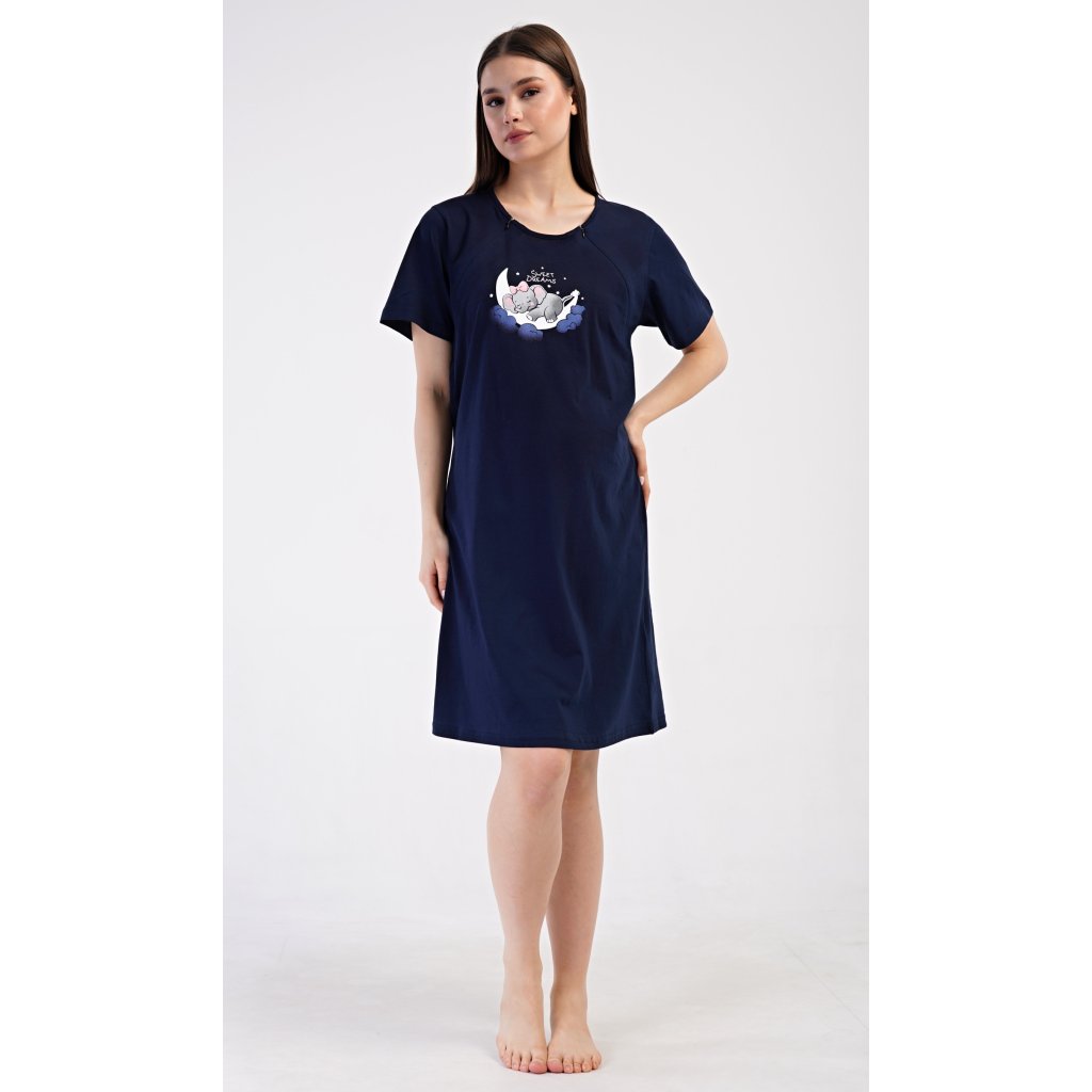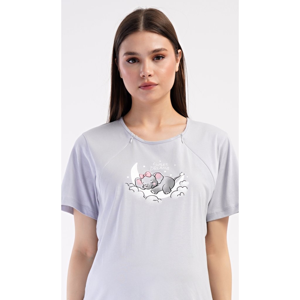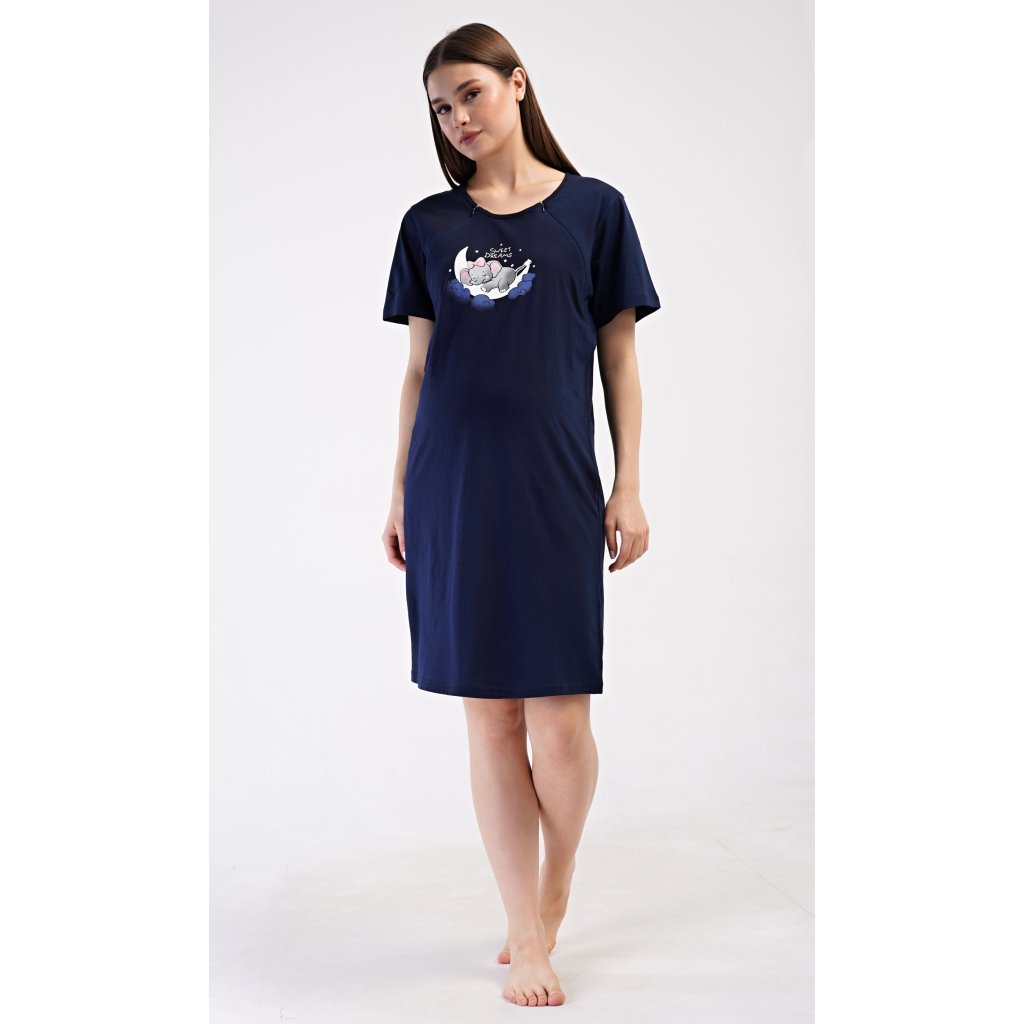 Dámská bavlněná mateřská noční košile Sweet dreams. Noční košile je svým střihem určená na dobu těhotenství, do porodnice i ke kojení. Ke kojení slouží průstřihy po stranách košile, které jsou uzavíratelné na zip. Přední díl košile zdobí obrázek slůněte, které odpočívá na měsíci. Použitý materiál s podílem bavlny 100% je příjemný a poddajný na dotek.