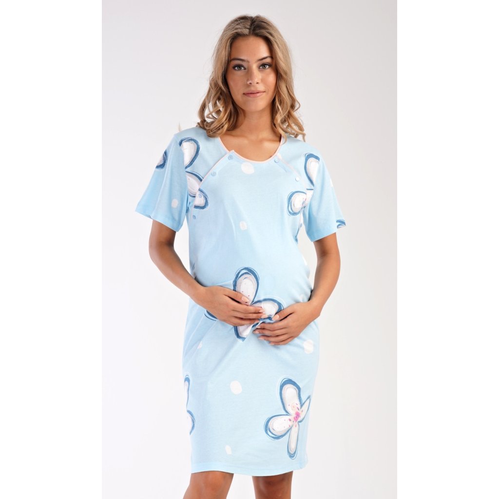 Dámská bavlněná mateřská noční košile Veronika. Noční košile je svým střihem určená na dobu těhotenství, do porodnice i ke kojení. Ke kojení slouží průstřihy po stranách košile, které jsou uzavíratelné na knoflíky. Košile je ozdobena potiskem velkých květů. Použitý materiál s obsahem bavlny 100% je příjemný a poddajný na dotek.