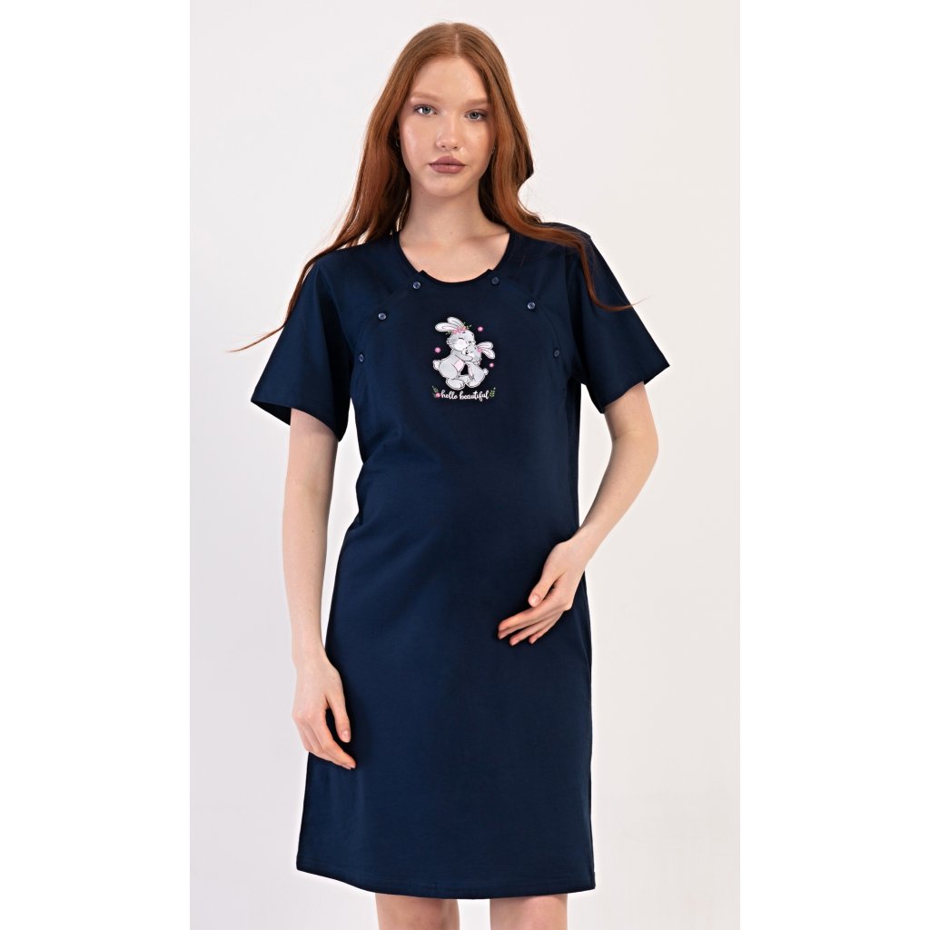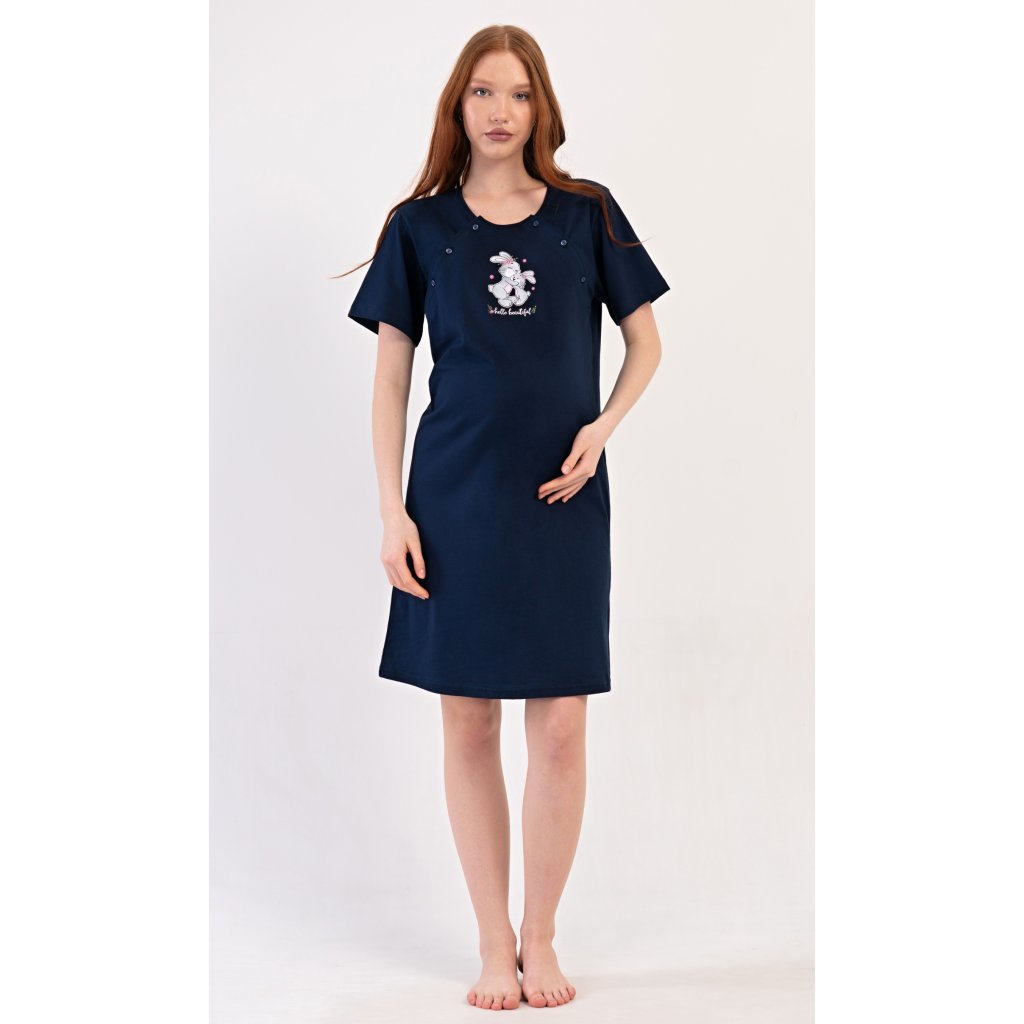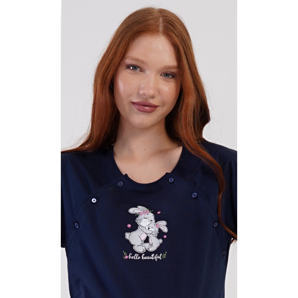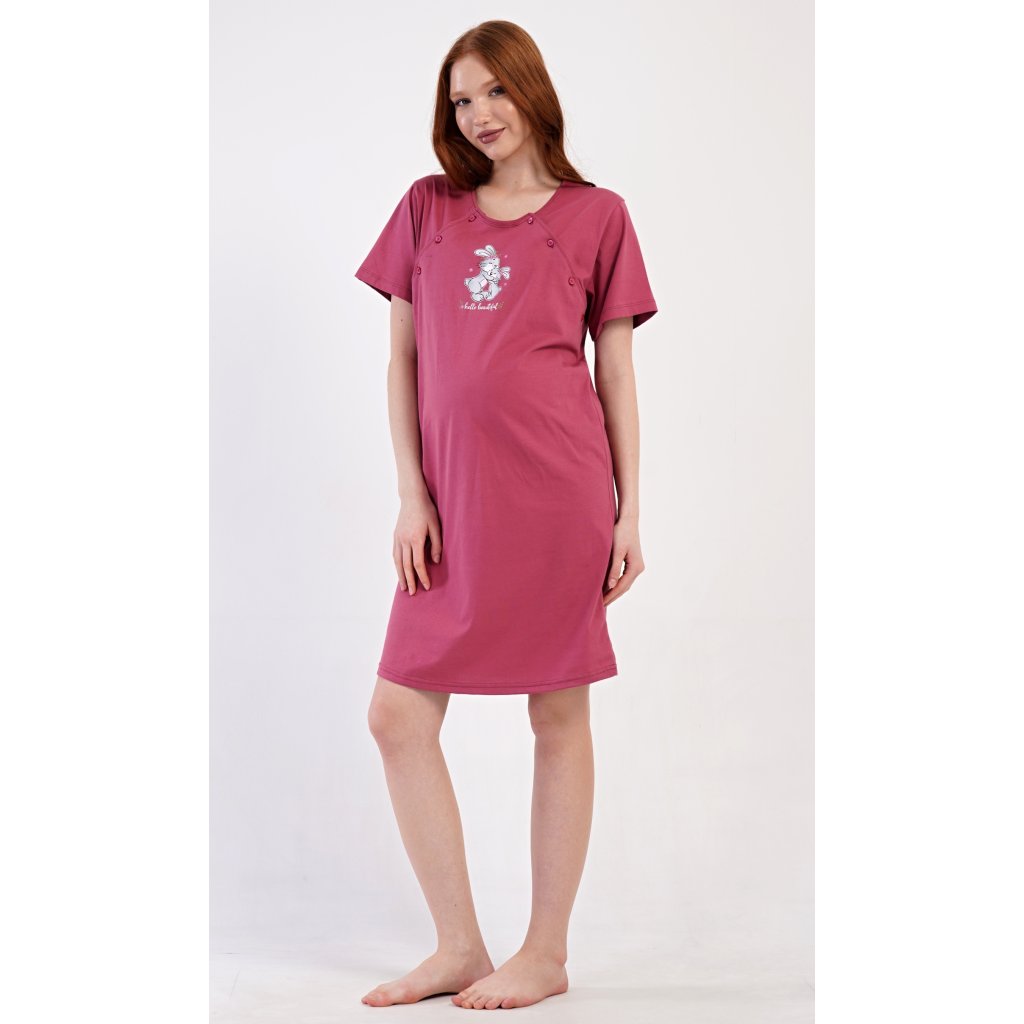 Dámská bavlněná mateřská noční košile Zajíčci. Noční košile je svým střihem určená na dobu těhotenství, do porodnice i ke kojení. Ke kojení slouží průstřihy po stranách košile, které jsou uzavíratelné na knoflíky. Přední díl košile zdobí obrázek veselých zajíčků. Použitý materiál s podílem bavlny 100% je příjemný a poddajný na dotek.