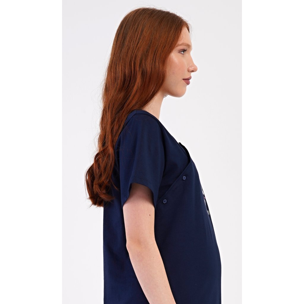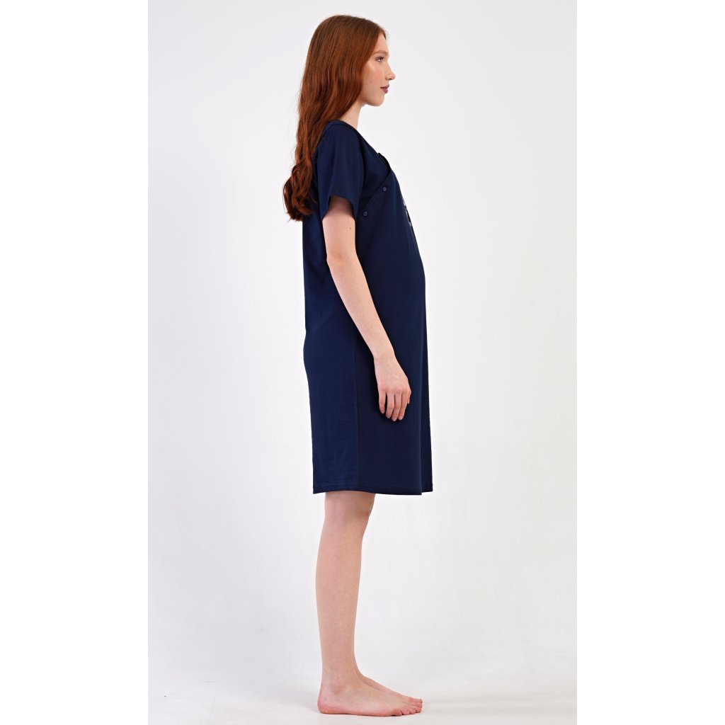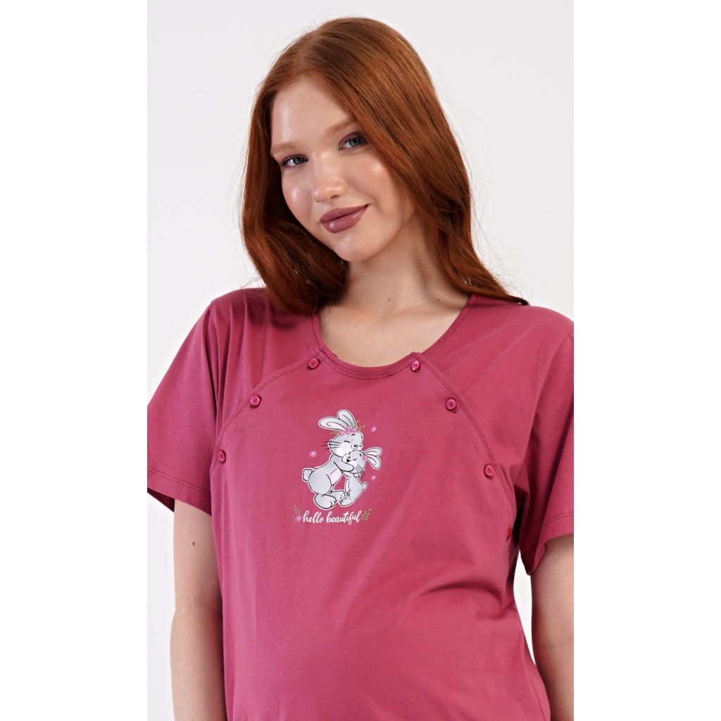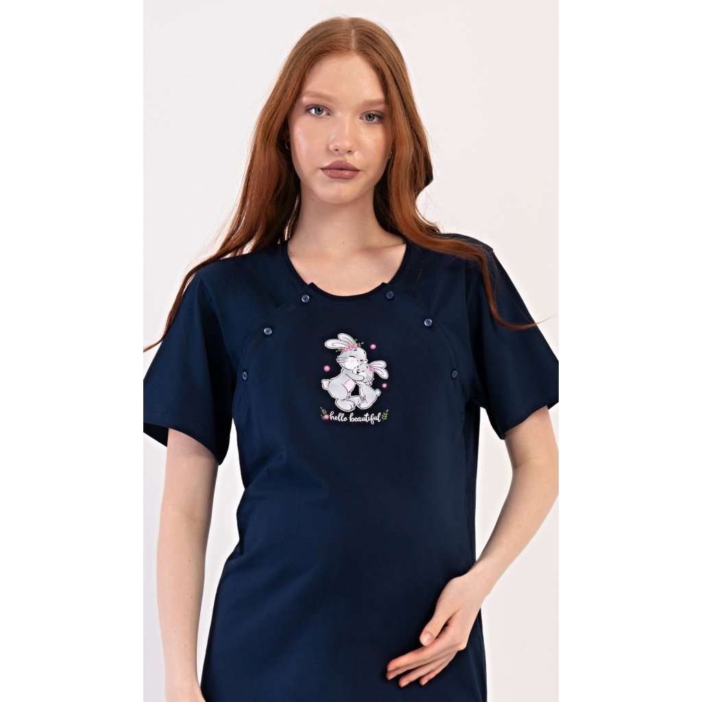 Dámská bavlněná mateřská noční košile Zajíčci. Noční košile je svým střihem určená na dobu těhotenství, do porodnice i ke kojení. Ke kojení slouží průstřihy po stranách košile, které jsou uzavíratelné na knoflíky. Přední díl košile zdobí obrázek veselých zajíčků. Použitý materiál s podílem bavlny 100% je příjemný a poddajný na dotek.