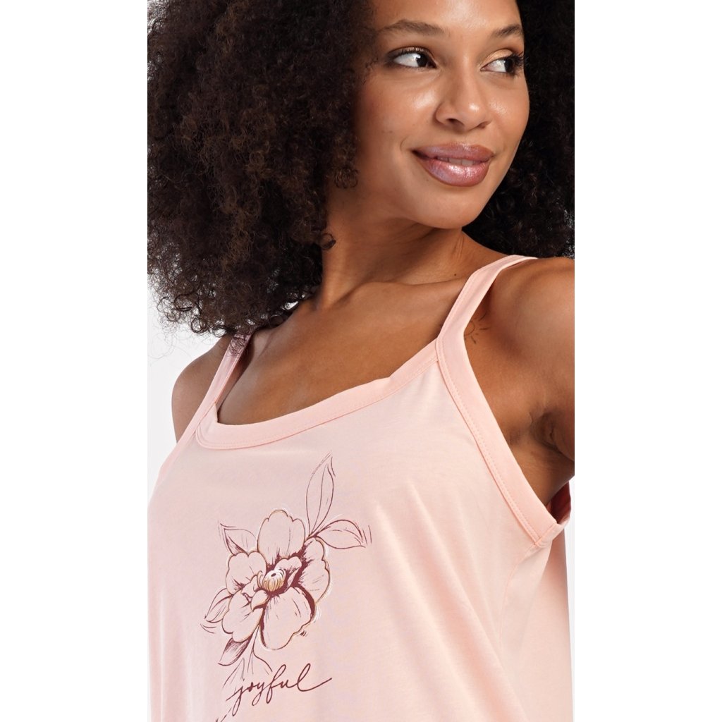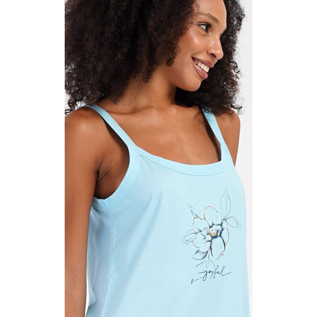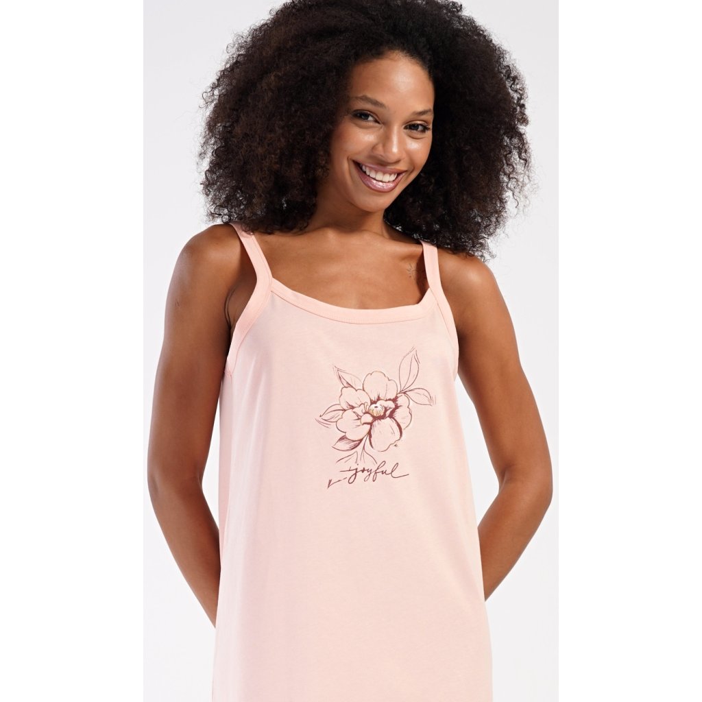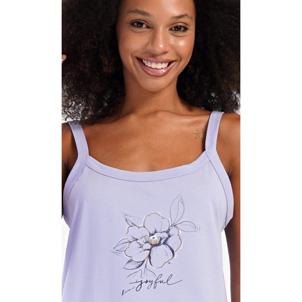 Dámská bavlněná noční košile na ramínka Adriana. Dámskou noční košilku na ramínka zdobí obrázek květu a drobný nápis. Použitý materiál s obsahem bavlny 100% je příjemný a poddajný na dotek.