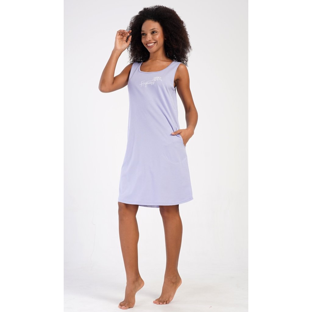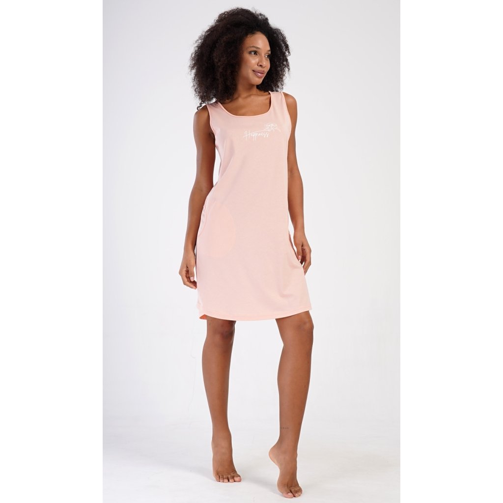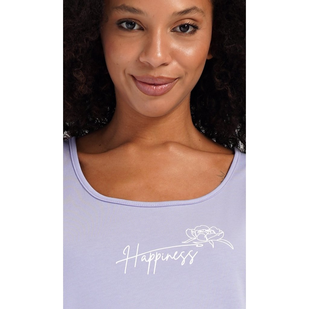 Dámská bavlněná noční košile na ramínka Happiness. Dámskou noční košilku s širšími ramínky a praktickými kapsami zdobí obrázek květu a nápis 'Happiness'. Jistě ji využijete i jako letní šaty nebo pohodlné domácí oblečení. Použitý materiál s obsahem bavlny 100% je příjemný a poddajný na dotek.