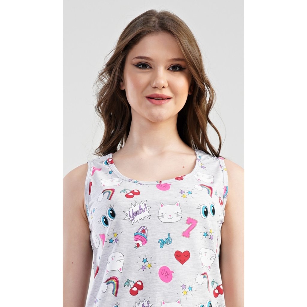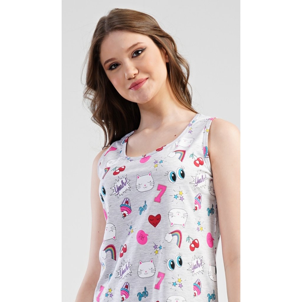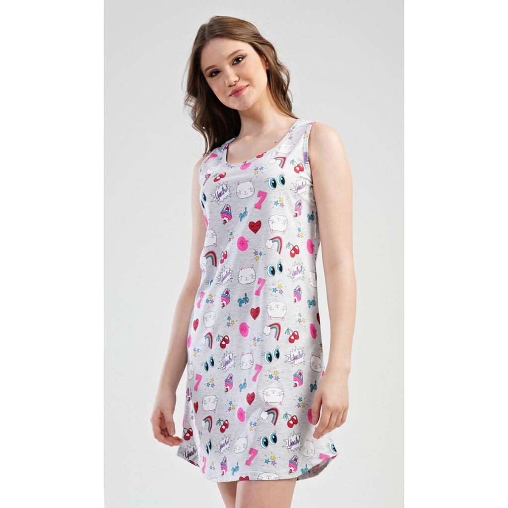 Dámská noční košile na ramínka Kitty. Dámská noční košile na ramínka s vtipnými komiksovými motivy. Použitý materiál je příjemný a poddajný na dotek. Košile je vhodná na i na denní nošení.