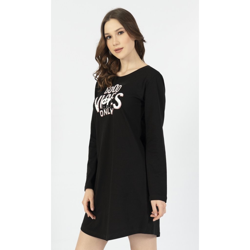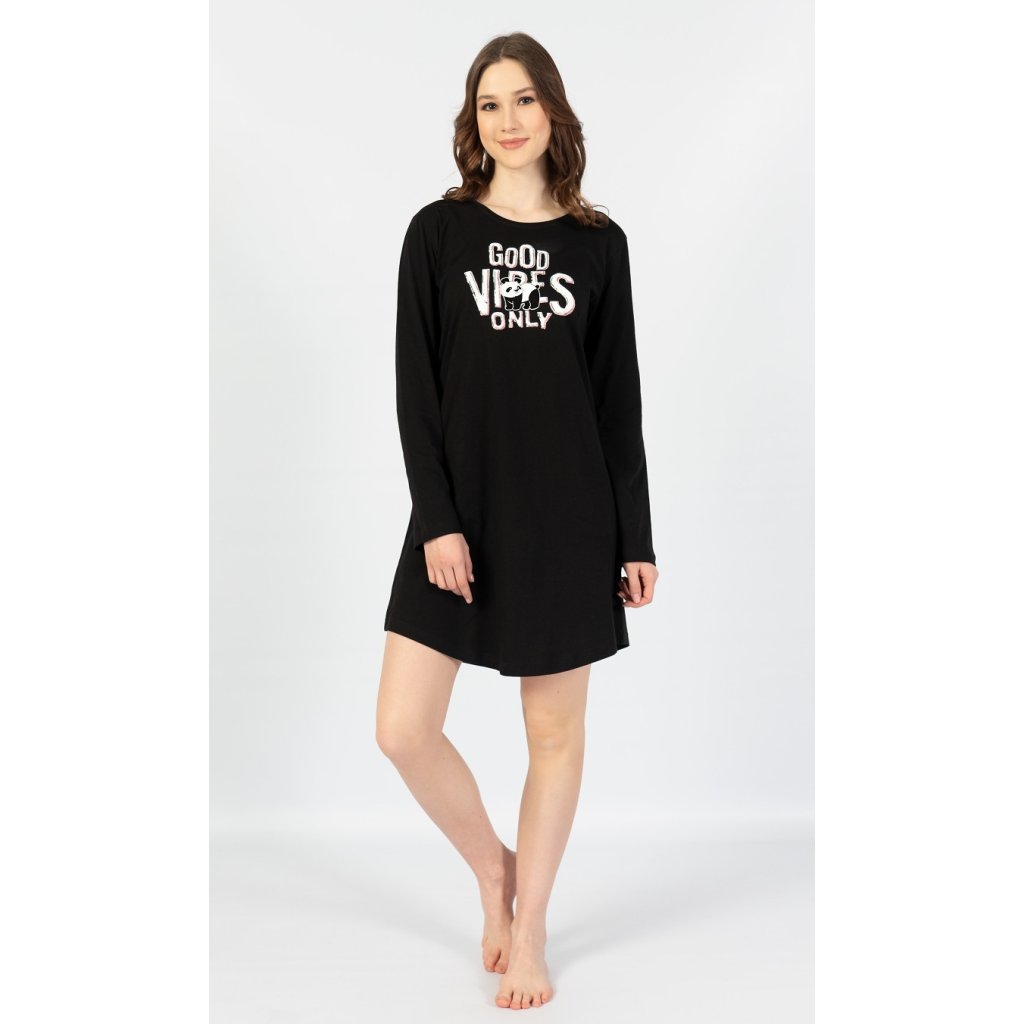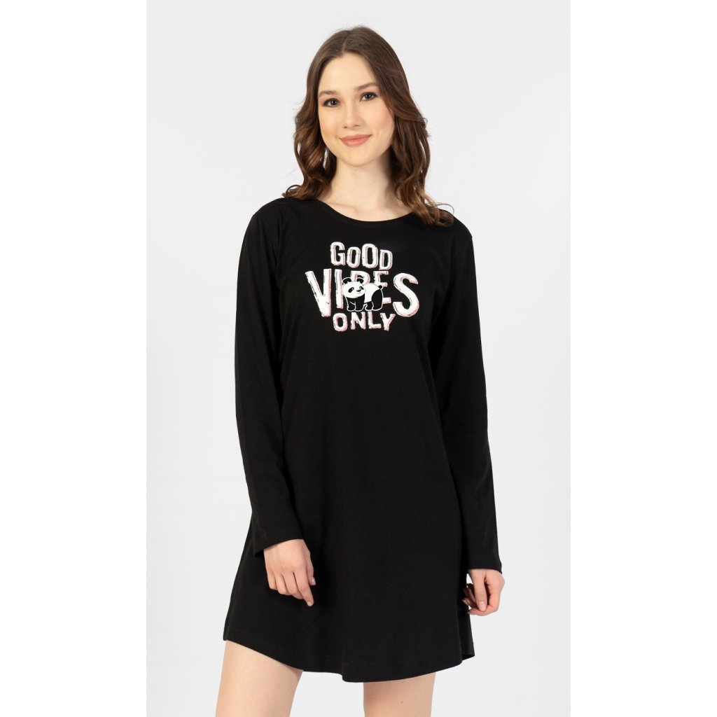 Dámská bavlněná noční košile s dlouhým rukávem Good vibes. Jednobarevná noční košile má na hrudi obrázek pandy a nápis 'Good Vibes only'. Použitý bavlněný materiál je příjemný a poddajný na dotek.