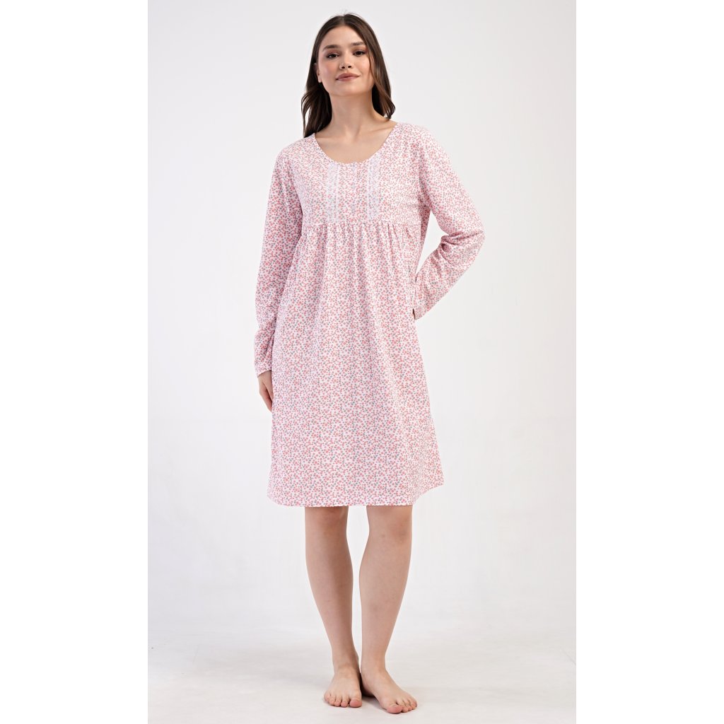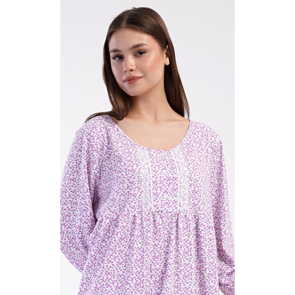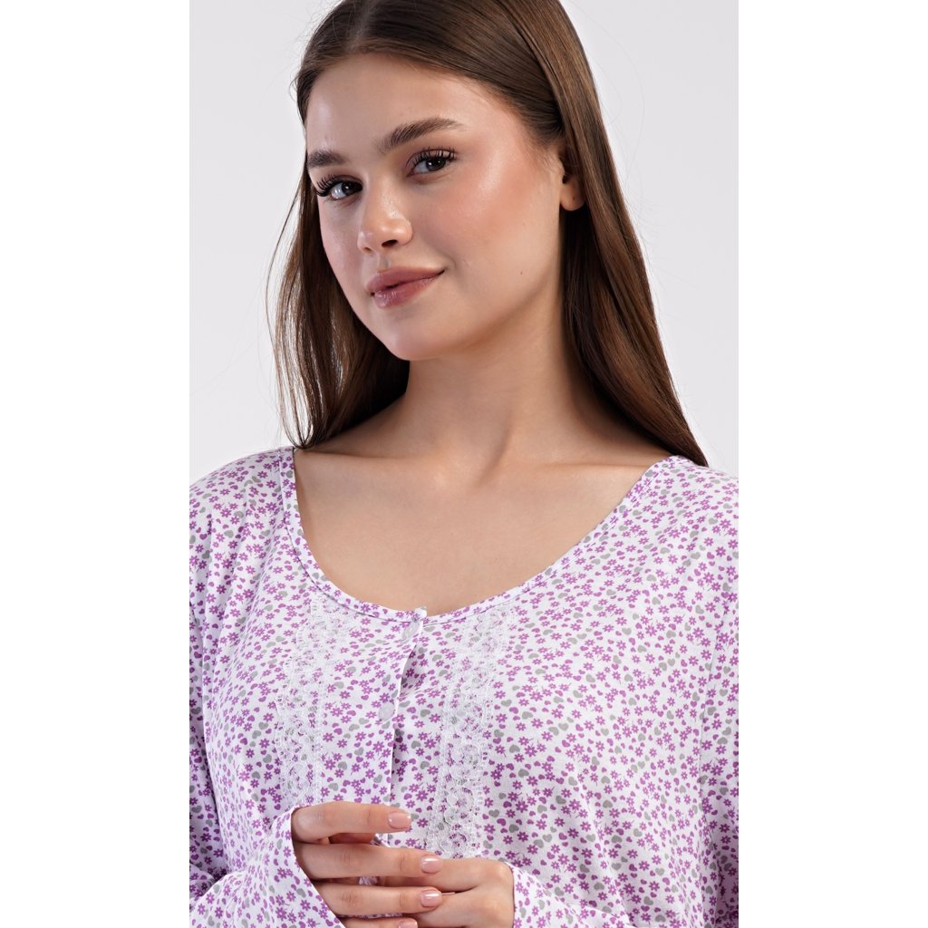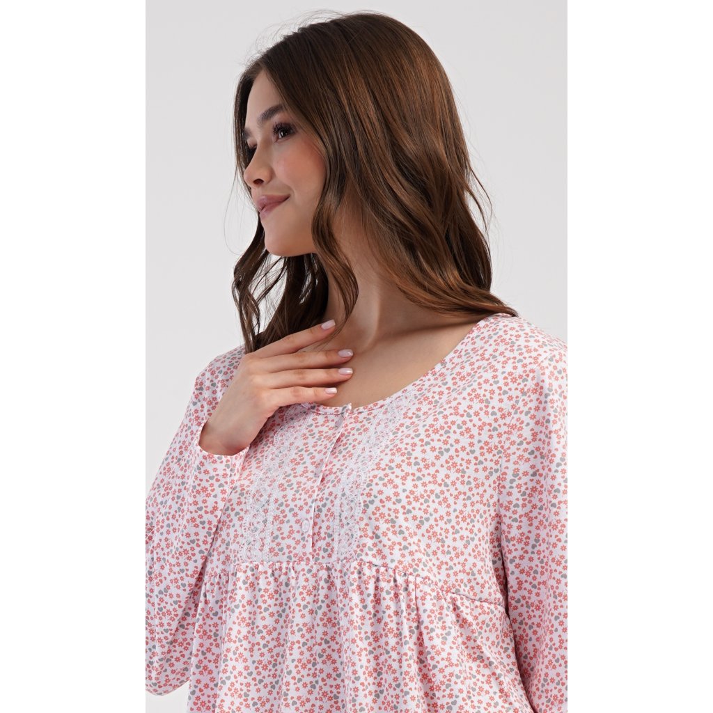 Dámská bavlněná noční košile s dlouhým rukávem Julie. Klasická dámská noční košile pro všechny milovnice starých časů a pohodlí v příjemné délce do půli lýtek. Látka košile je potištěna drobnými květy, ozvláštněna krajkou a krátkou légou se třemi knoflíčky. Použitý materiál s podílem bavlny 100% je příjemný a poddajný na dotek.
