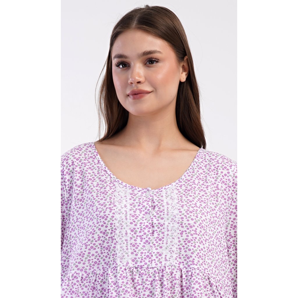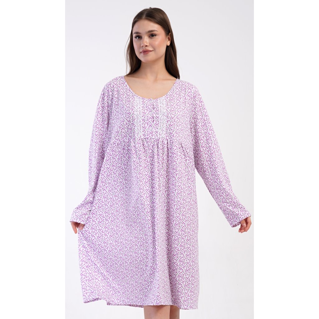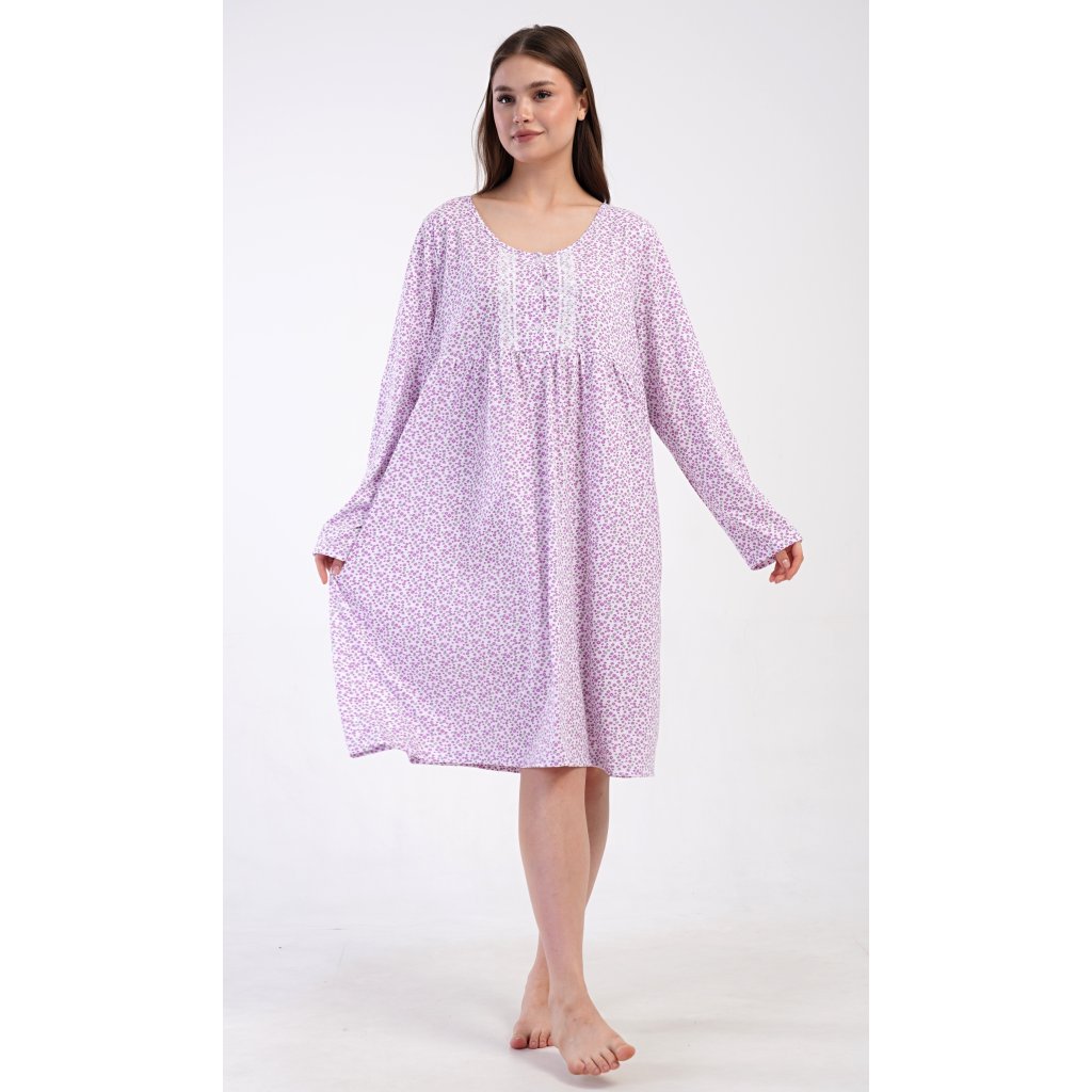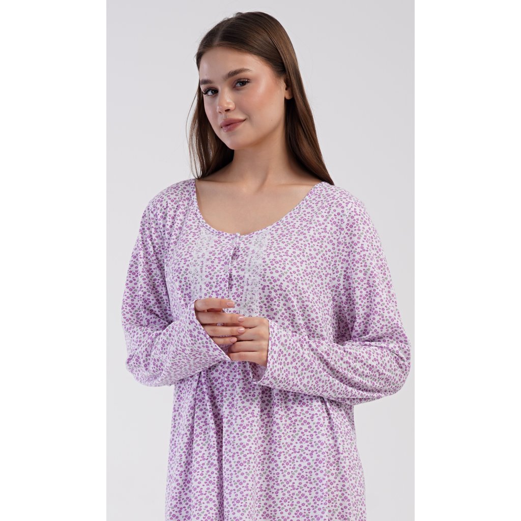 Dámská bavlněná noční košile s dlouhým rukávem Julie. Klasická dámská noční košile pro všechny milovnice starých časů a pohodlí v příjemné délce do půli lýtek. Látka košile je potištěna drobnými květy, ozvláštněna krajkou a krátkou légou se třemi knoflíčky. Použitý materiál s podílem bavlny 100% je příjemný a poddajný na dotek.